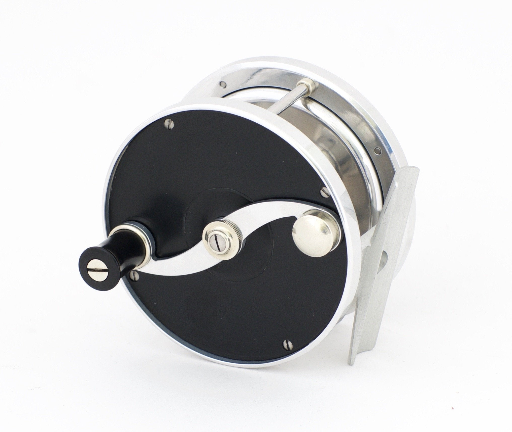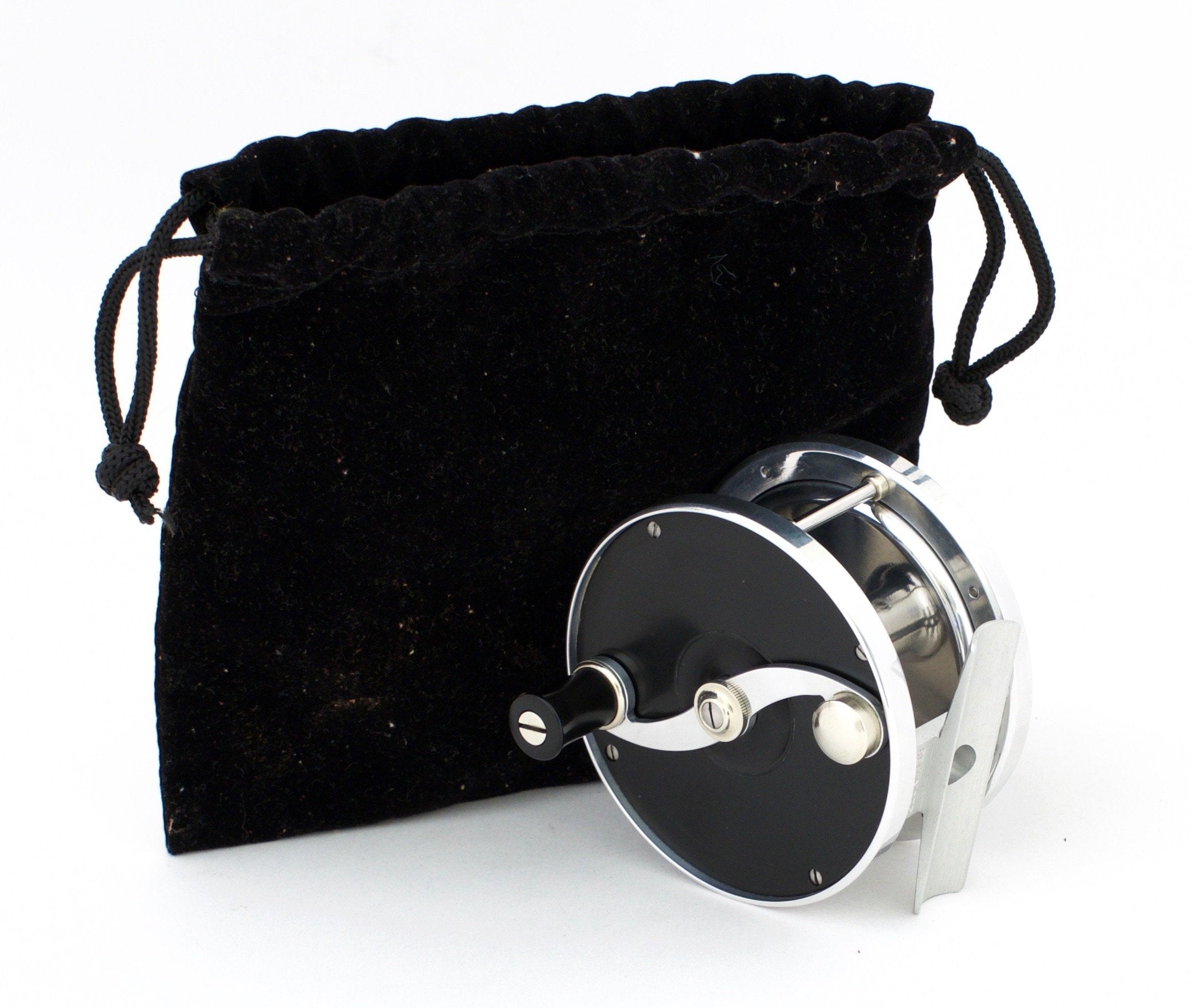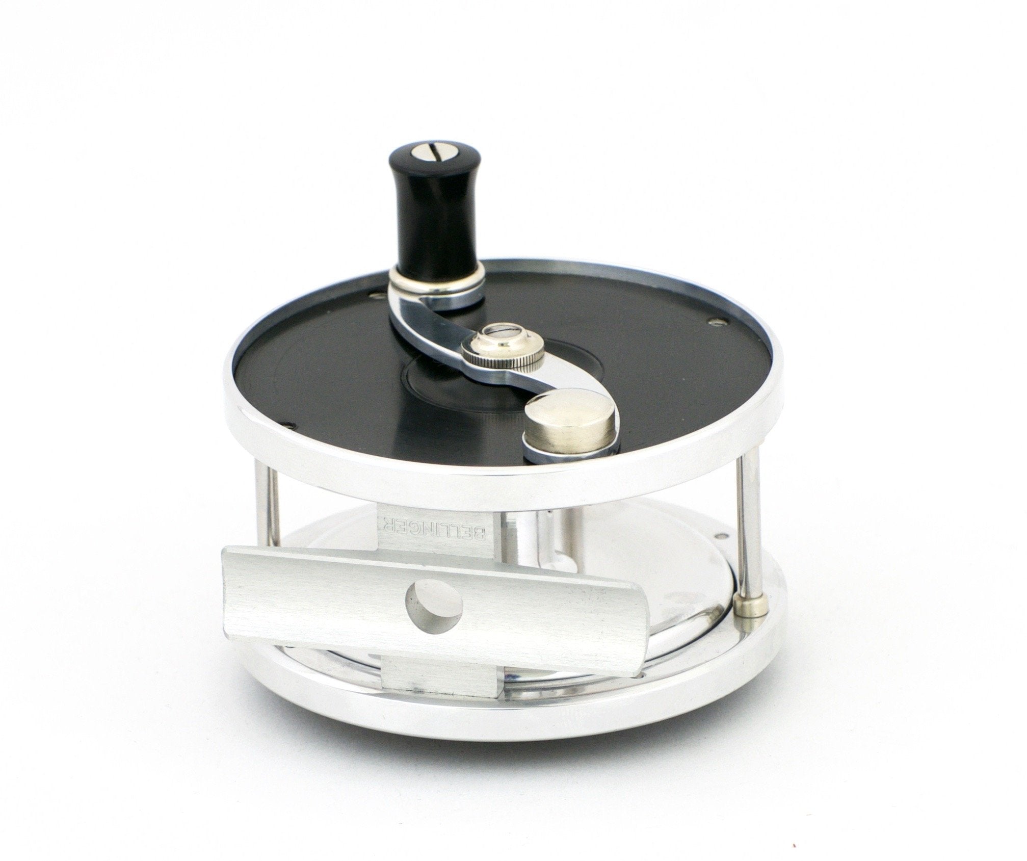 For sale here is a Bellinger 3" Classic fly reel. Left hand retrieve (can be converted to right). This traditional Vom-Hofe style S-handle reel features polished aluminum rims, spool, "S" handle arm, and foot. Stainless pillars and screws. Delrin sideplates. Nickel silver oil cap, handle tub and screw, and counterbalance. Fixed click. Excellent+ condition. Spool width is 7/8" and the reel weighs 5 1/4 oz. Capacity is DT5 + 50 yds. Reel pouch included.
