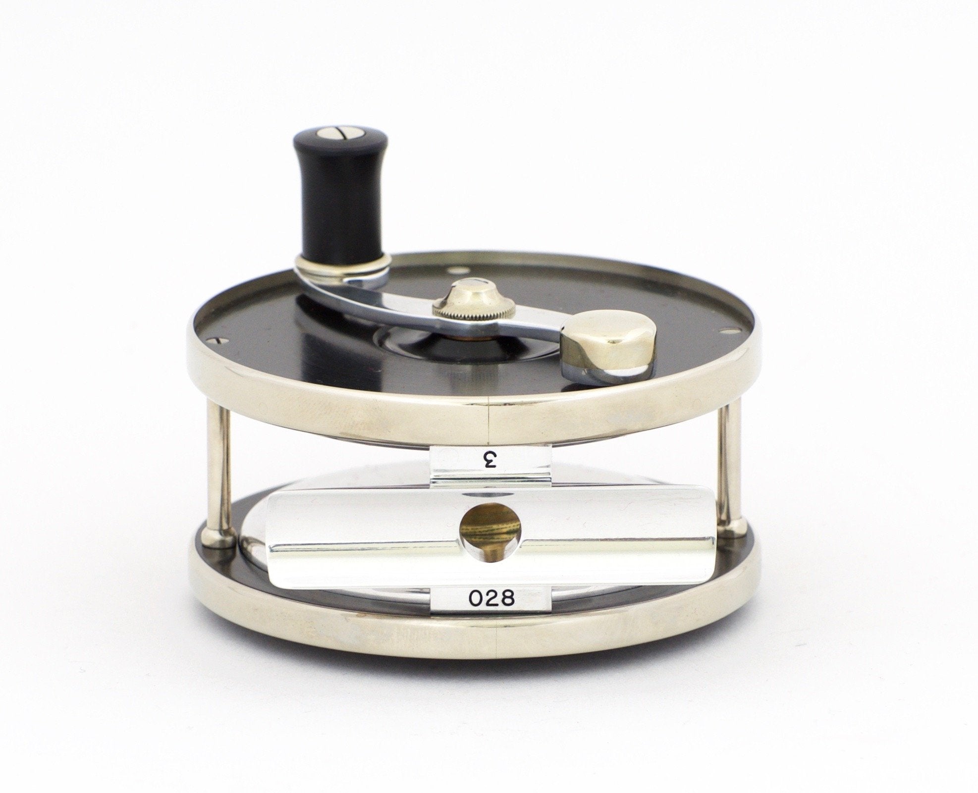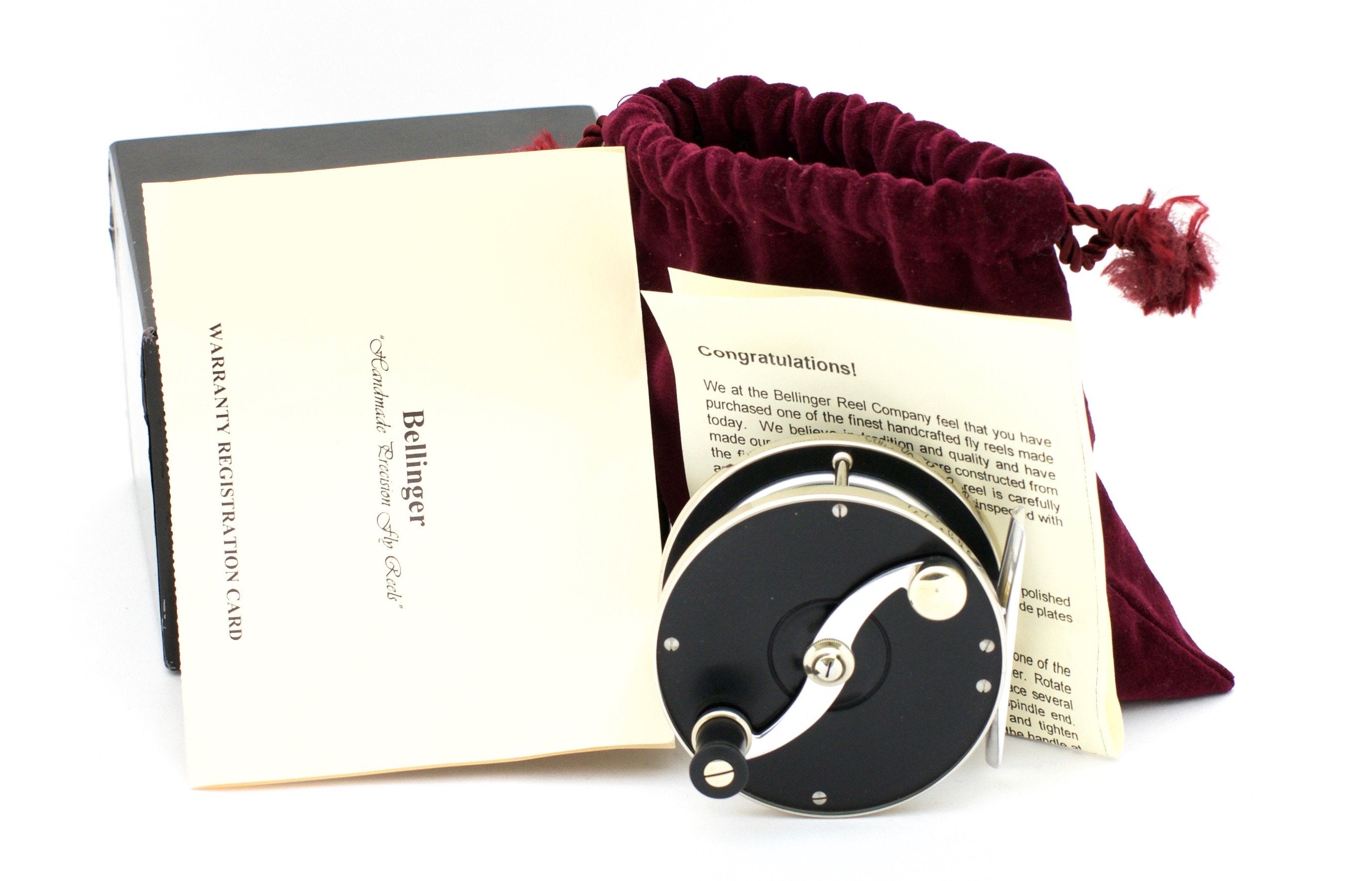 For sale here is a 3" Bellinger/Saracione fly reel in excellent+ condition. Serial #28. Left hand retrieve. These bench-made reels have german silver protective side bands and delrin sideplates. Artfully-bolstered cross-pillars are german silver, as are the counterbalance, winding-arm washer-cup, and knurled oil cap. 3" diameter, 0.90" pillar length, weight 3 1/2 oz. Comes with original box, pouch, and warranty card.