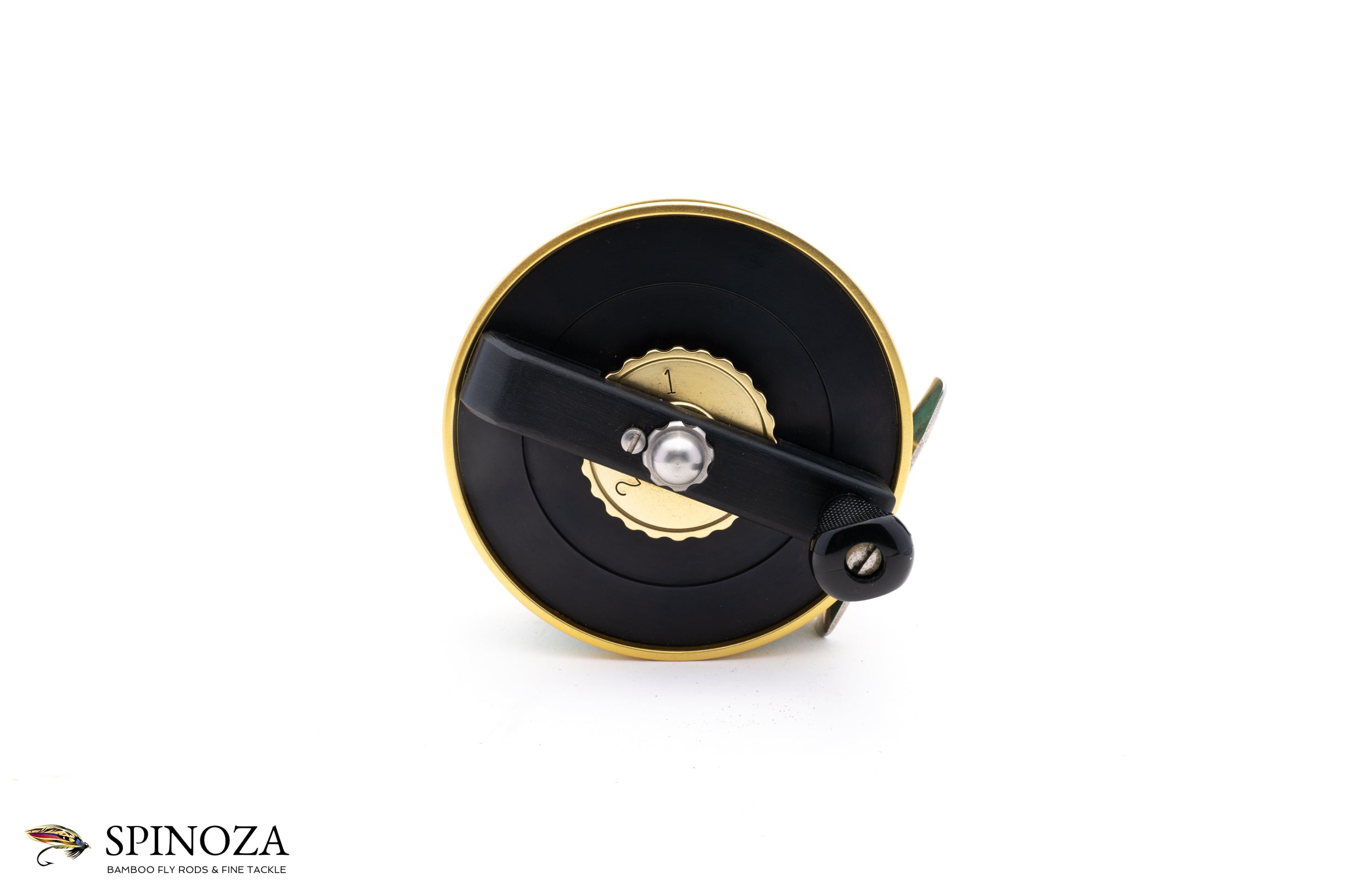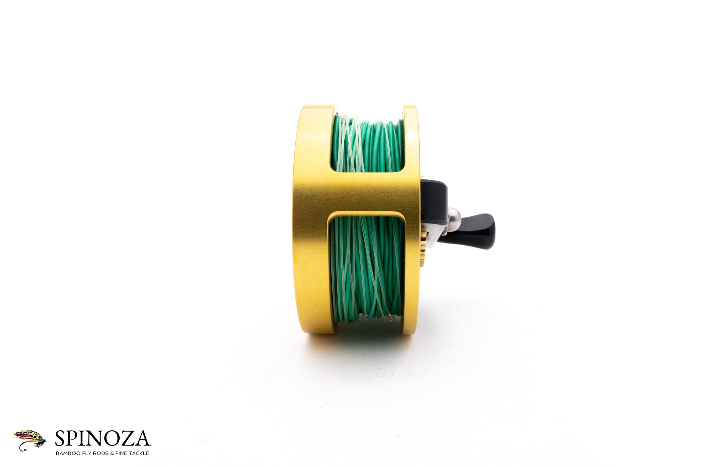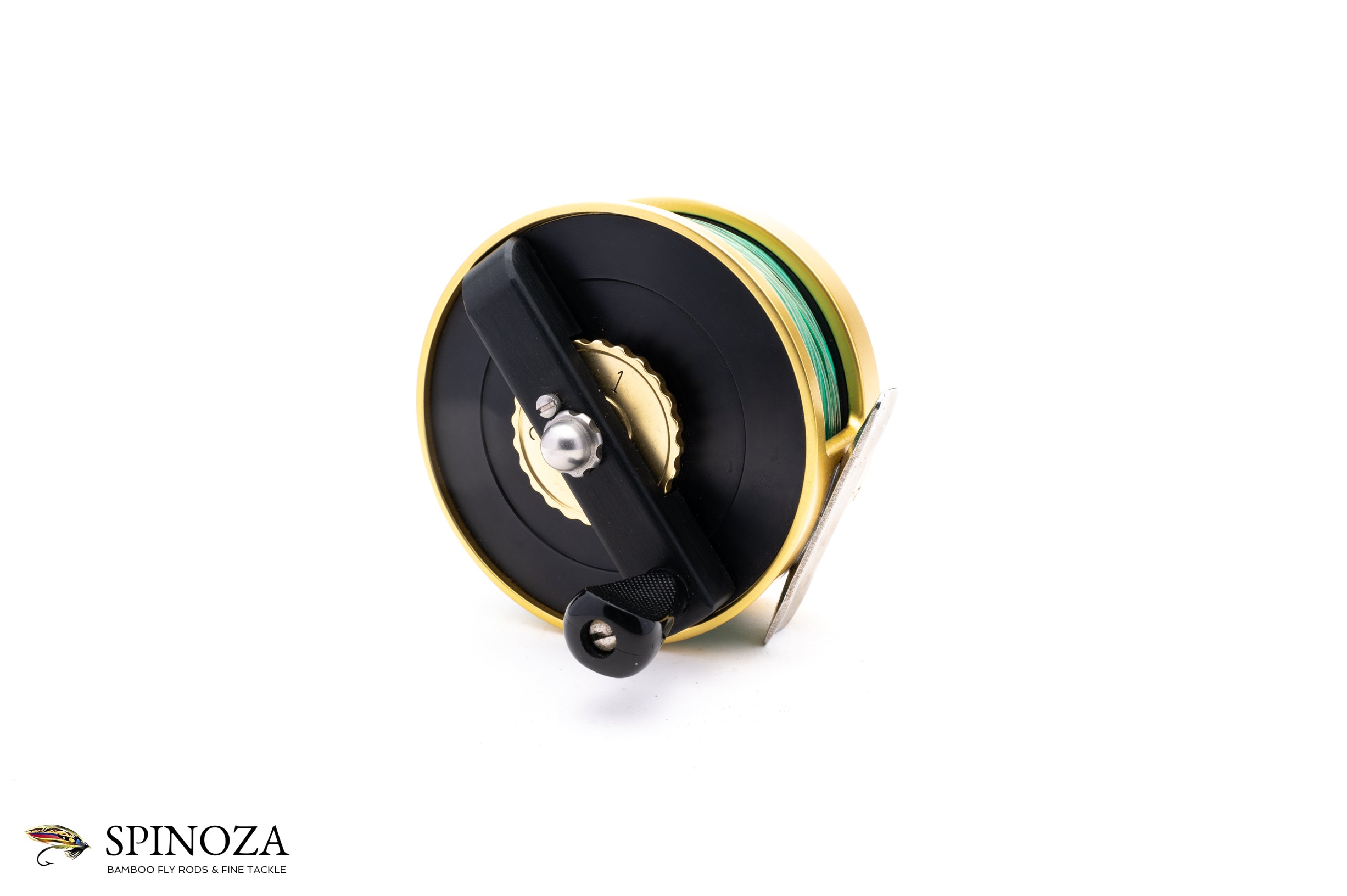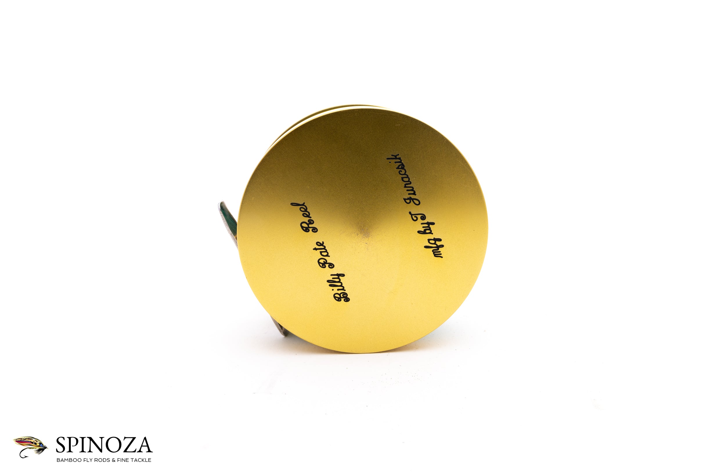 A Billy Pate Anti-Reverse Fly Reel, 3 3/4" diameter and set up for RHW. This is the tarpon size model. Near mint condition with some faint rubbings on the back plate but very clean - it couldn't have been fished much at all. Gold anodized frame with a black spool. "224" is stamped into the frame near the foot. The reel weighs 19.1 ounces with a line loaded on it. Designed to hold a WF8F with 200 yards 20# backing. No bag.