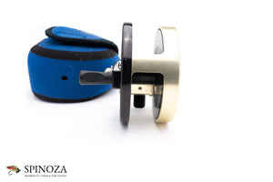 A nice Billy Pate Tarpon Anti-Reverse fly reel, 3 3/4" diameter and set up for LHW. Good used condition with some modest rim rash on the frame edge and light general cosmetic wear throughout, but the reel is in fine shape overall. Classic Anti-Reverse design with a gold anodized frame and black anodized spool. The backplate has the Billy Pate writing in script with the tarpon model noted, along the script noting that the reel was made by Ted Juracsik. It is serial "S799". The reel weighs 11.6 ounces on my scale. Designed to hold a WF12 and 300 yards of backing. Comes with an original blue neoprene case.