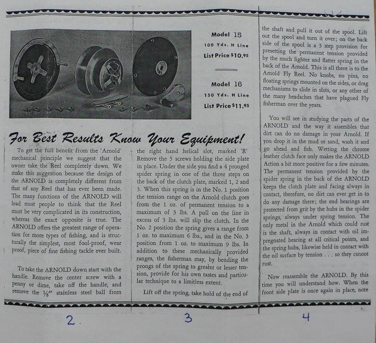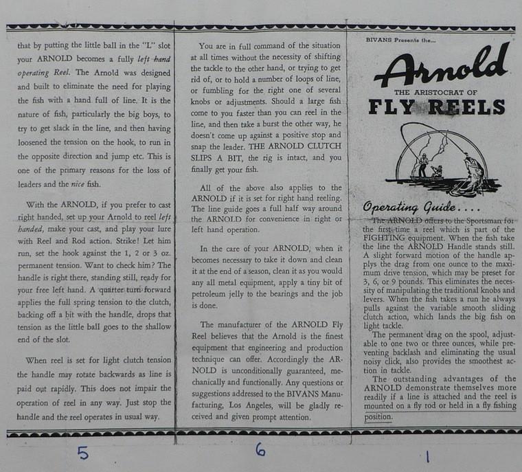 For sale here is a vintage "Arnold" fly reel by Bivans Mfg. Made in Los Angeles, Ca. Produced in the 60's and 70's, the Arnold reel is a neat piece from fly fishing history. The reel is in excellent condition with only minor signs of handling. The Arnold reel features anti-reverse handle, LHW or RHW, and is quite durable. The reel had many capabilities that were fairly advanced for it's day. Included in the pictures are scans of the original manual, these help a great deal in letting the owner understand and appreciate how this classic reel works. Line weight: 5-7wt. Reel weighs 7.30 oz. Diameter 3 1/4"