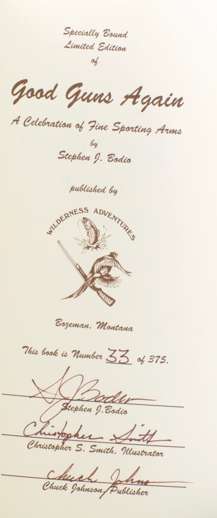 Wilderness Adventures Press, Gallatin Gateway MT, 1994. Hardcover. Book Condition: Fine. Smith, Christopher (illustrator). First Edition. No. 33 of 375 copies Size: 8vo - over 7¾" - 9¾" tall. Signed by Author, Illustrator, and Publisher. Limited Edition.