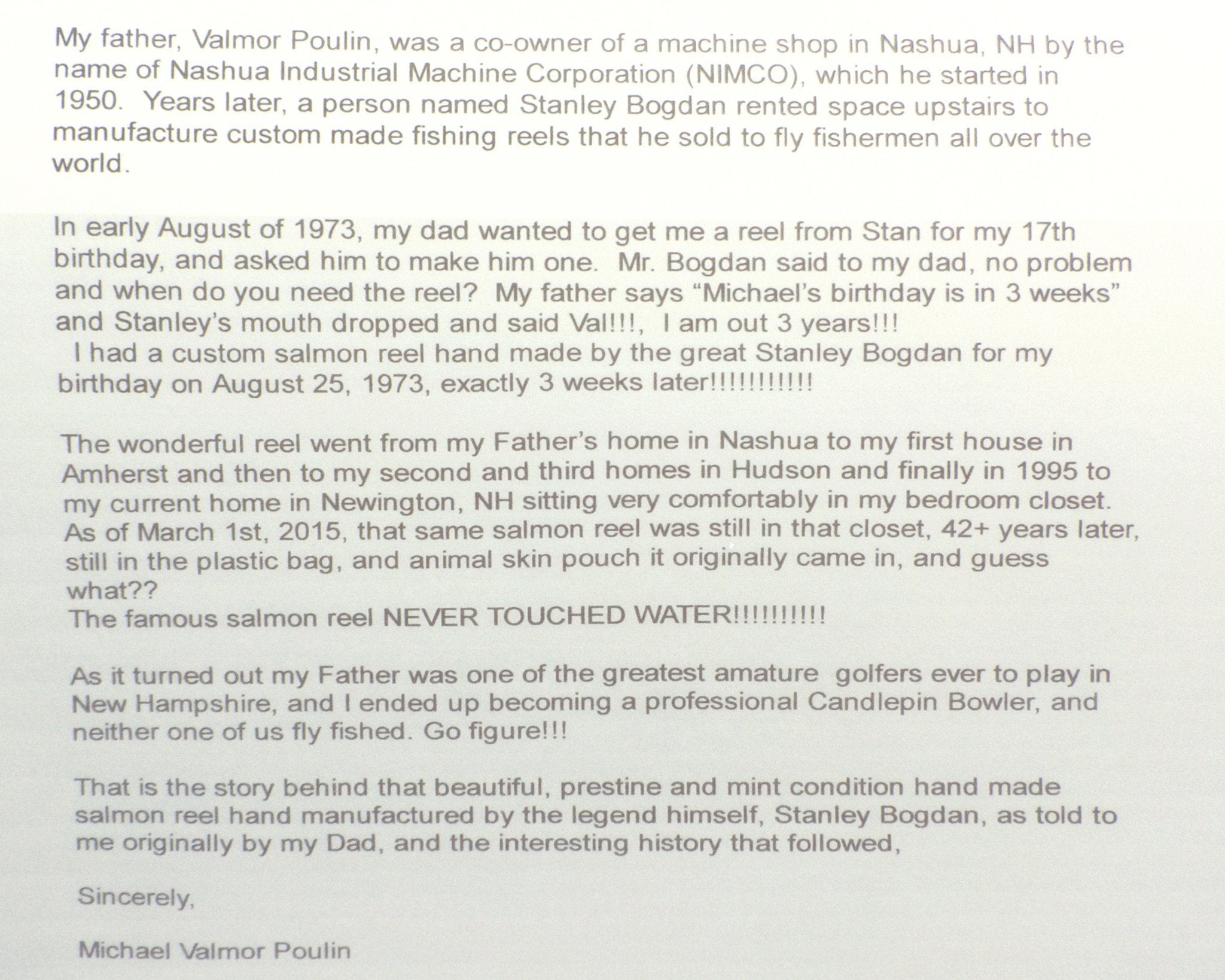 For sale here is a perfect Bogdan Model 0 fly reel in mint, unlined condition. Right-hand retrieve.Comes with original suede bag (with plastic bag), hang tag with Stan's writing, and a copy of the provenance letter from the original owner's son.