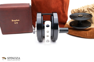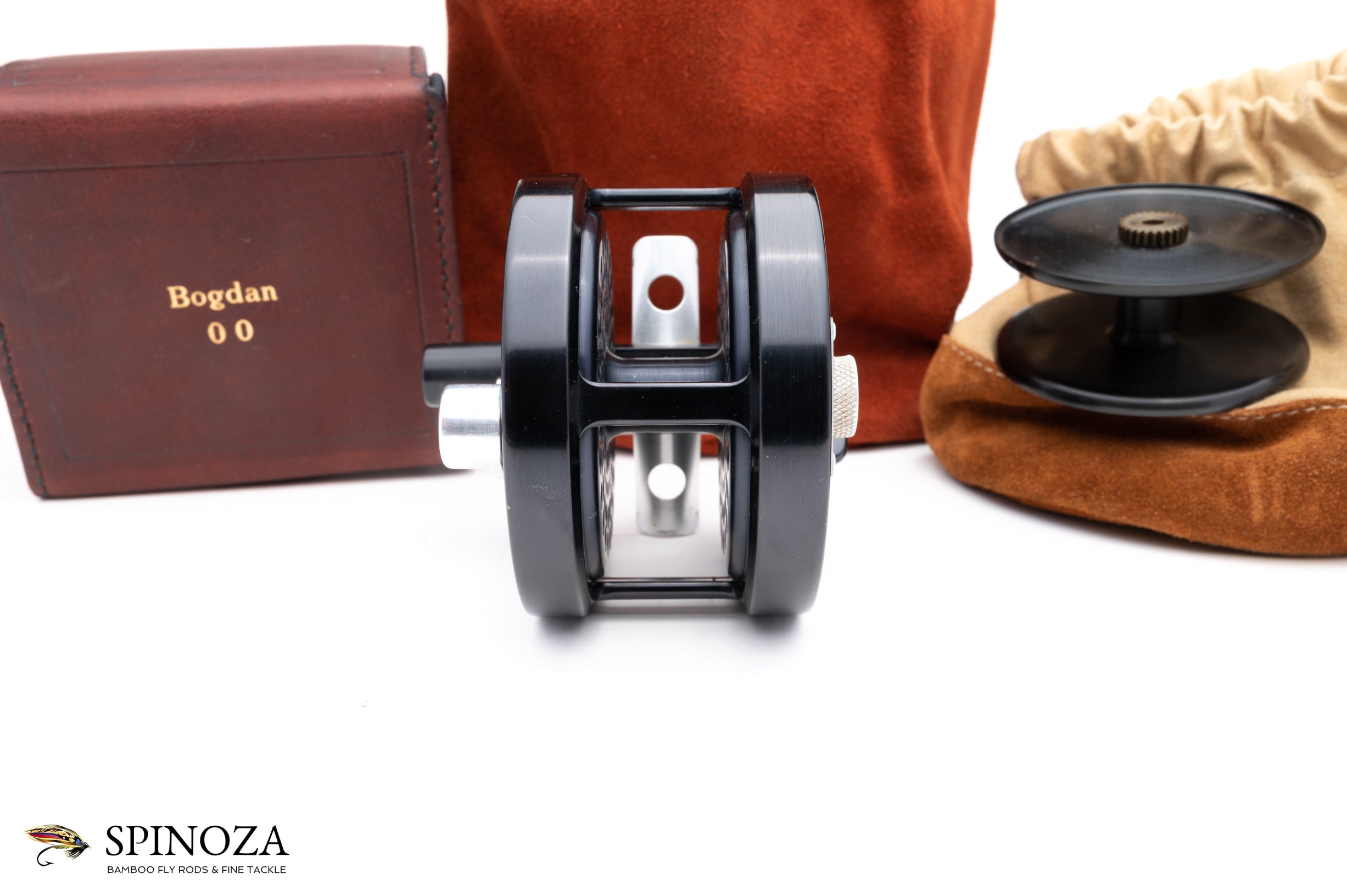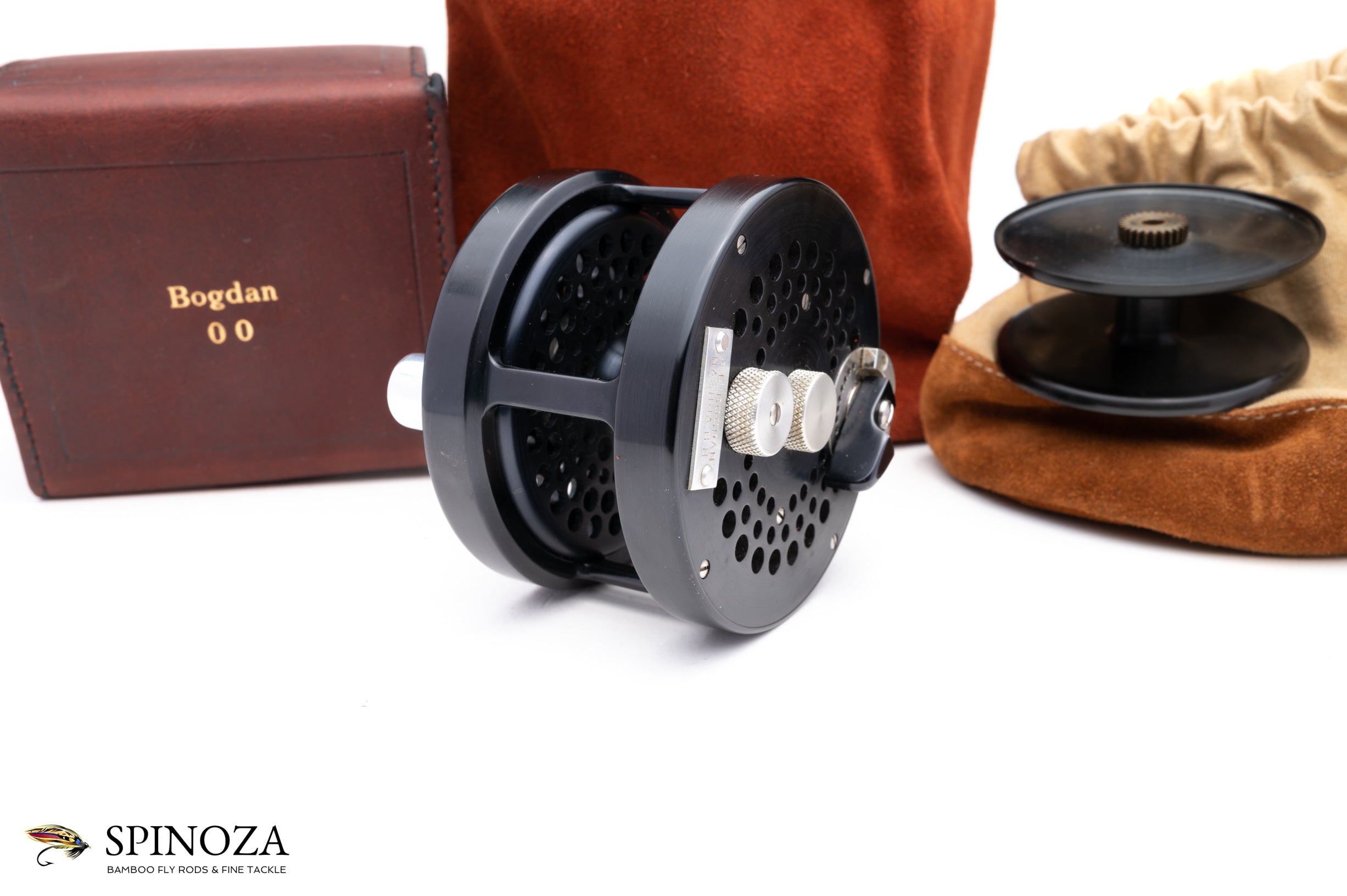 A nice Bogdan 00 "Grilse" fly reel with a spare spool, 3 1/4" diameter and set up for RHW. 1" spool width and weighs 9.5 oz on my scale. Excellent used condition with tiny rim rash to the frame edges, some marks around the takeapart screws, and some tiny mounting marks to the foot. Very clean overall. Ventilated design with the sideplates and spool both ventilated throughout (the spare spool is non ventilated). Black anodized frame, sideplates, and spool with clear anodized foot, serpentine crank, oil port cover, poacher's knob, and nameplate. A great model for single handed salmon rods, as it is the smallest salmon reel that Stan made that has the fantastic double brake drag system. 2:1 multiplying retrieve. This reel comes packed in an original brown leather drawstring bag and the spare spool comes in a non-original T&T suede-and-canvas bag. The reel also comes with a stunning mint Arne Mason case that has "Bogdan 00" tastefully embossed in the top. One of my favorite Bogdan models and the one I often reach for to pair with single handed salmon rods.