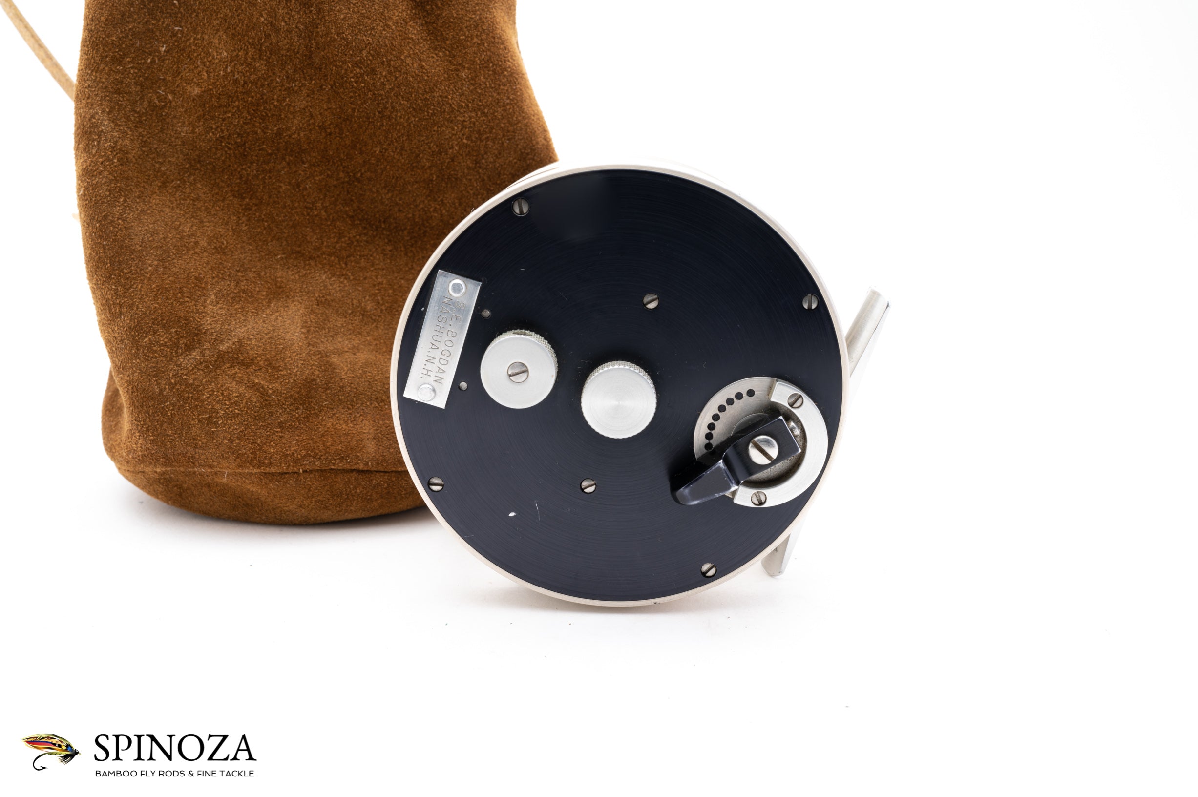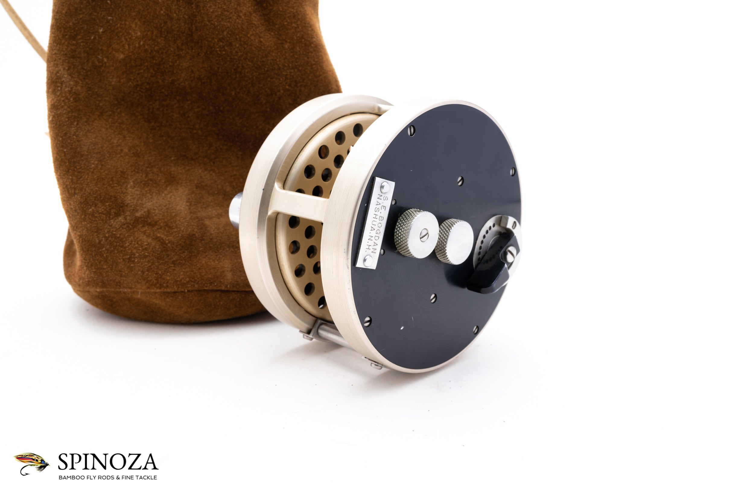 An unusual Bogdan "Rings Up" Salmon reel, 3 1/2" diameter and set up for RHW. This reel appears to be based off the model 50 and has a single action retrieve with a ported spool and front plate. Notably, it has a stainless steel line guide where the third pillar would normally be, which I have seen on only three other Bogdans. This rectangular guide was clearly not an "add on" and is placed in such a way that it allows one to fish in the classic style known as "rings up". There is no model number on the foot, which also suggests that this was a custom reel that Stan built for what I imagine to have been a valued customer (Stan built very few truly custom models outside of his normal catalog). There are some mounting marks on the foot, a few tiny marks on the rims, a small amount of rubbing on the anodizing on the drag adjuster, and a small mark or two on the backplate. These are all quite minor, however, and I would rate this unusual reel as excellent condition overall. The frame is a very light champagne color and the sideplates are the usual black anodized. The foot, crank, oil port, poacher's knob, and Bogdan nameplate are all the usual silver. Comes with what appears to be an original bag. A very unusual Bogdan that would make a great addition for a collector who has all of the normal cataloged reels.