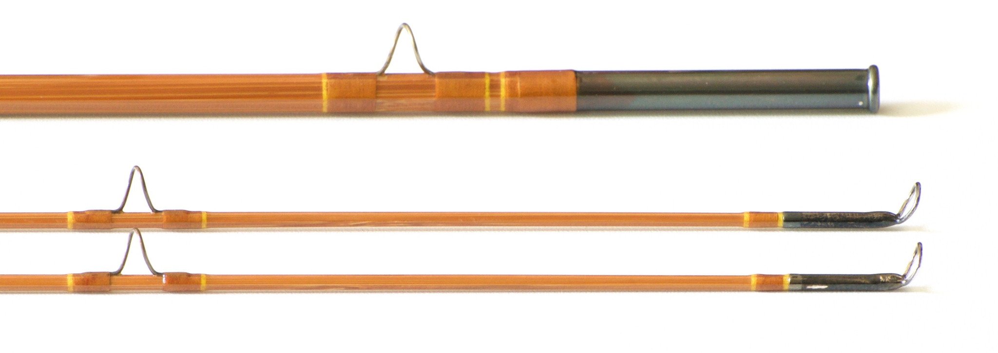 For sale here is a rarely seen John Bradford Legacy III bamboo rod. 7 feet 9 inches for 5 weight line. Serial number 1751. The rod is in near mint condition having only been lawn cast. The only thing preventing it from being mint is a tiny amount of bluing loss to one tip top. The rod has darkly oxidized hardware, attractive knurling on the pocketed cap and ring. Golden brown windings with yellow edges and four signature wraps on the butt section. Medium fast action - a great casting rod! Comes with ferrule plug, original bag and original labeled tube. The rod weighs 4 3/8 oz. and the ferrules are size 12/64 with an excellent fit.