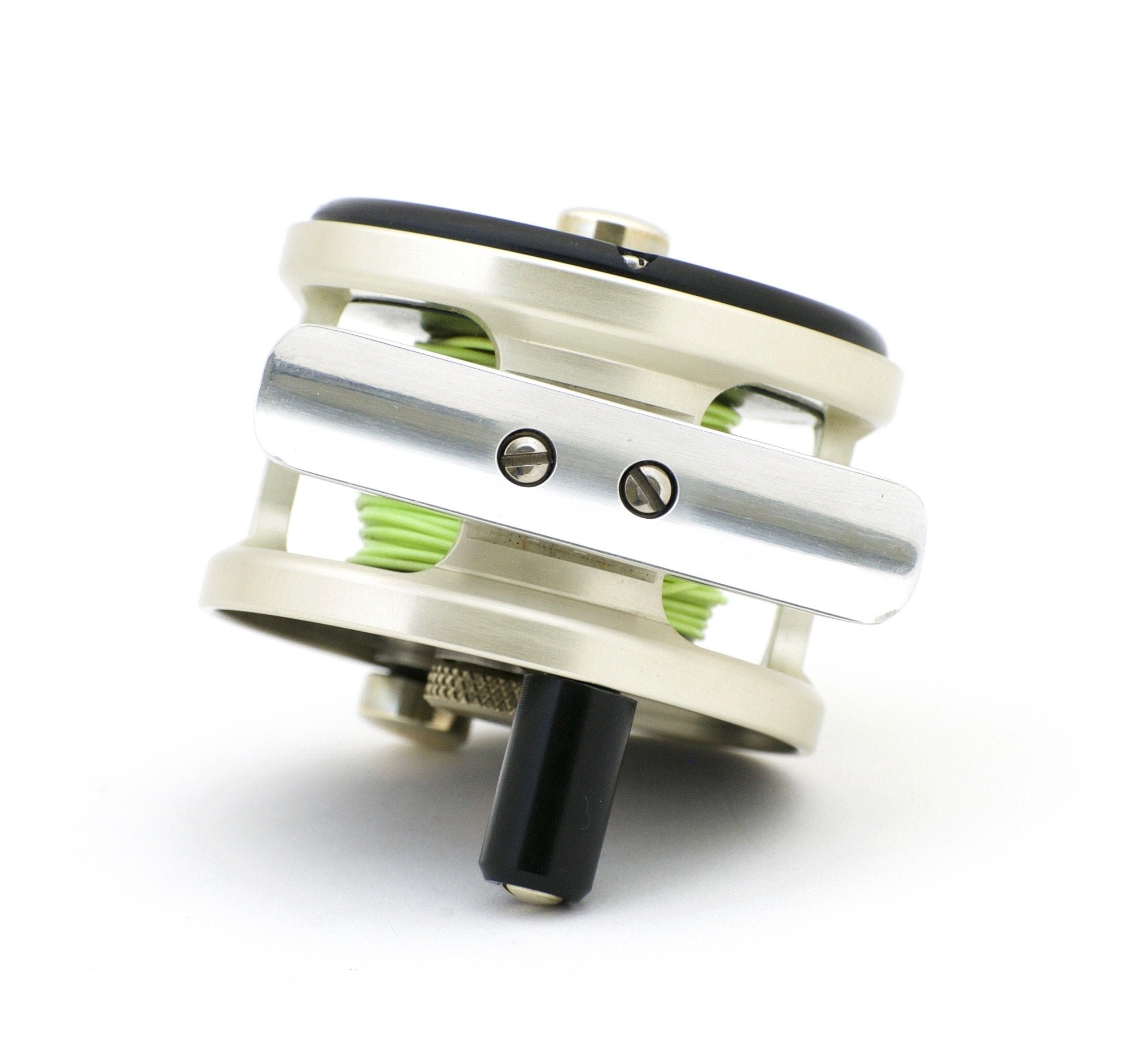 For sale here is a Richard Bradley 2 1/4" fly reel in mint condition. Rare small size for a 2-3 weight line. Weight 4.20 oz. Spool width 7/8". The cog/gear on this reel and other Bradley reels has 48 teeth! The "pawl" in Bradley reels is a simple ball bearing, thus the need for more teeth than a usual gear in a standard click/pawl reel. The reel can be used right or left hand retrieve because there is equal "click" tension both ways.