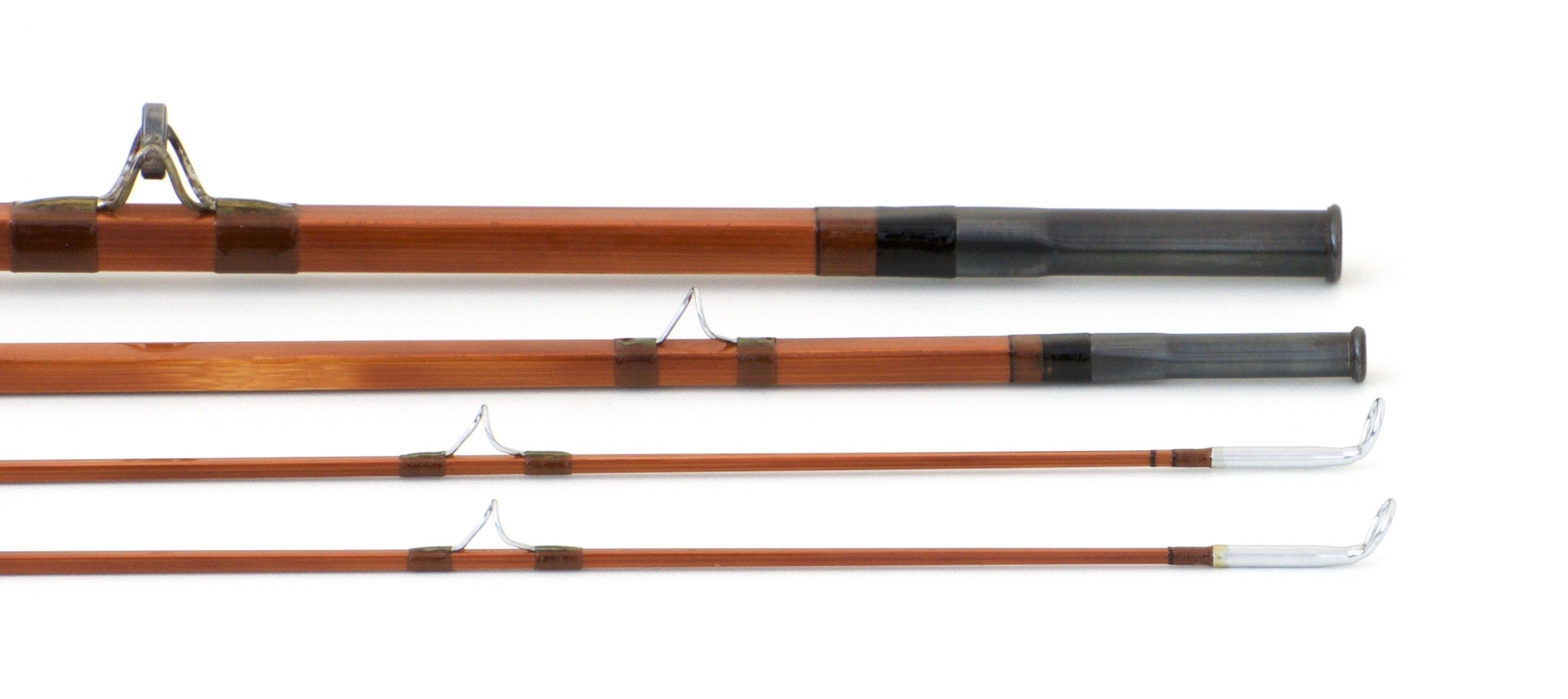 For sale here is a Per Brandin Model 866-3 DF hollowbuilt quad bamboo rod made in 1997. 8'6" in length with three sections and two tips. 4 1/2 oz. Made for a DT6 or WF7. Beautiful dark cane. Translucent olive silks with black tipping at the winding check, ferrules, and tip tops. Modified wells grip (slightly soiled) with oxidized dark nickel silver slide band and butt cap. Walnut spacer. Oxidized dark nickel silver Swiss-style truncated ferrules. Excellent plus overall condition. Minor marks on the reel seat spacer (not deep dents) and a few light marks in the varnish. Great ferrule fit and a cannon of a rod! Comes with its original bag and labeled tube.