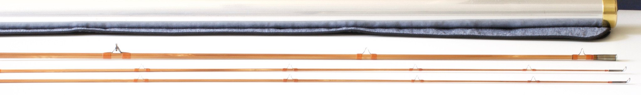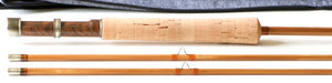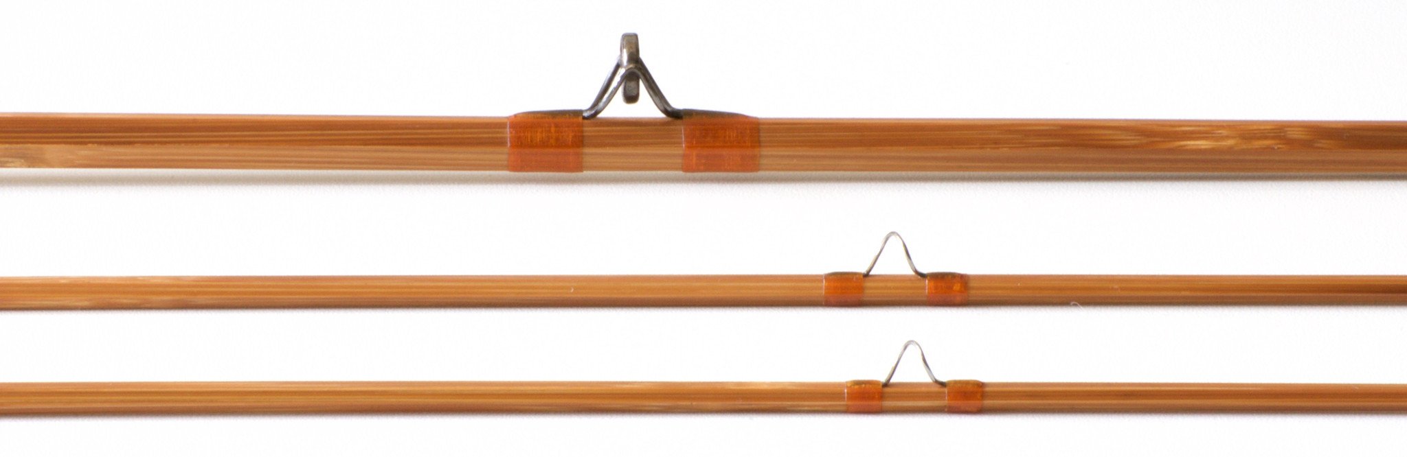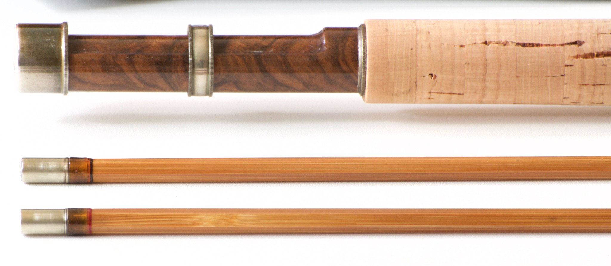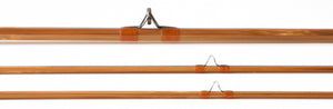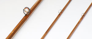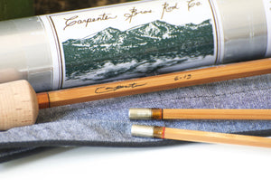 For sale here is a very nice hollow-built rod by Cris Carpenter, an 8'4" 2/2 3-4wt bamboo rod weighing in at 3.60 ounces. Made in 2013. Six-sided construction. Excellent condition. Honey colored silks with black tipping at the ferrules, tip-tops, and winding check. Matte/oil finish. Blued hardware, a bit worn in places. Agate stripping guide. Cap and ring reel seat over rosewood spacer. "Carpenter" is engraved into the bottom of the butt cap. Super-Z style micro ferrules size 13/64, the fit is great. The action is on the medium side of medium-fast, flexing the entire length of the rod yet with plenty of backbone. Original bag and tube.