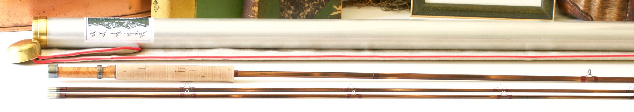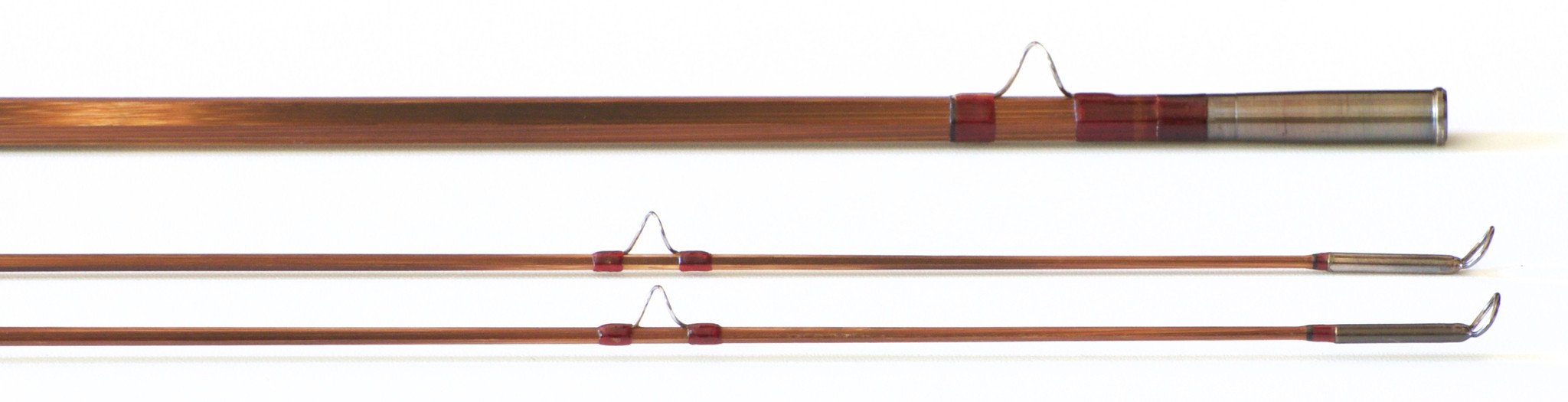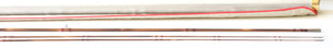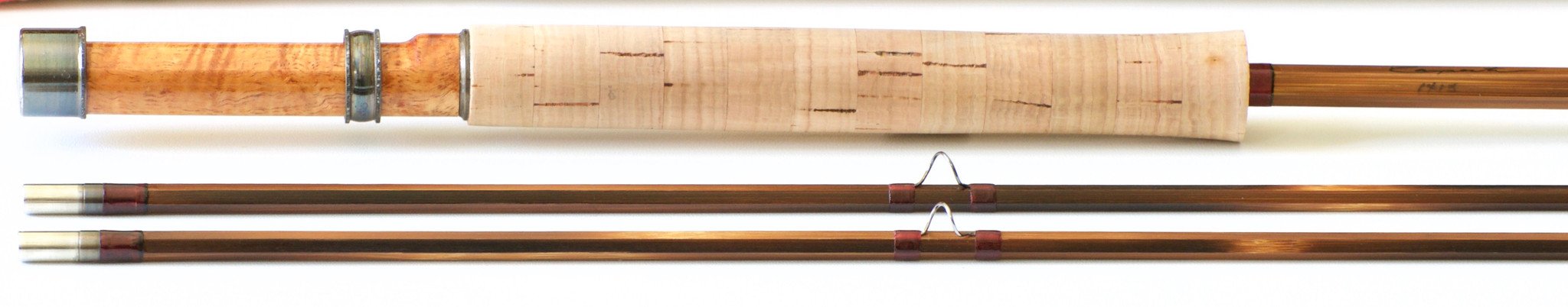 For sale here is a hollowbuilt rod by Cris Carpenter, 8'4" 4wt. Weight 3 5/8 oz. Excellent+ original condition. Serial No. 1415. Darkly flamed cane with ruby red wraps. Cris has only made a handful of rods that were darkly flamed like this one. Black tipping at the signature wrap, ferrules and tip-tops. Modified full wells grip is in excellent condition with minimal soiling. Cap and ring blued reel seat with a fine wood spacer. Super-Z style ferrules size 13/64. The fit is perfect. Medium-fast action that is quite nice. Comes with original fine linen bag and aluminum tube with brass ends and Carpenter Bros. label.