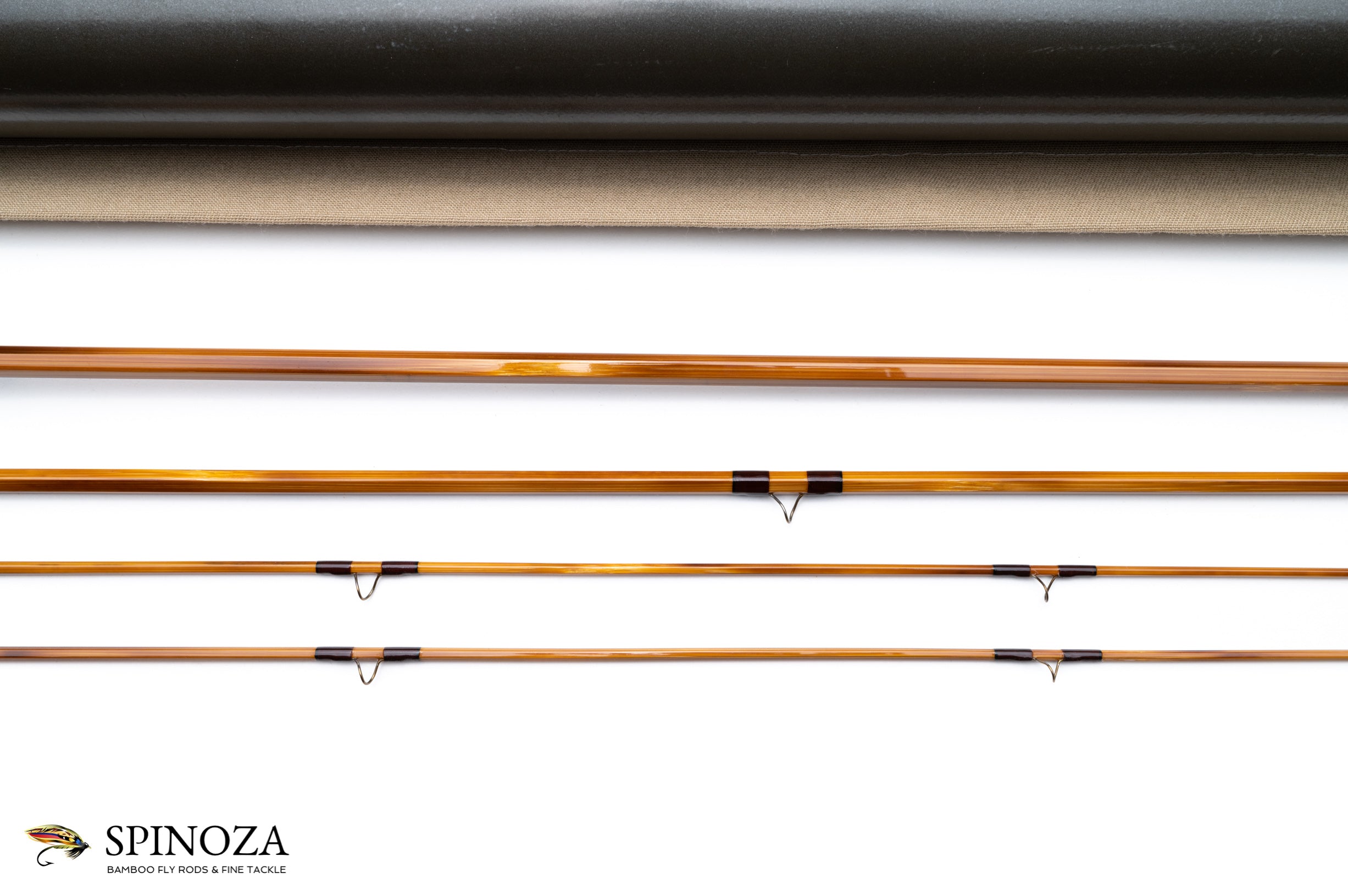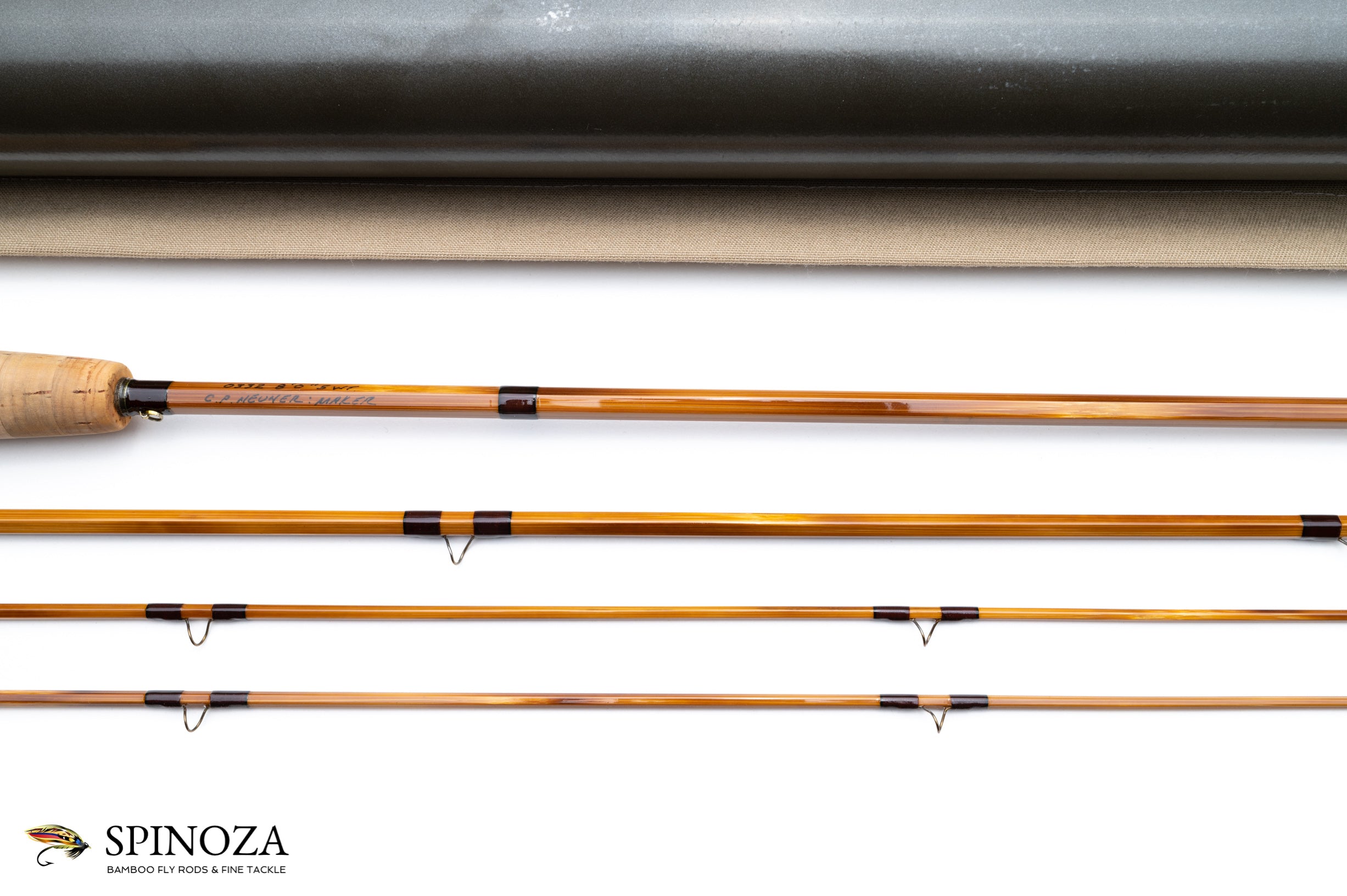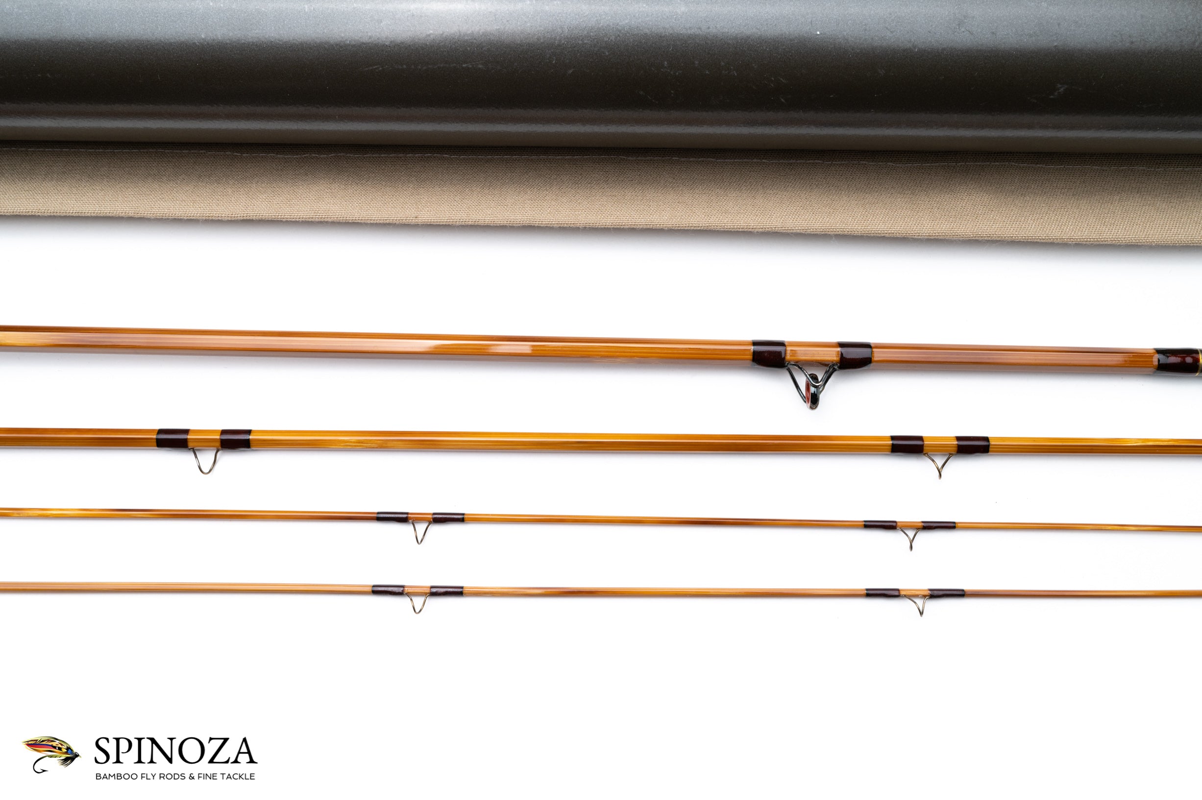 A Charles Neuner bamboo fly rod, 8', 3-piece, 2-tip, and built for a #5 line. 4.8 ounces. #0332. Medium to slow action. Lawn cast with a hint of brassing to the inner snake guides. The cane is flamed and the nodes are two-opposed. The main wraps are dark maroon with black edges. The stripping guide is a red agate and the snake guides are bronze. The varnish is excellent, all sections are straight, and the ferrule fits are good. The ferrules are swiss-style and oxidized. They are fitted with small finial aluminum and cork ferrule plugs. The cork grip is 6" long and cut to a western style profile with a hidden pocket cap. The reel seat is a small all nickel silver uplocking screwlock and the mortised wood spacer is a stabilized redwood burl. The rod comes with a khaki colored cloth bag and a brown painted aluminum tube with a gold anodized aluminum collar and top. The top has Charles roller die stamp in a cartouche and " 8'0" 3PC 5WT " engraved in the top.