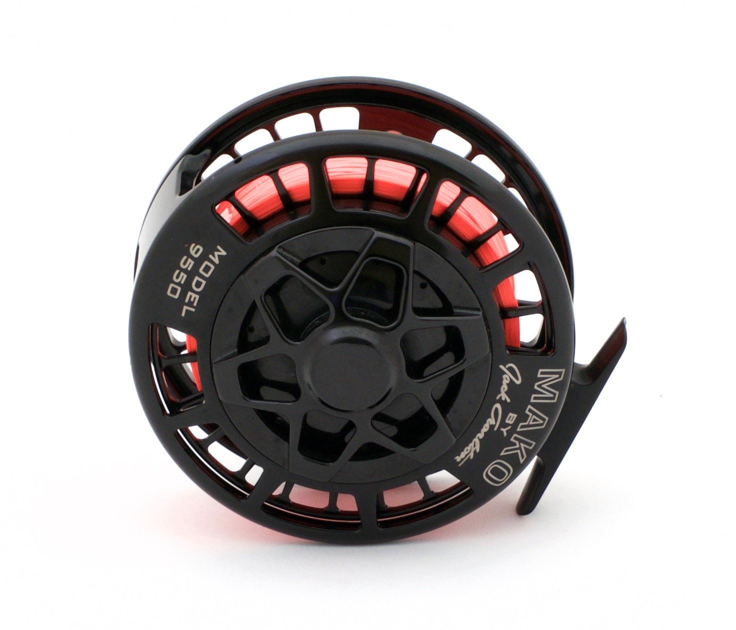 For sale here is a Charlton Mako Reel Model 9550 with the 10/12 spool. Type III black anodized finish. Left-hand retrieve. Excellent++ used condition with very minor rub marks on the surface of the anodizing. 4 1/2" diameter and 13 7/8 oz. Comes with original box and pouch.