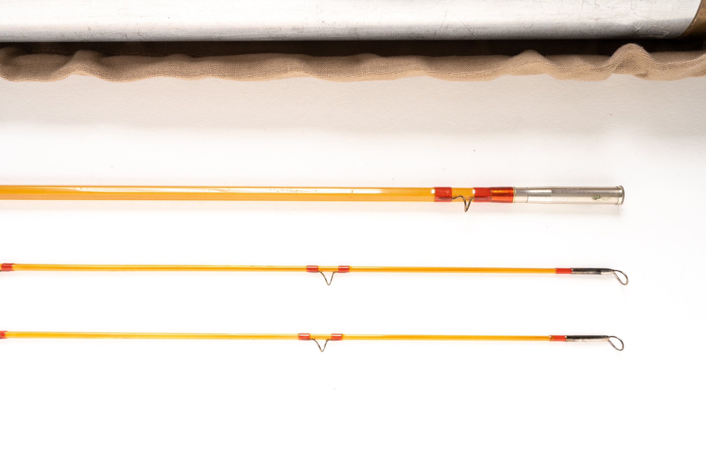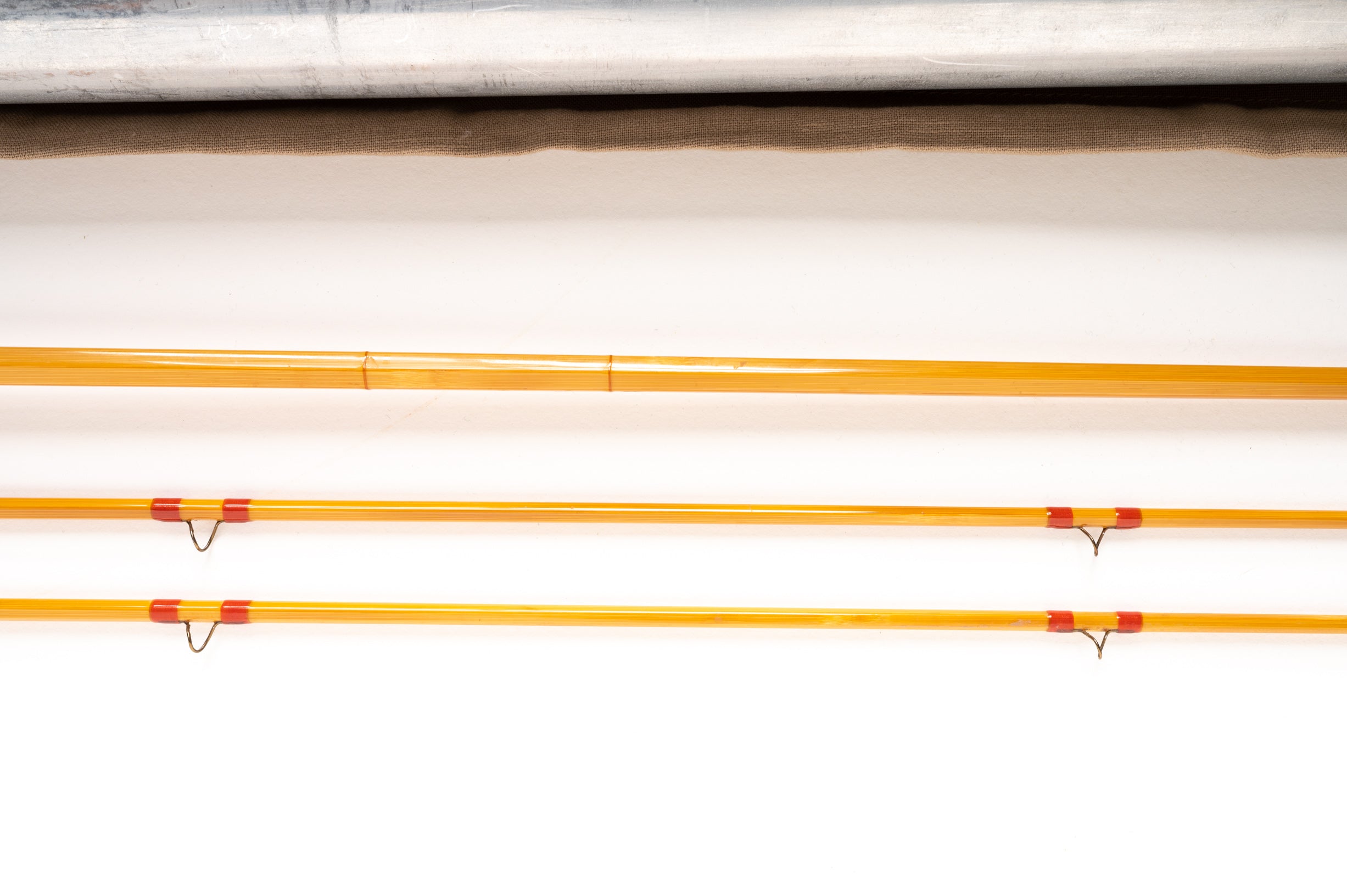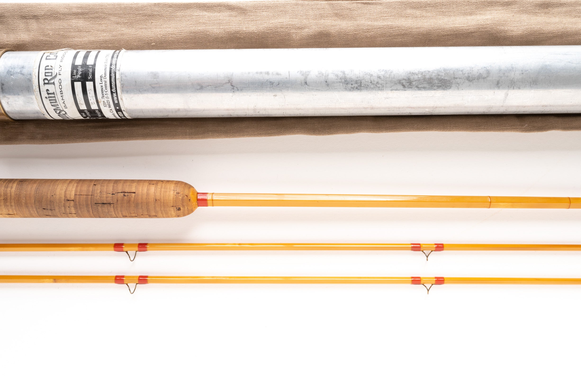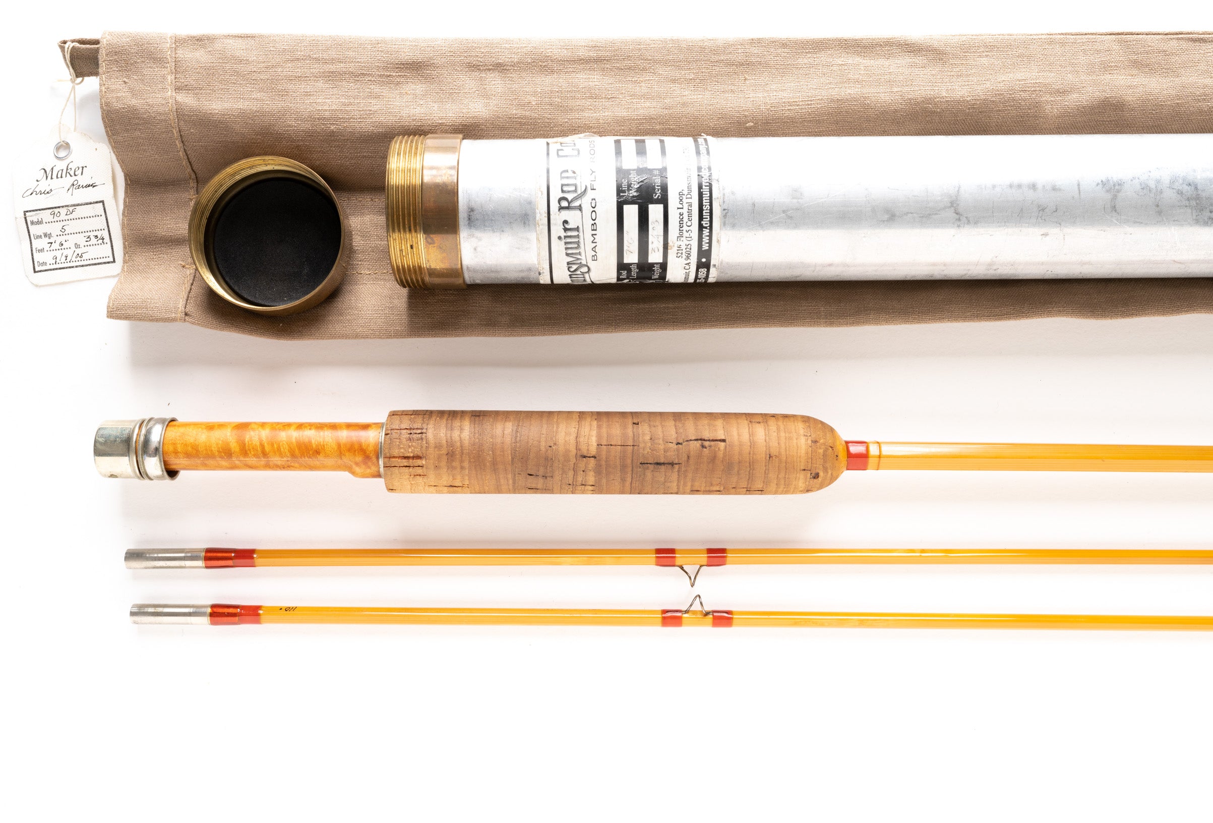 A Chris Raine (Dunsmuir Rod Co) fly rod, 7'6", 2-piece, 2-tip, and rated for a #5 line. A model "90 DF" according to the hang tag, which also has the listed weight at 3 3/4 ounces and a manufacture date of 9/9/05. "Chris Raine, Maker" is lettered on the butt shaft along with "model 90-DF" and "No 110" indicating the model and serial number. 2 opposed node pattern construction and a light wheat straw color cane. The grip has soiling indicating moderate use but the rod remains in excellent, well-cared-for condition overall. The varnish is excellent. The wraps are done in a bright Chinese red and the hardware is oxidized bright (there is some slight tarnishing on the outside of the female ferrule and on the butt cap). Swiss style ferrules. Garrison style grip with the aforementioned soiling. Wood spacer with a matte, stabilized finish. Agate stripping guide. Fast DF action. Comes in a khaki green rod bag with a hang tag and aluminum tube affixed with Chris's sticker and brass top and bottom.