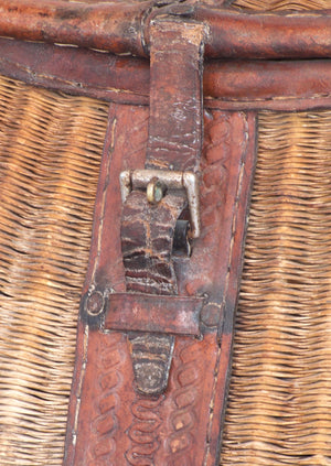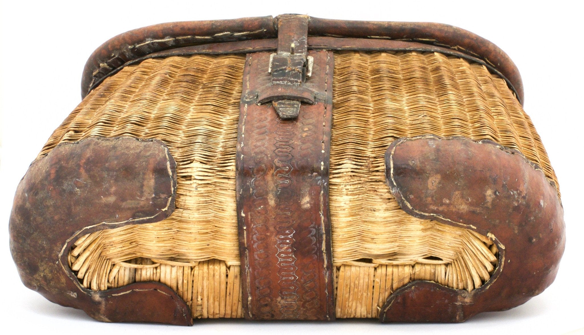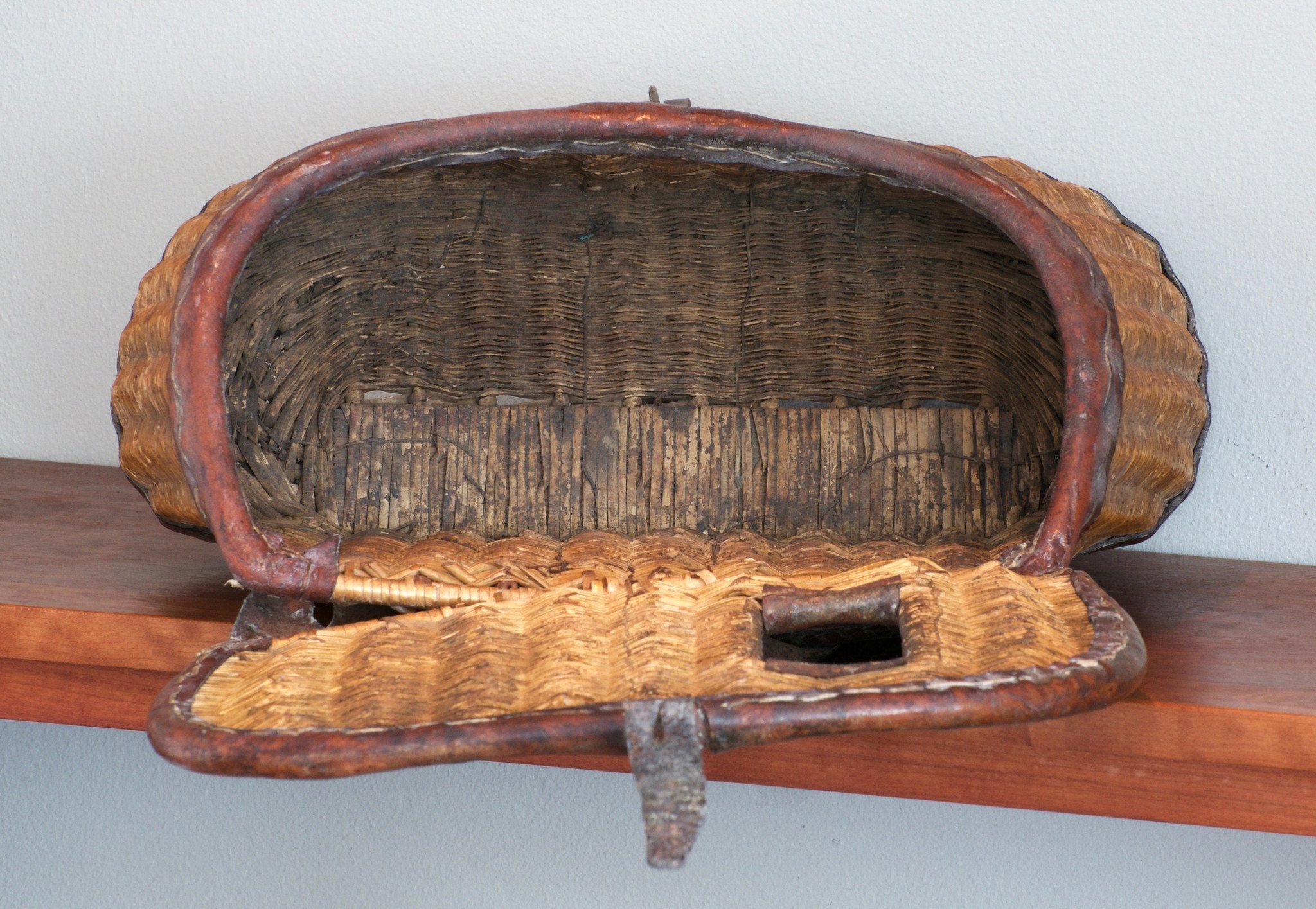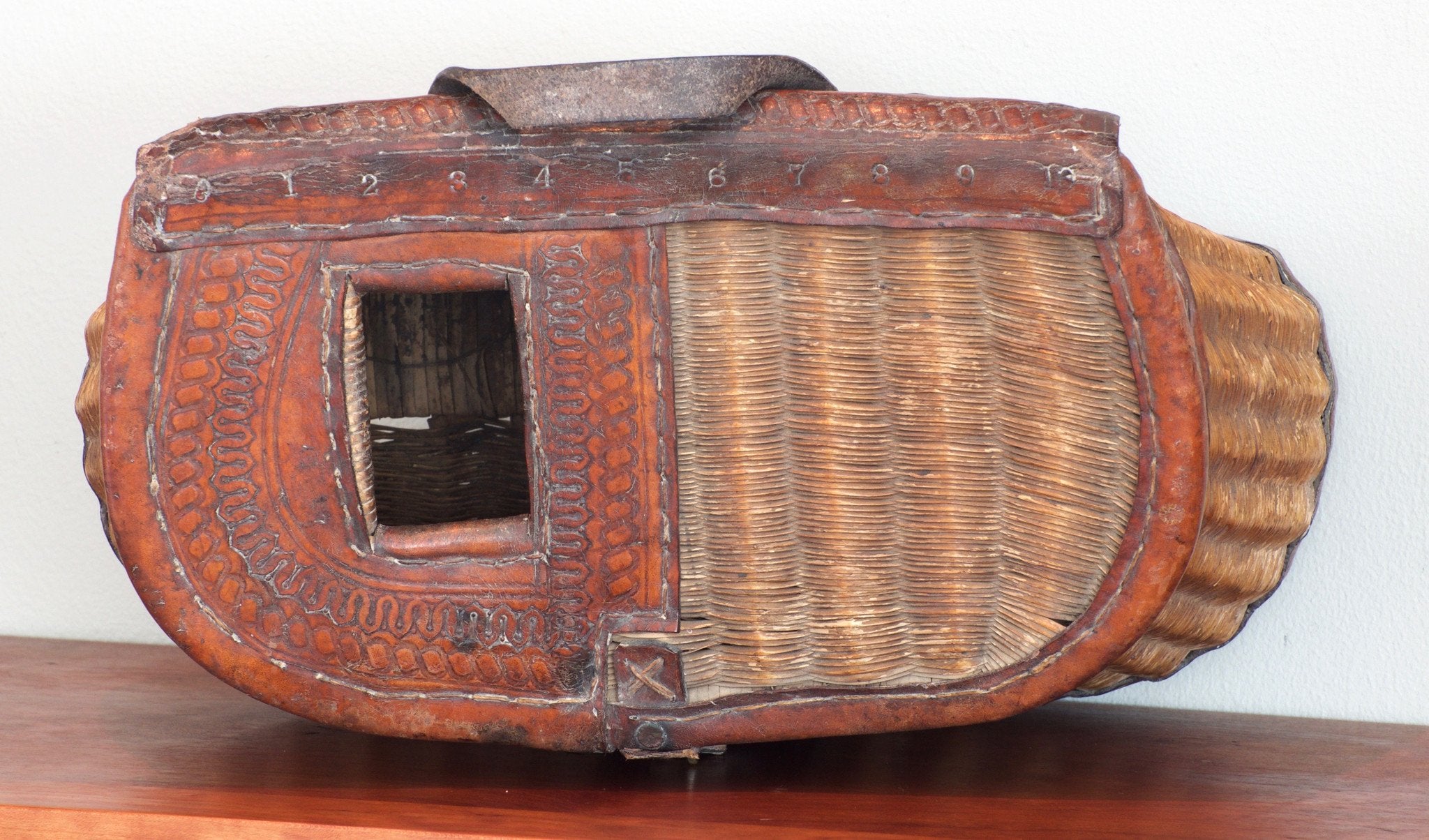 For sale here is a scarce John Clark Saddlery of Portland, Oregon split willow leathered creel. Clark made creels until about 1928. Outside dimensions: 15"+ in width, 9 1/2" in height, and roughly 8" deep. Inside dimensions: 13"+ in width, 8 1/2" in height, and roughly 5" deep. The creel basket itself is very tightly woven and solid. Every original part seems intact, except for the shoulder strap, which is missing, and the lid has some stitching detached as shown in the last two photos. There is also some writing on the leather near the handle on the backside -- a name and a date around Christmas in 1926.