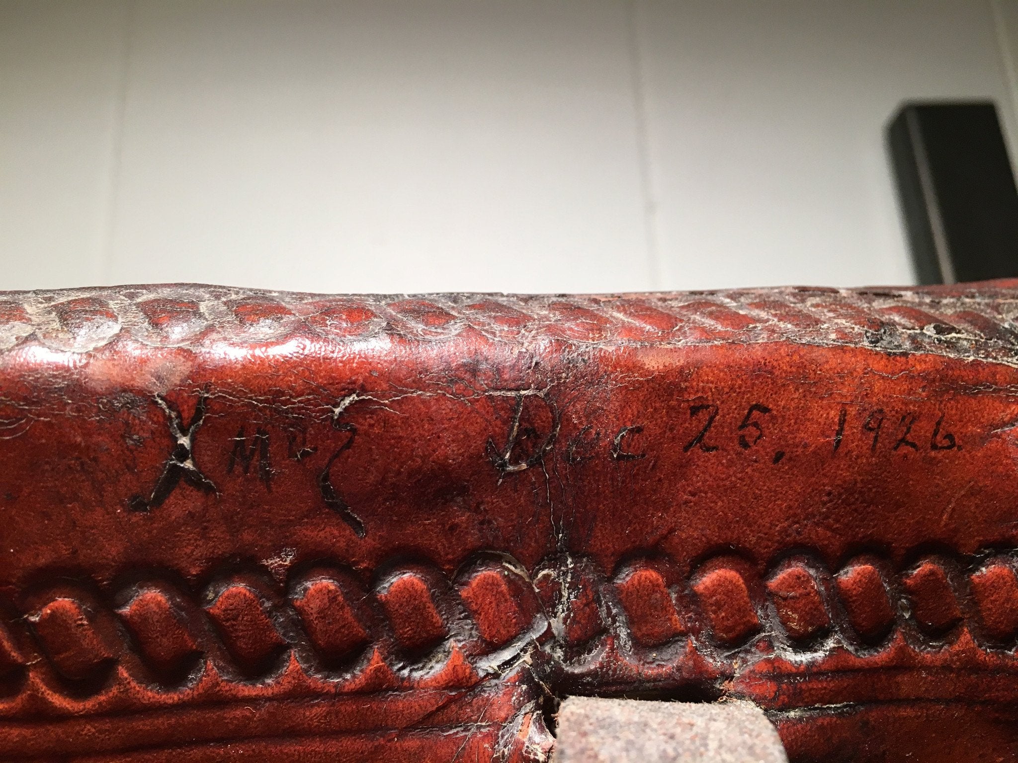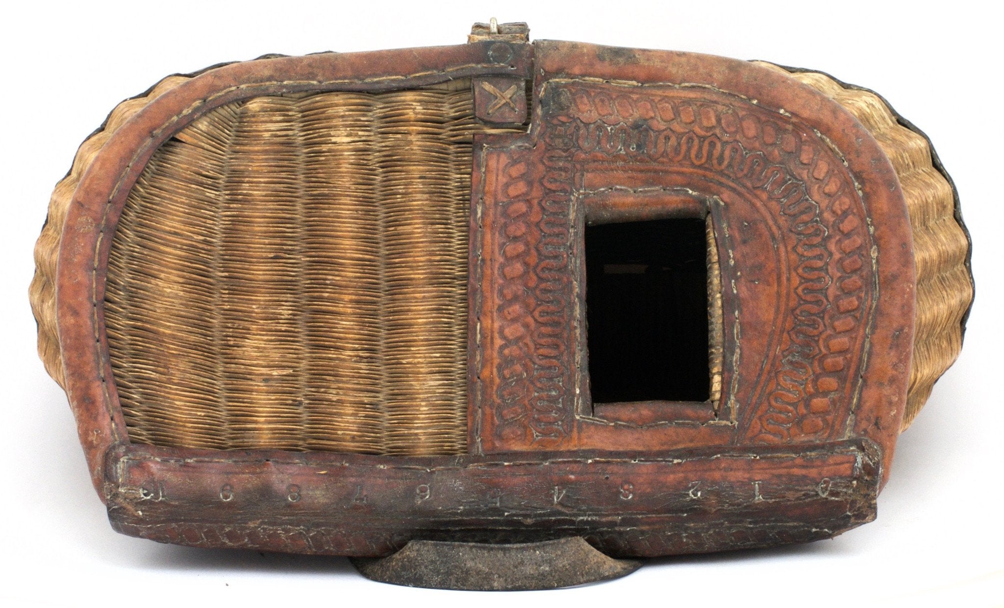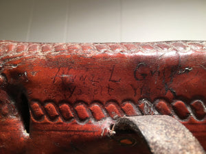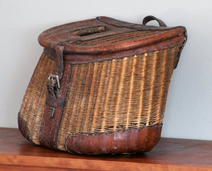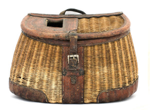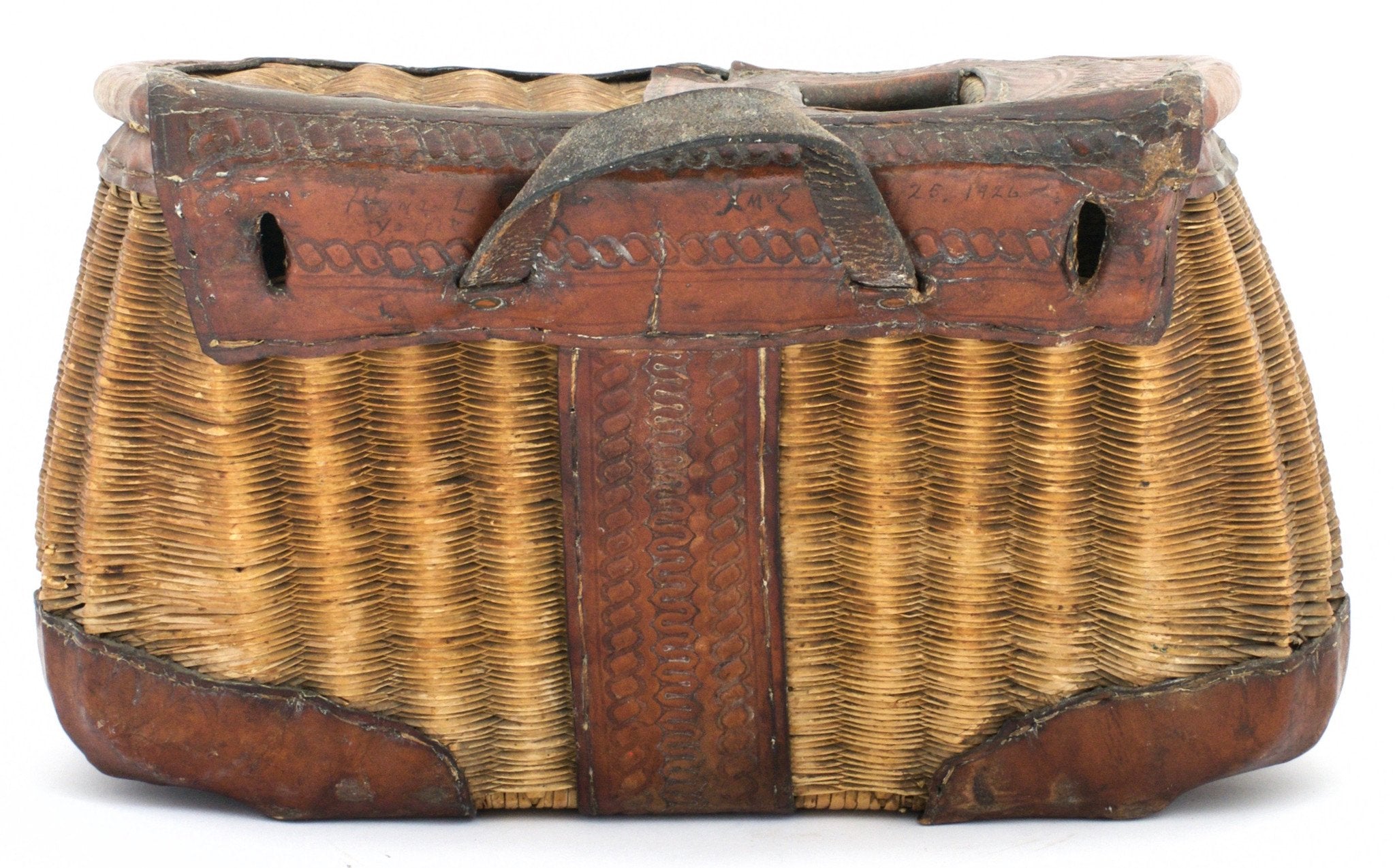 For sale here is a scarce John Clark Saddlery of Portland, Oregon split willow leathered creel. Clark made creels until about 1928. Outside dimensions: 15"+ in width, 9 1/2" in height, and roughly 8" deep. Inside dimensions: 13"+ in width, 8 1/2" in height, and roughly 5" deep. The creel basket itself is very tightly woven and solid. Every original part seems intact, except for the shoulder strap, which is missing, and the lid has some stitching detached as shown in the last two photos. There is also some writing on the leather near the handle on the backside -- a name and a date around Christmas in 1926.
