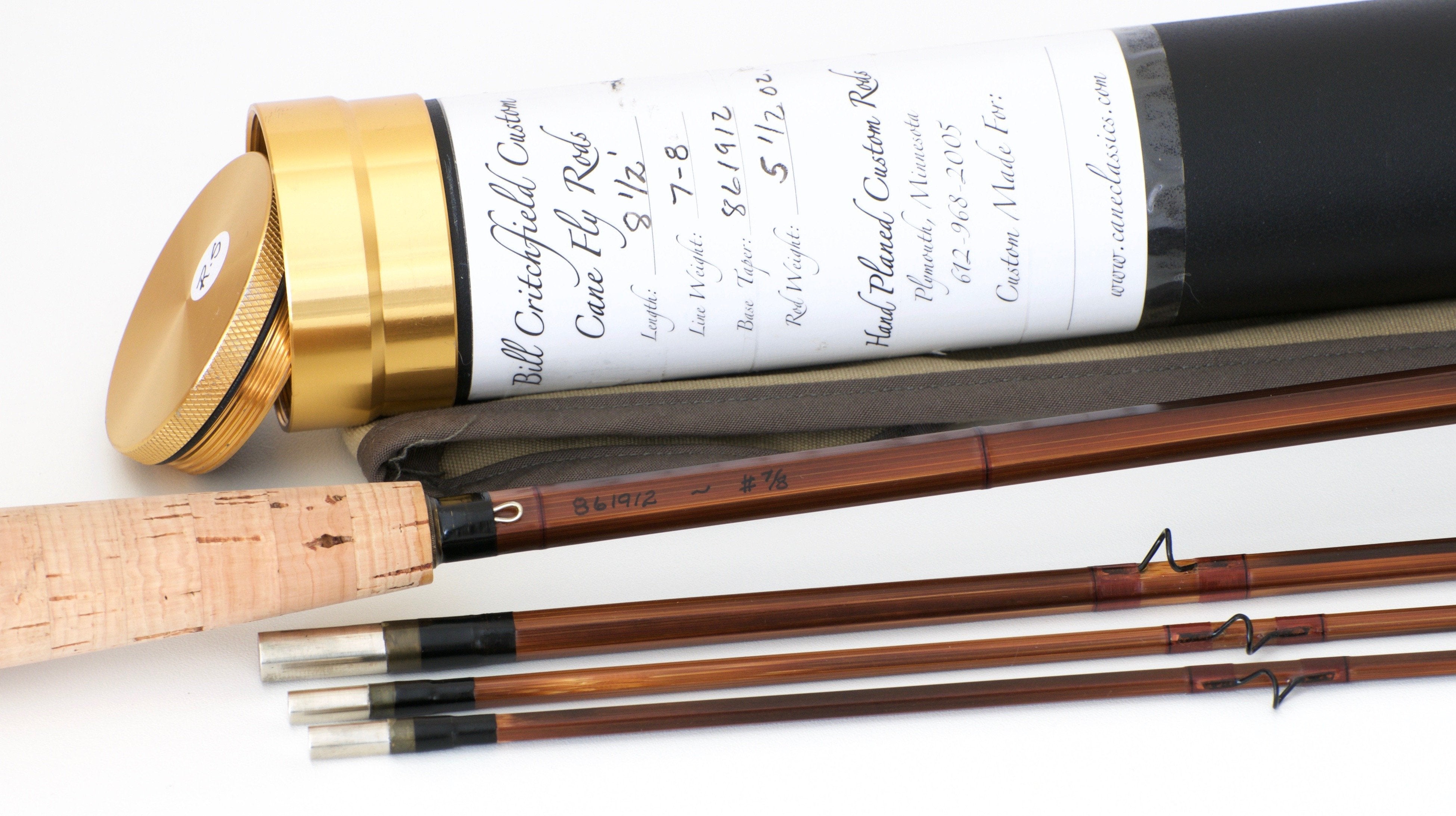 For sale here is a Bill Critchfield 8'6" 7-8wt 3/2 bamboo rod. The rod is in excellent condition. The rod features beautifully tempered, chocolate colored cane with a matte finish. Transparent amber colored wraps with fine black tipping. The tip-tops feature one band of black tipping on the first and two on the second. Blued guides. Salmon colored agate stripping guide. Garrison style hook-keeper. Blued, knurled, nickel silver checks. Reverse half-wells grip with only the lightest of soiling. Blued up-locking reel seat with a fine walnut spacer. The fighting butt is cork and burled cork with a blued aluminum button butt cap. The blued Swiss style ferrules are size 11/64 and 18/64, the fit is perfect. The rod weighs 5.75 oz. The action is medium-fast. The rod feels lighter than one would expect and balances nicely. Includes original bag and tube with label and fine brass fittings.