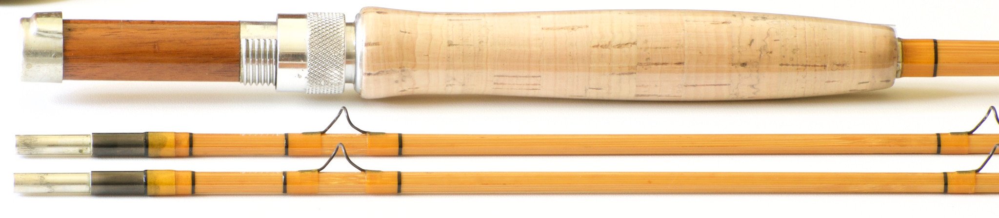 For sale here is a Lyle Dickerson Model 8014 bamboo rod. 8', 2/2 for a 6 weight line. Built in 1948. Excellent+ restored condition, most likely by Jim Schaaf. All sections are full-length. The rod weighs 4 1/2 oz. Payne-style grip with down-locking hardware and walnut spacer. Shrink wrap has been placed over the grip for protection. Transparent honey colored silk thread wraps with black edging contrast beautifully against the blonde cane. Blued nickel silver ferrules and guides. Classic 3x3 Dickerson node pattern. The ferrule fit is great; size 14/64. Medium-fast action. Comes with original bag and replacement tube with brass fittings.