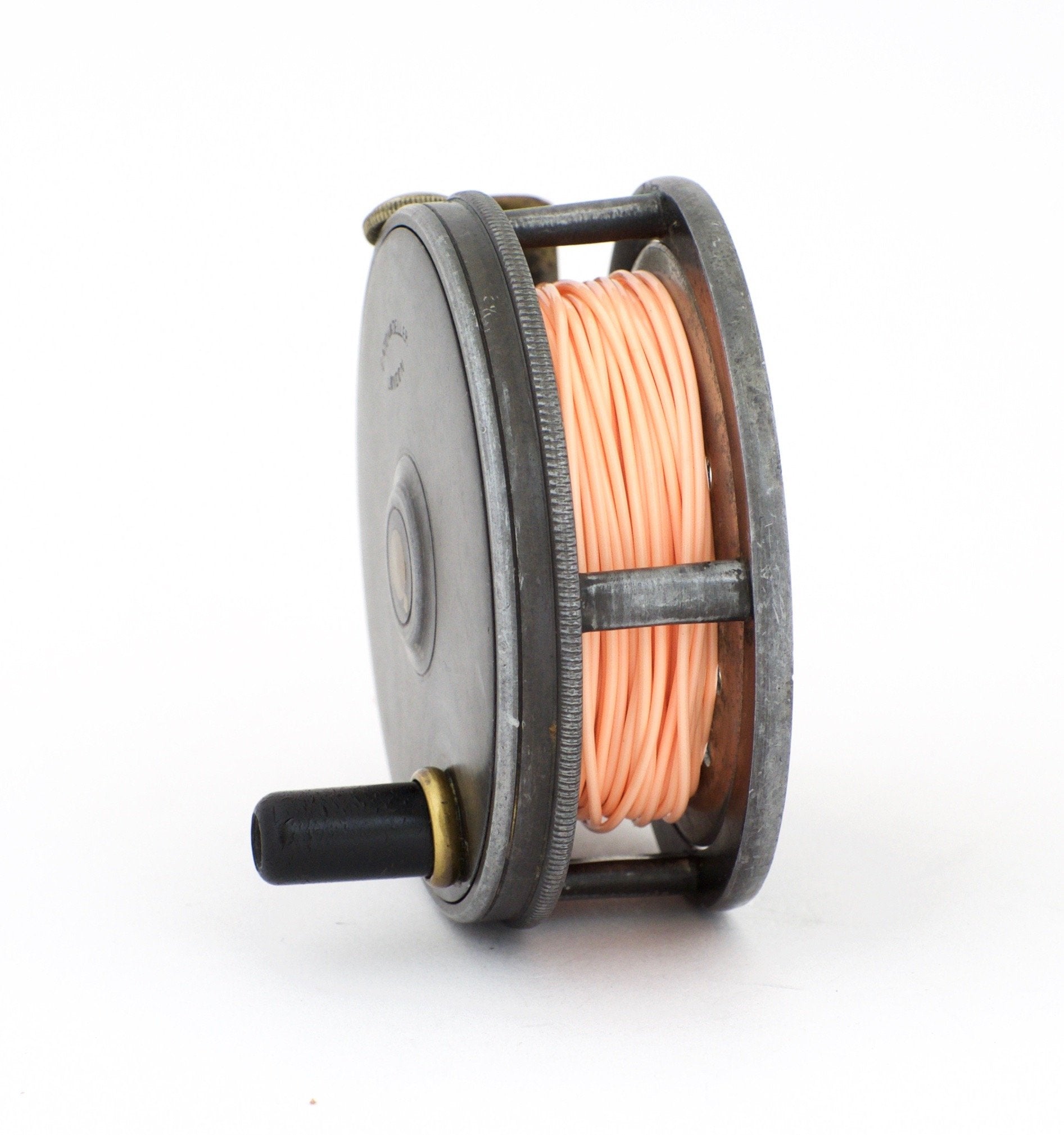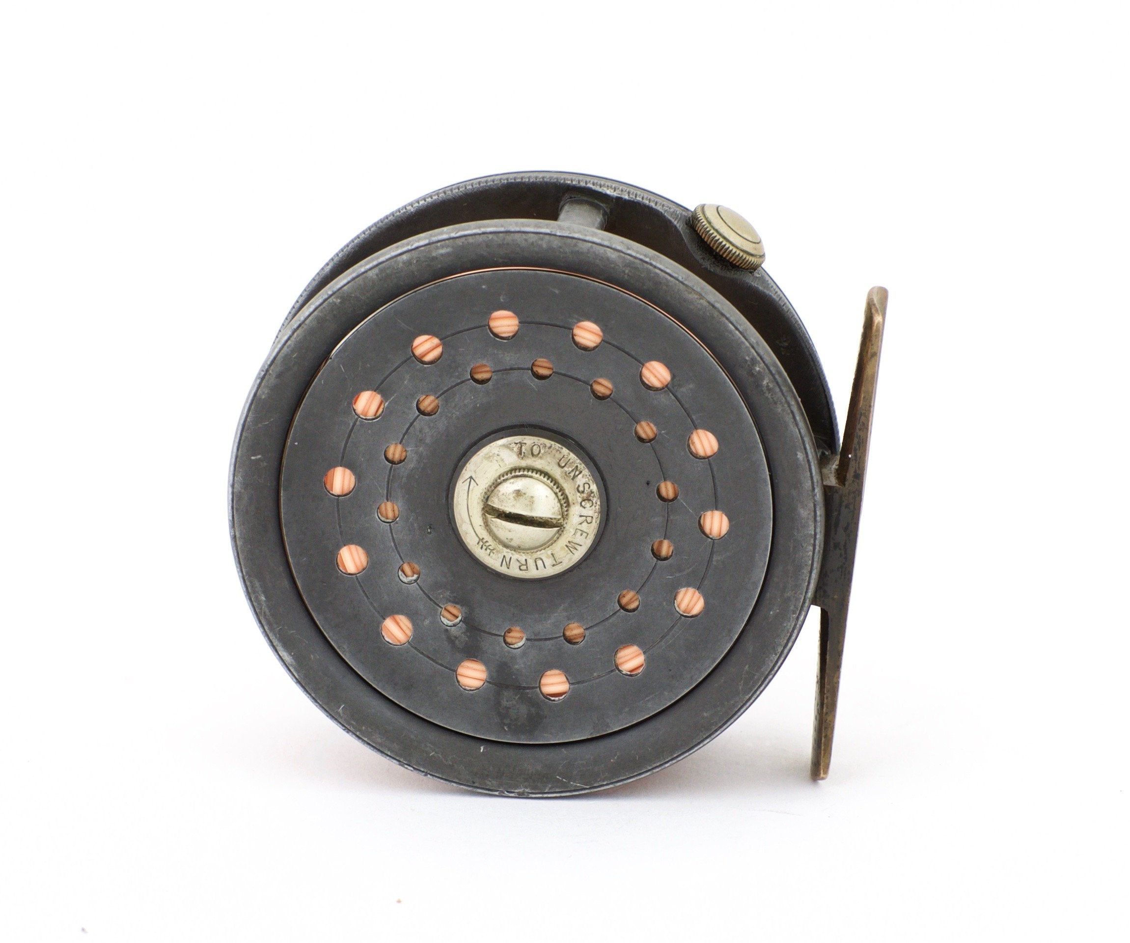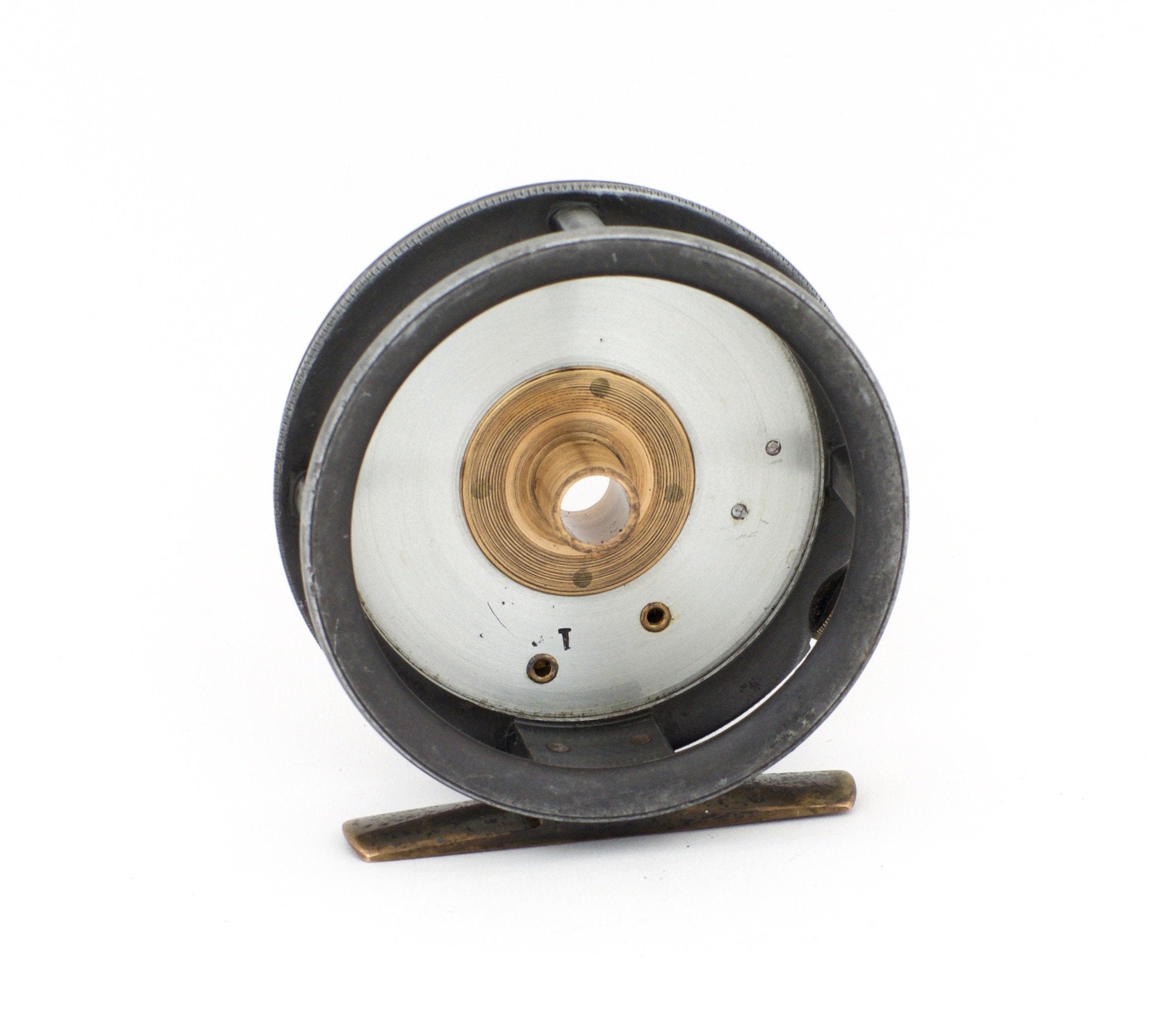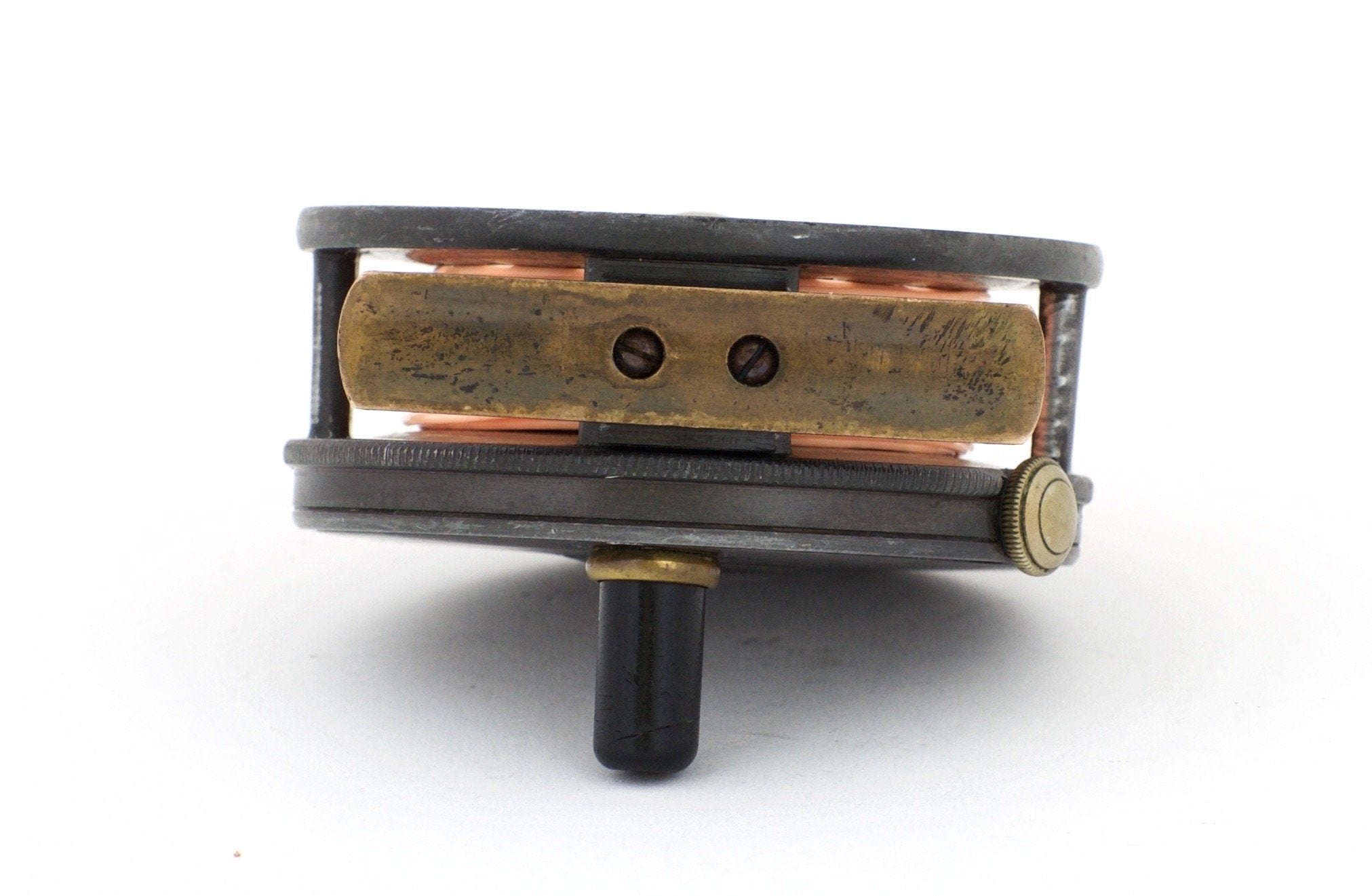 For sale here is a Dingley 3" Perfect Style Fly Reel made for Eaton & Deller - London. Stamped D1 and 1 throughout. This excellent condition reel is right hand retrieve and comes with a nice and strong single spring/pawl system. The tensioner works perfectly. Gear teeth and pawl still very sharp. Unaltered original smooth brass reel foot with two screws. The ebonite handle spins freely. The reel has no troublesome wobble or end play. No line burns. No cracks/chips or prior repairs. The reel weighs 7 1/2 oz. A fine example of the Dingley Perfect!