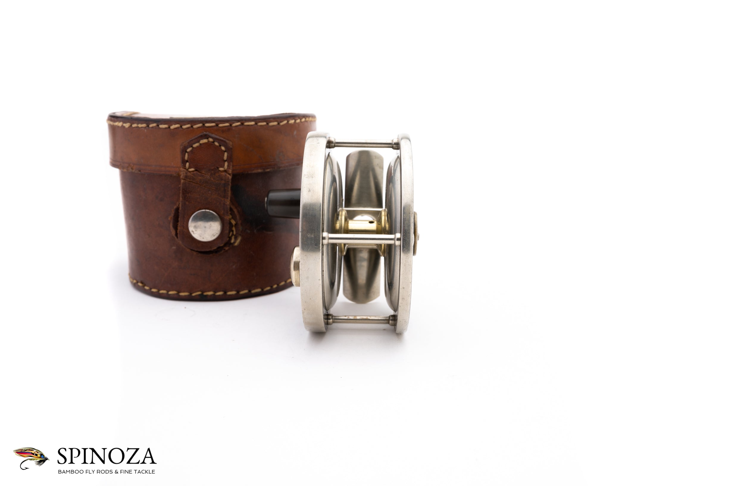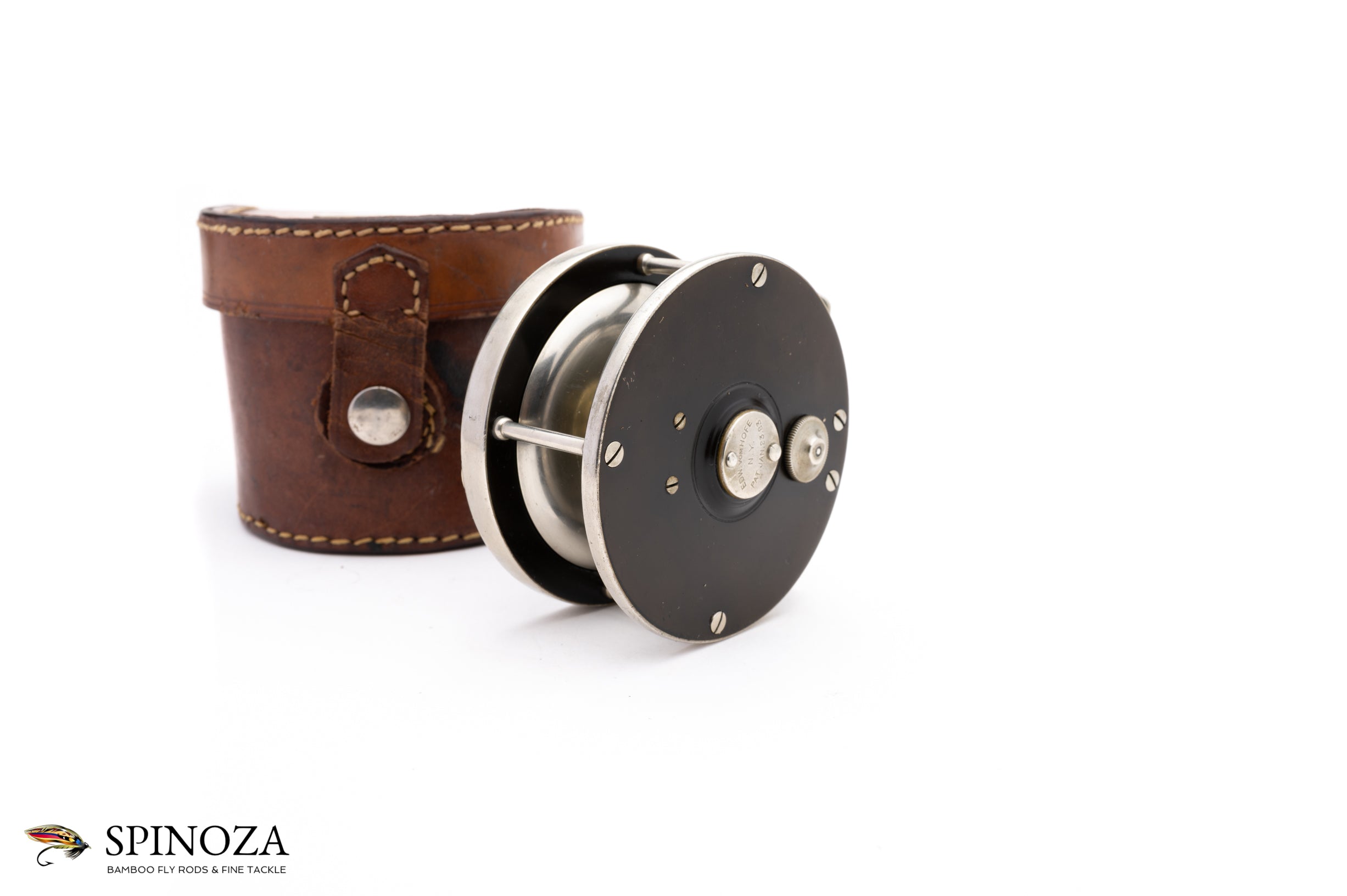 A very nice Edward vom Hofe #2 Perfection trout reel, the most coveted trout model in the Vom Hofe lineup. At 2 3/4" in diameter, this rare little beauty is the perfect sized EVH to pair with your finest 7' or 7'6" rod. It is made of German silver and hard rubber, and it has the sliding drag disc with the delicate arrowhead adjuster underneath the “S” shaped handle with the red lacquer largely present at the drag stations. "360" and "2" are stamped into the foot crossbar, noting the model and size respectively. No serial number present. It carries the ‘83 patent on the rear grease cap with an on/off click that works as intended, and favors RHW. There are no cracks in the hard rubber, which has just a touch of the brown undertone that these reels tend gain over time. Opposite the foot on the front plate the initial "JHW" are engraved a very tiny script. There are no replaced parts or line burns in the rims or pillars that I could find. The foot measures 2 1/2" in length and appears unmolested. The reel packs into the original leather case which is in fine condition with a functioning strap and the Vom Hofe stamp on the underside. A very fine example of one of the most desirable Vom Hofe trout reels.