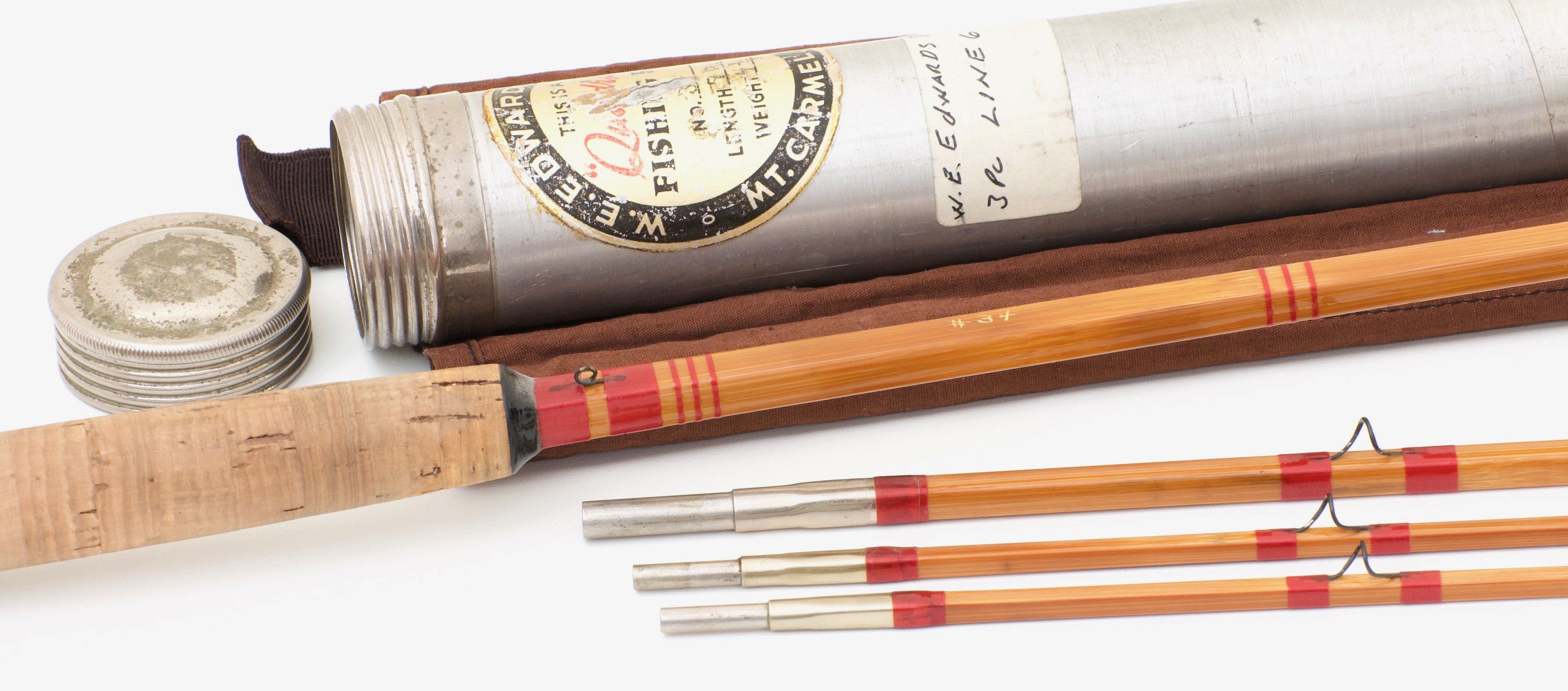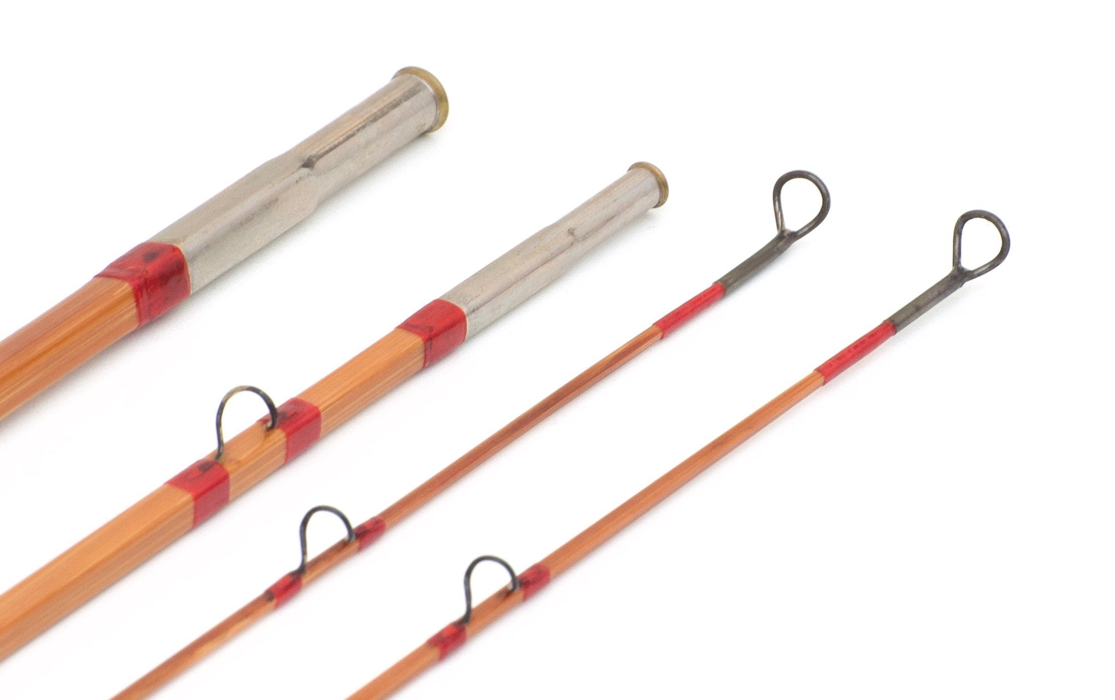 Moderately tempered cane with transparent red wraps. Blued guides. Loop hook keeper and a handsome bakelite winding check. The cigar grip measures 5 3/4" in length with moderate soiling. Aluminum cap and ring reel seat over a cork spacer with another band of bakelite above the butt cap. The nickel silver step-down ferrules have an excellent fit. The rod weighs 4.50 oz. with a terrific dry-fly action on the faster side of medium-fast. Includes the original bag and tube with label mostly intact.