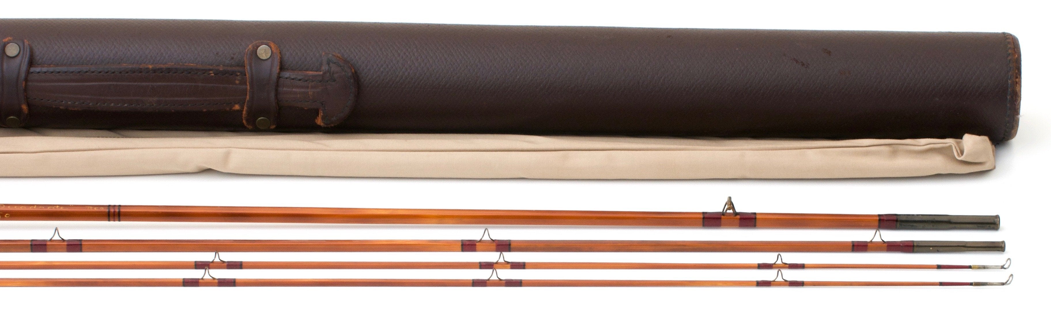 Dark flame-tempered cane with rich burgundy silks and black tipping. Blued guides and ferrules. The signature Edwards script remains as clean and bold as the day it was written. The hook keeper has been lost, a common occurrence. Squared bakelite winding check flows seamlessly into the squared half-wells grip measuring 6" in length. The up-locking reel seat is quite handsome and made entirely from bakelite as is the butt cap and shows only slight wear. The blued ferrules fit together perfectly. The action is medium-fast. A fine trout rod, very well equipped for almost all situations. The rod includes a replacement bag and fine leather rod tube.