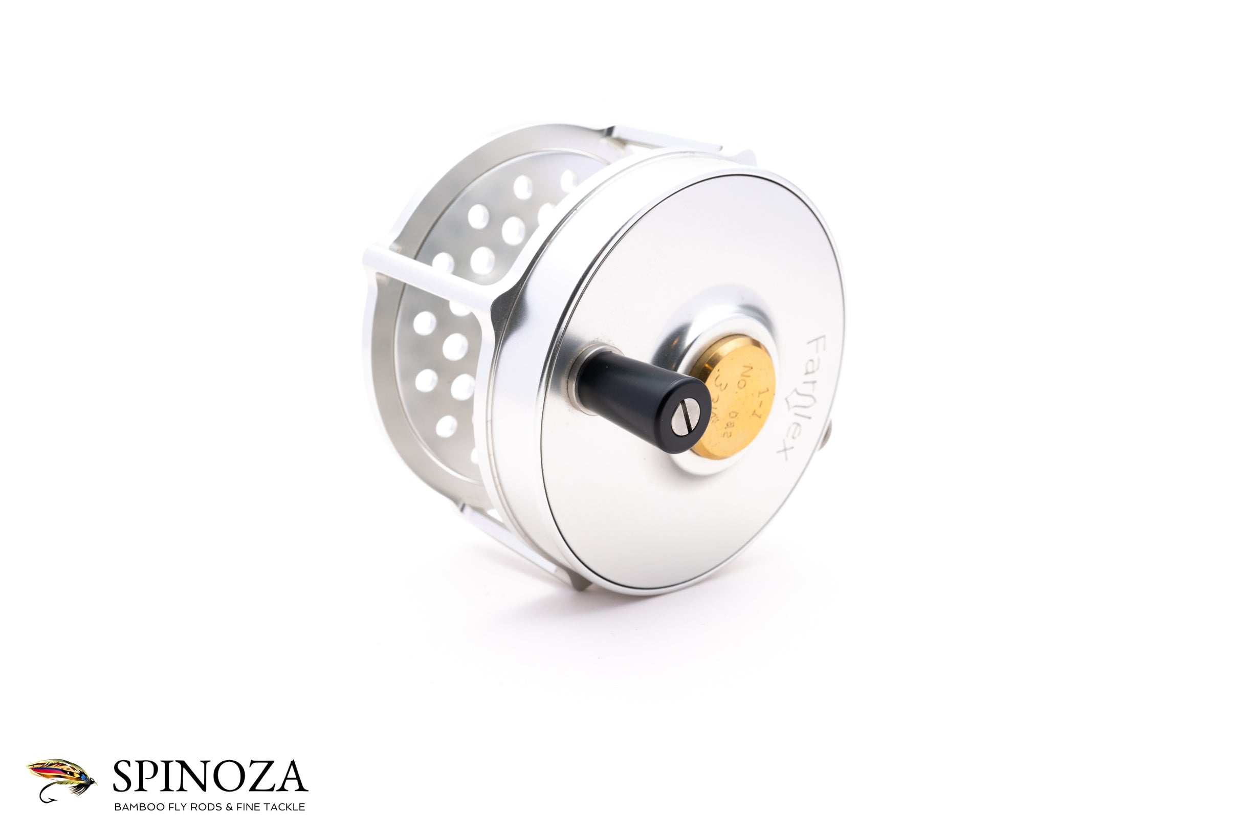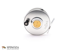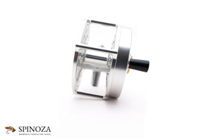 A nice Farlex Platewind direct drive fly reel, 3 3/4" diameter and set up for RHW (though the bias is fairly neutral). Raised pillar design. Serial #082. There are two tiny mounting marks on the the foot ends but I can find no sign that the reel has been fished (maybe it happened for potential rod matching purposes?). Silver anodized throughout. The reel weighs 10 ounces on my scale. Gear and pawl drag system with a nice loud click. Ebonite handle that's slightly flared at the end. The winding plate sports a brass medallion over the spindle that notes the size, serial number, and gear ratio. "Farlex" is etched into the winding plate. There is also a tensioner in the frame edge near the foot to adjust the drag. No bag. A nice match for spey rods in the 11' to 14' class.