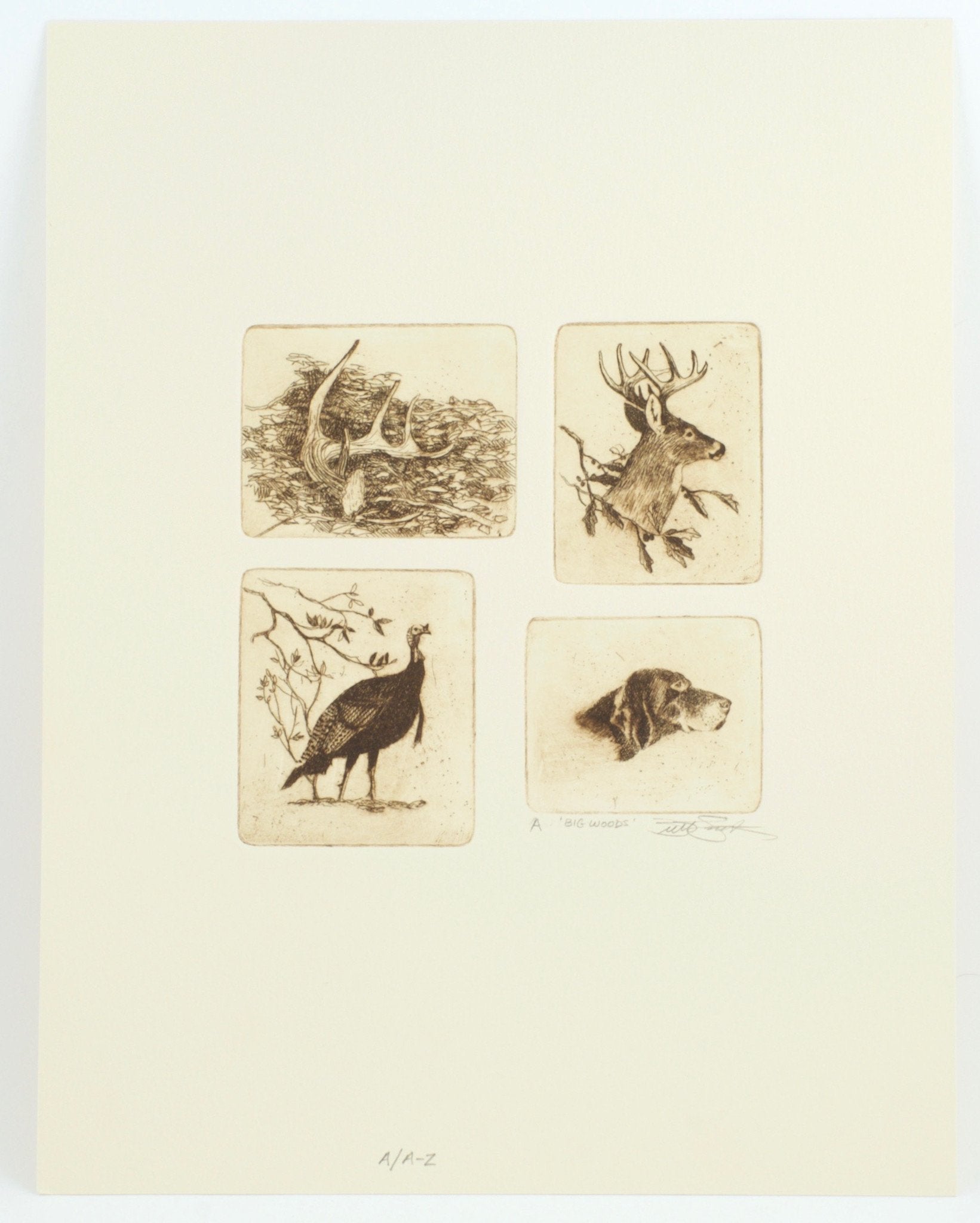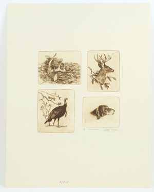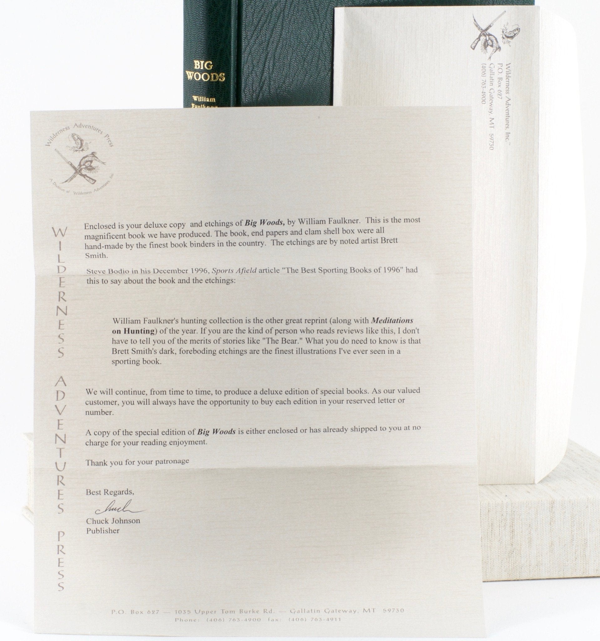 Faulkner, William -- BIG WOODS. Wilderness Adventures Press, MT, 1992, 4to, 177 pp. Deluxe edition. This one is the first of the Deluxe Edition series, designated "A". Only 24 were offered for sale. Printed on 80lb. Mohawk paper with hand marbled endpapers. Bound in English goat skin. Housed in a handmade clamshell box. Illustrations by Brett Smith with etchings. Each deluxe book has a separate handmade matching folder holding six "A" lettered etchings. Many consider Faulkner’s hunting stories to be the best literary sporting stories ever written. Deluxe editions are rare and the price continues increase.
