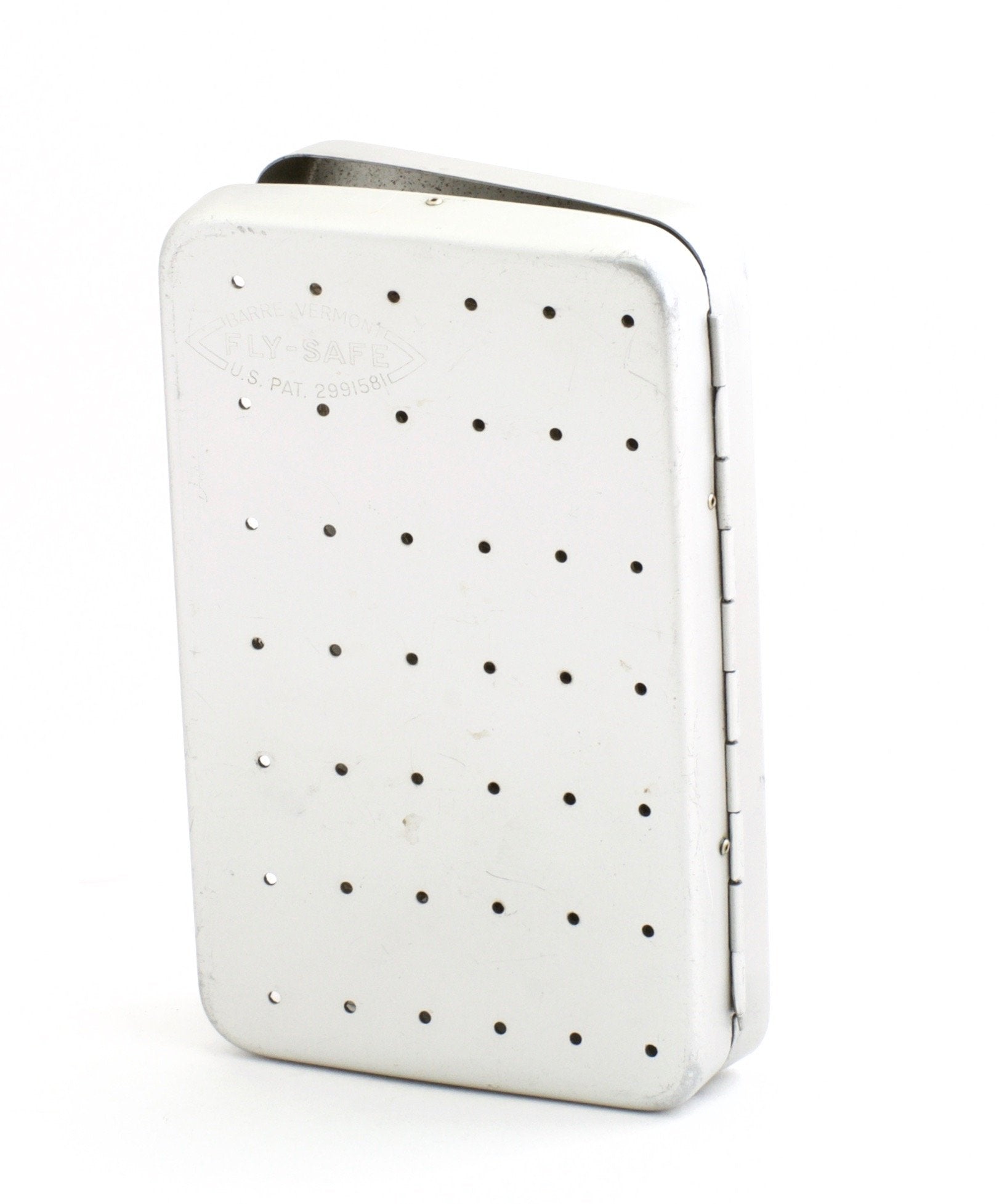 For sale here is a "Fly-Safe" fly box with various dry flies. Though the box closed squarely it does not stay closed very well. The box measures 6 1/4" x 3 3/4" x 1 1/8" with 72 individual clips for the flies. There are approximately 50 vintage flies all around size #14. The patterns include Adams, Humpys, Royal Wulffs, muddler minnows, elk, hair caddis, and several more.The flies are all in very good to excellent condition. Most of the flies appear to be un-fished.