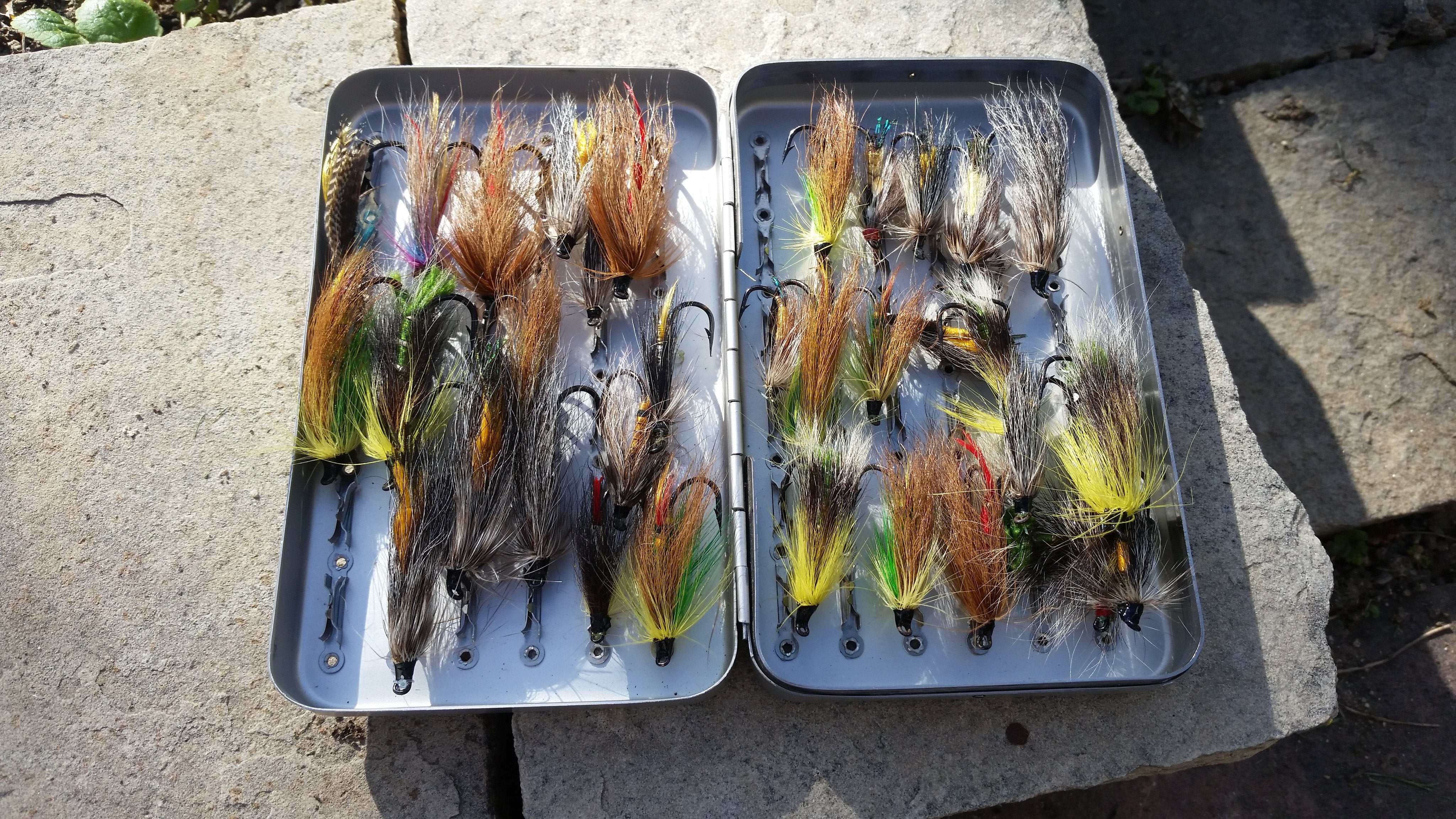 For sale here is a Fly-Safe -- vintage aluminum fly box with flies. The box is in excellent condition void of dents or major scratches. Though, the box does not close very securely due to the amount and size of the flies. Also, there is faded writing in black marker on the box listing the flies within, on the other side are the former owner's initials. This could easily be removed if desired. The box measures 6 1/4" x 3 3/4" x 1 1/8" with individual clips for the flies. There are approximately 30 flies all around size #0. All of the flies are double hook salmon or steelhead flies. The flies are all in excellent condition. Most of the flies appear to be unfished though some have been with rust present on a few of the hooks. Don't miss out on this vintage box and flies at a great price!