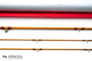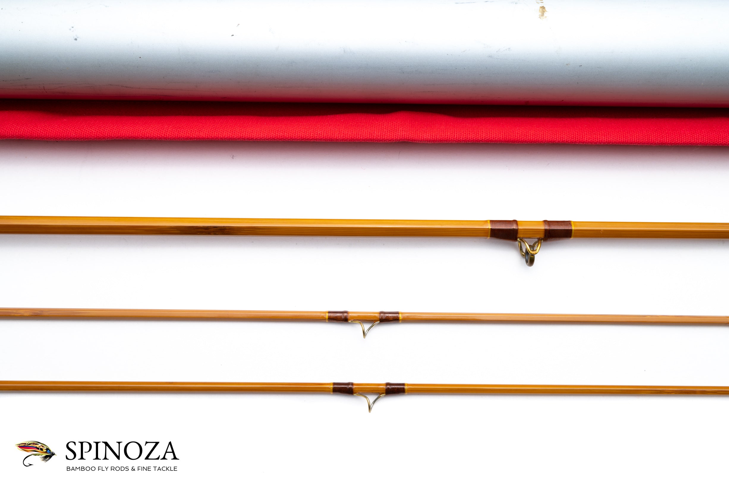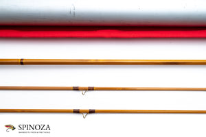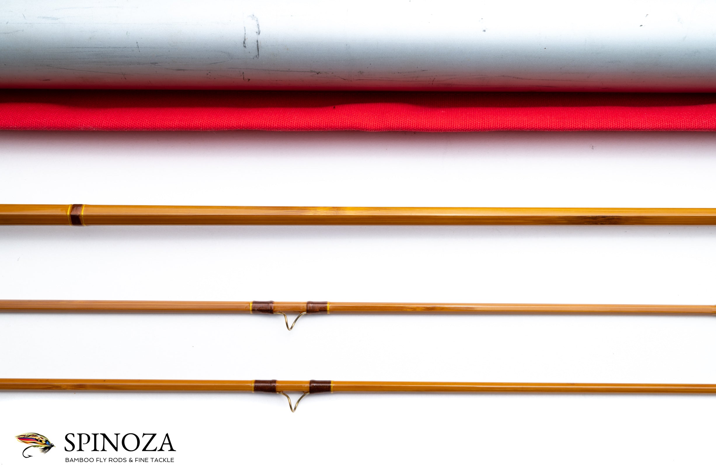 A nice Gary Howells bamboo fly rod, 8', 2-piece, 2-tip, and built for a #4 line. Serial #5202. 3.8 ounces. Lightly used condition with a minor amount of grip soiling. Medium to medium-slow full flexing action. Wheatstraw color cane done in a two opposed node pattern. Carbide stripper and chrome snake guides. I've always found Gary's varnish work to be remarkably good for the large number of rods he produced, and this one is no exception. The wraps are brown with yellow edges. The grip is 6" long and turned to a western profile with a hidden pocket cap for the aluminum uplocking screwlock. Nicely varnished wood spacer. The rod is straight, the ferrule fits are good, and the rod is free of any issues like hook digs, etc. The rod packs into a red cloth bag and a frost coated aluminum tube with Gary's data sticker.