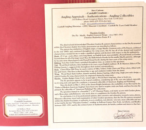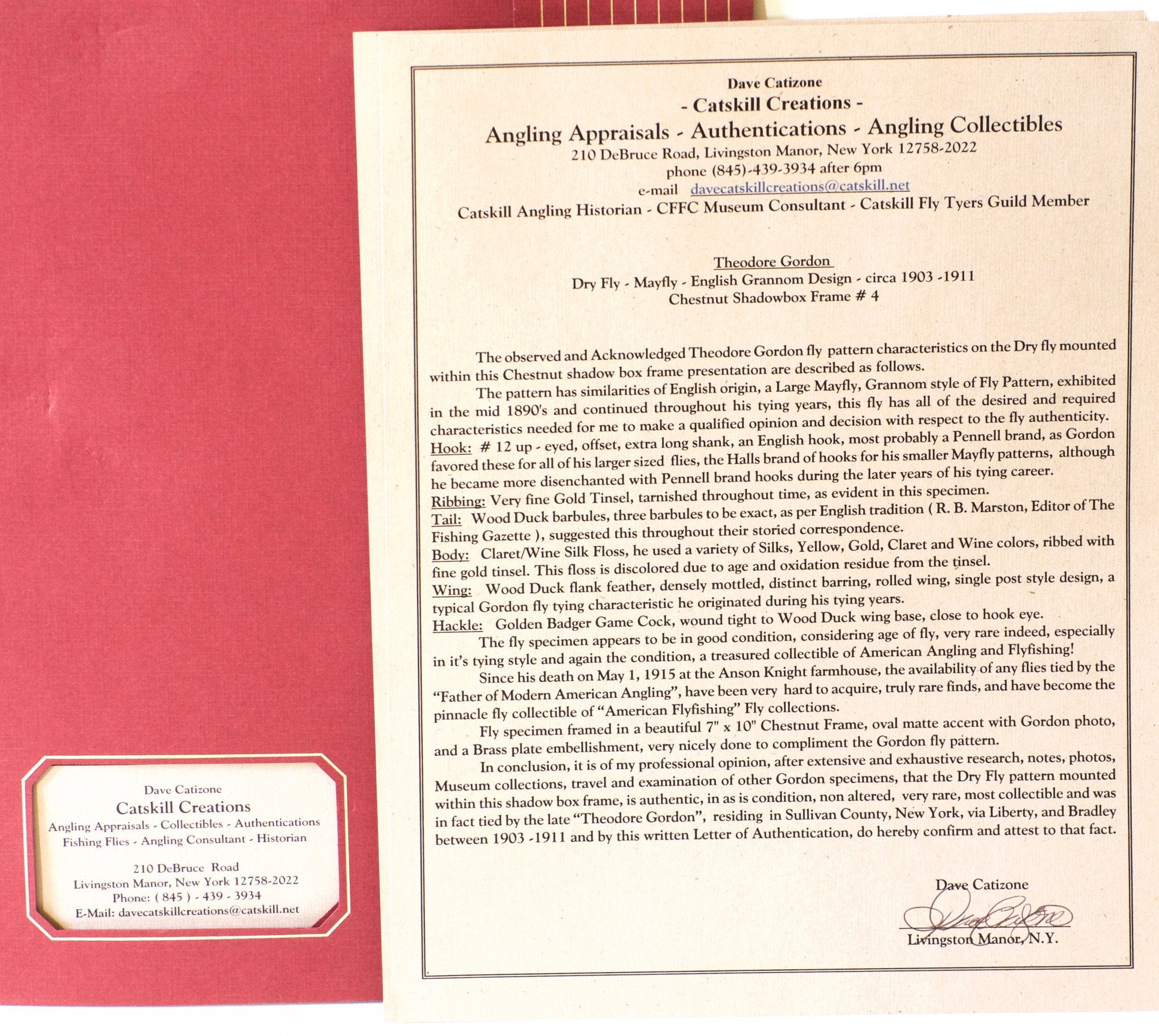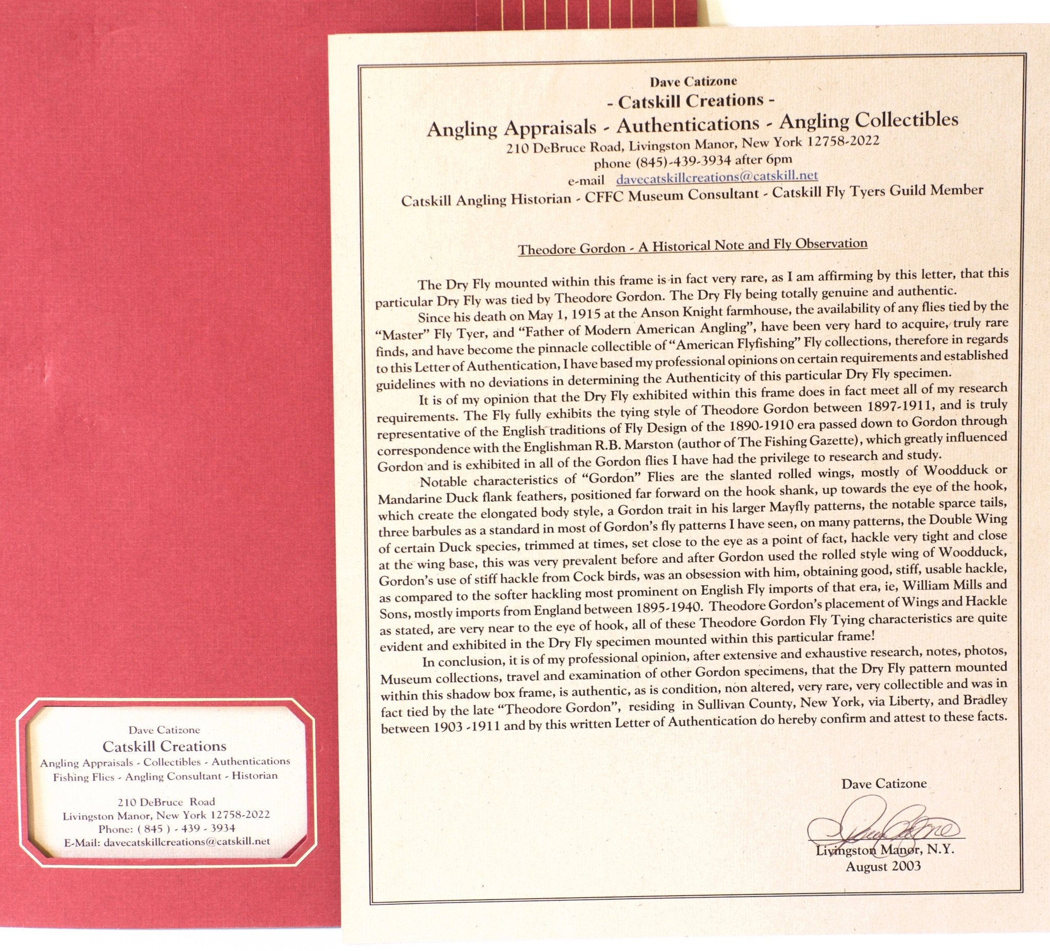 For sale here is a framed authentic dry fly tied by Theodore Gordon. Complete with a very detailed provenance letter from Dave Catizone.
