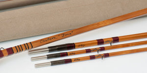 Dana uses highest quality bamboo culms that are 50 years old in constructing these beauties. He also makes his own ferrules. The rod comes with the original bag and brass-capped and die-stamped tube along with a canvas rod tube bag.