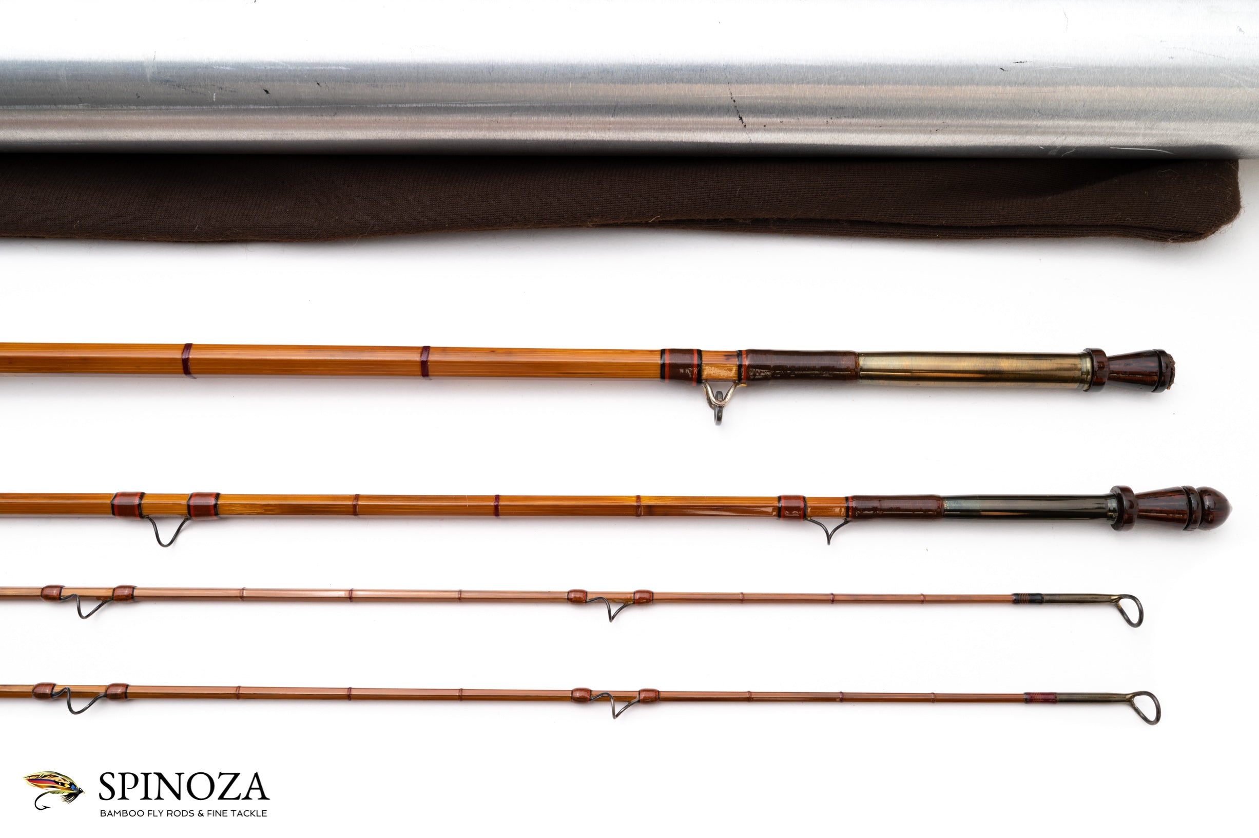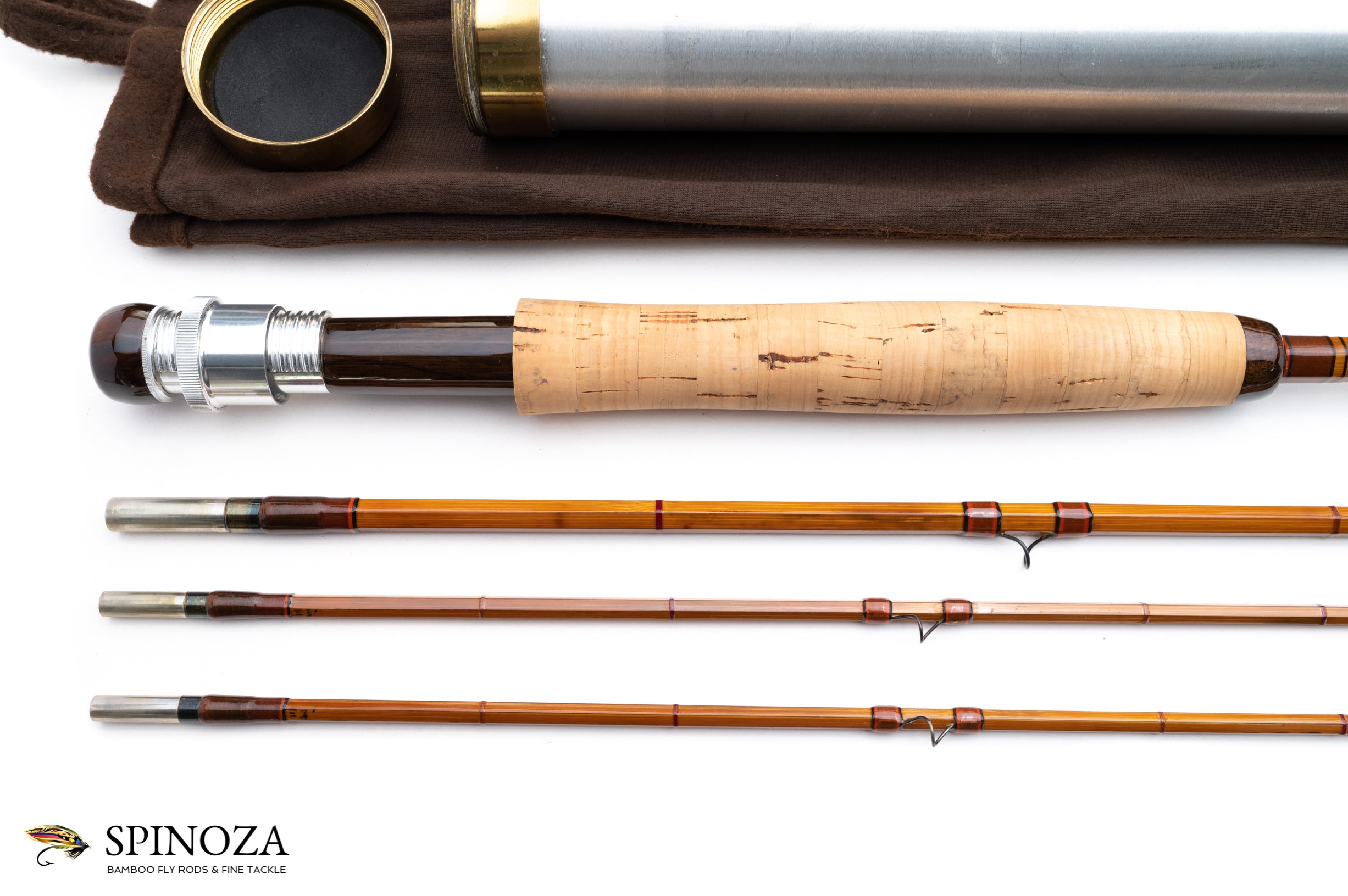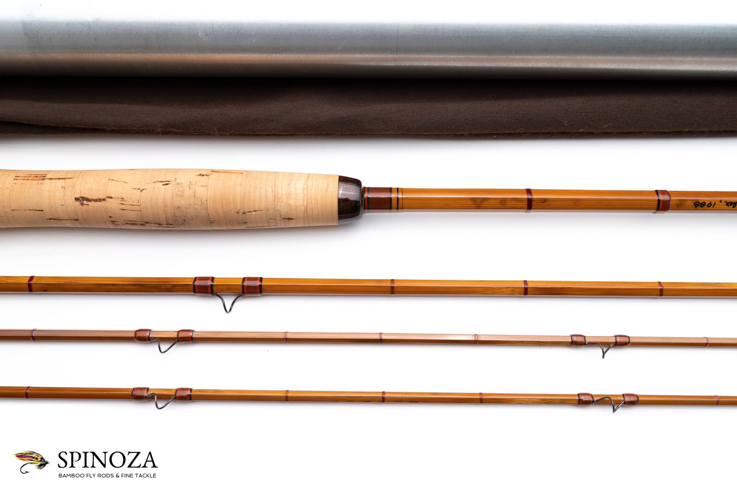 A nice Gus Nevros fly rod, 8', 3-piece, 2-tips, and built for a #6 line. 5.5 ounces. Near mint condition, with just a few tiny reel foot marks on the seat and the start of some brassing to the inner guides. The grip is clean. Fairly fast action. Medium chestnut colored cane glued with resorcinol. Spiral node pattern. Excellent varnish. The main wraps are brown with orange and black edges fore and aft. The wraps on this rod appear to be coated with epoxy. There are two carbide strippers on the butt and black snake guides and tip tops. A build date of September 1988 and the previous owner's name are inked on the butt. The grip is 6" long and one in a western style profile with a hidden pocket cap. A signature of Gus's work was the 1/2" varnished front cork check of walnut, the grain aligned with the wrap flat and the walnut seat spacer and the 1/2" ball at the bottom of the uplocking screwlock. Gus once showed me a 6-sided broach he used on the reel seats to ensure alignment to the wrap flat. The seat is an uplocking aluminum screwlock. The walnut ball at the end of the screwlock has a brass disc insert with a large "N" engraved. The ferrules for this rod are oxidized swiss. Ferrule plugs of wood, brass, and cork are done in a finial style. Unfortunately the plug for the butt has the top of the finial broken off. The rod bag is a soft dark brown cloth and includes a pocket for the ferrule plugs and a set of rubber grippers to take the rod apart. The rod tube is brushed aluminum with a brass collar and top from the Rodon Co.