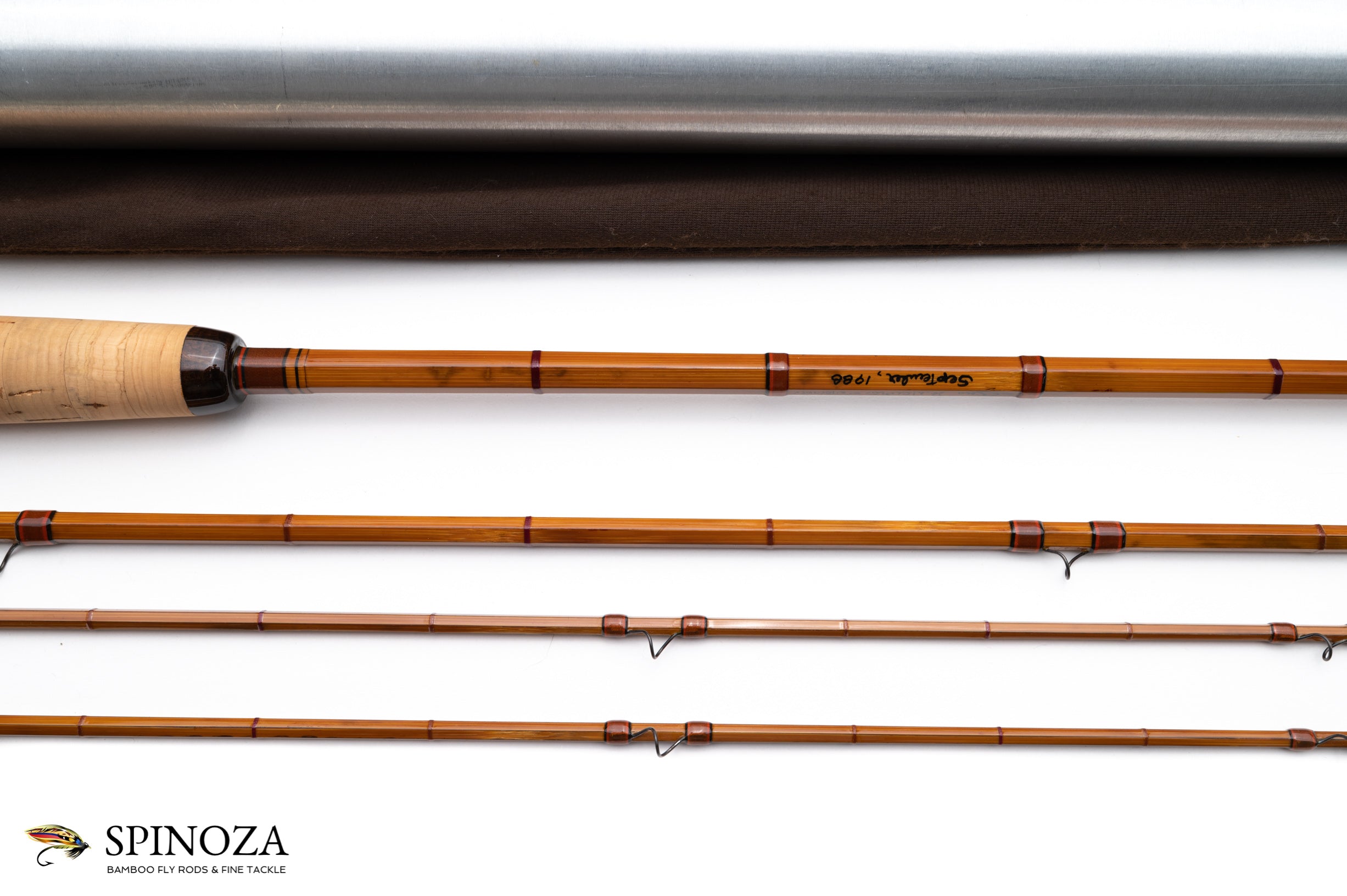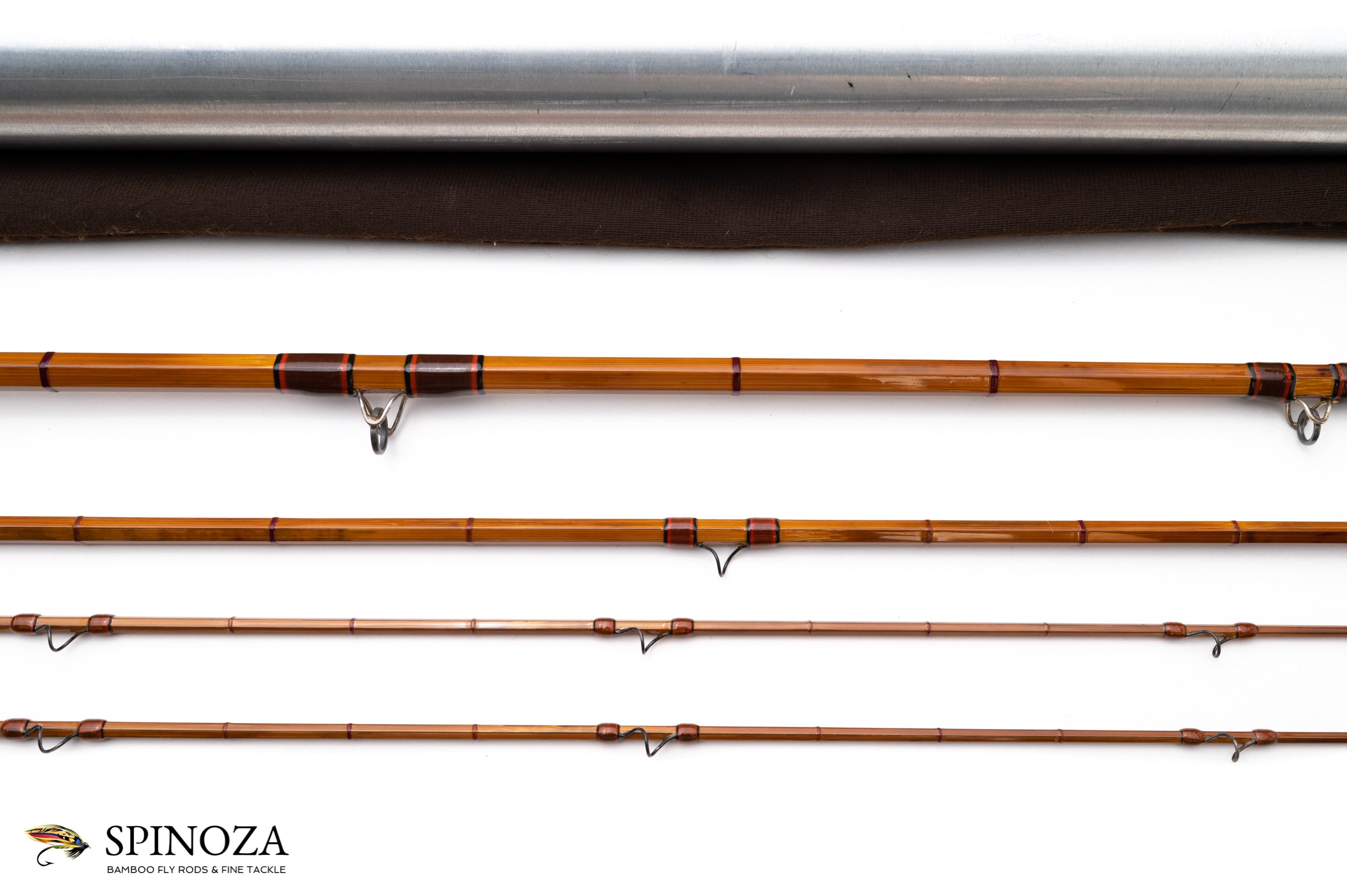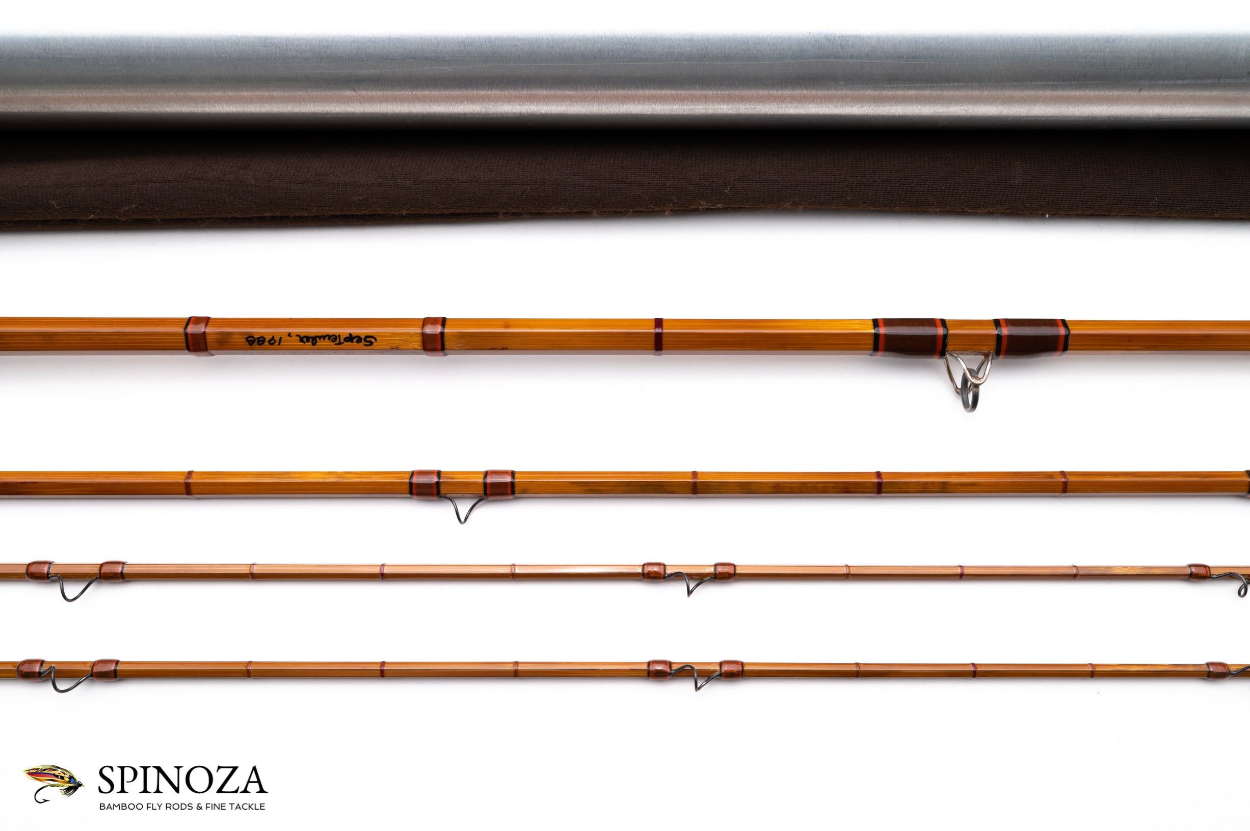 A nice Gus Nevros fly rod, 8', 3-piece, 2-tips, and built for a #6 line. 5.5 ounces. Near mint condition, with just a few tiny reel foot marks on the seat and the start of some brassing to the inner guides. The grip is clean. Fairly fast action. Medium chestnut colored cane glued with resorcinol. Spiral node pattern. Excellent varnish. The main wraps are brown with orange and black edges fore and aft. The wraps on this rod appear to be coated with epoxy. There are two carbide strippers on the butt and black snake guides and tip tops. A build date of September 1988 and the previous owner's name are inked on the butt. The grip is 6" long and one in a western style profile with a hidden pocket cap. A signature of Gus's work was the 1/2" varnished front cork check of walnut, the grain aligned with the wrap flat and the walnut seat spacer and the 1/2" ball at the bottom of the uplocking screwlock. Gus once showed me a 6-sided broach he used on the reel seats to ensure alignment to the wrap flat. The seat is an uplocking aluminum screwlock. The walnut ball at the end of the screwlock has a brass disc insert with a large "N" engraved. The ferrules for this rod are oxidized swiss. Ferrule plugs of wood, brass, and cork are done in a finial style. Unfortunately the plug for the butt has the top of the finial broken off. The rod bag is a soft dark brown cloth and includes a pocket for the ferrule plugs and a set of rubber grippers to take the rod apart. The rod tube is brushed aluminum with a brass collar and top from the Rodon Co.