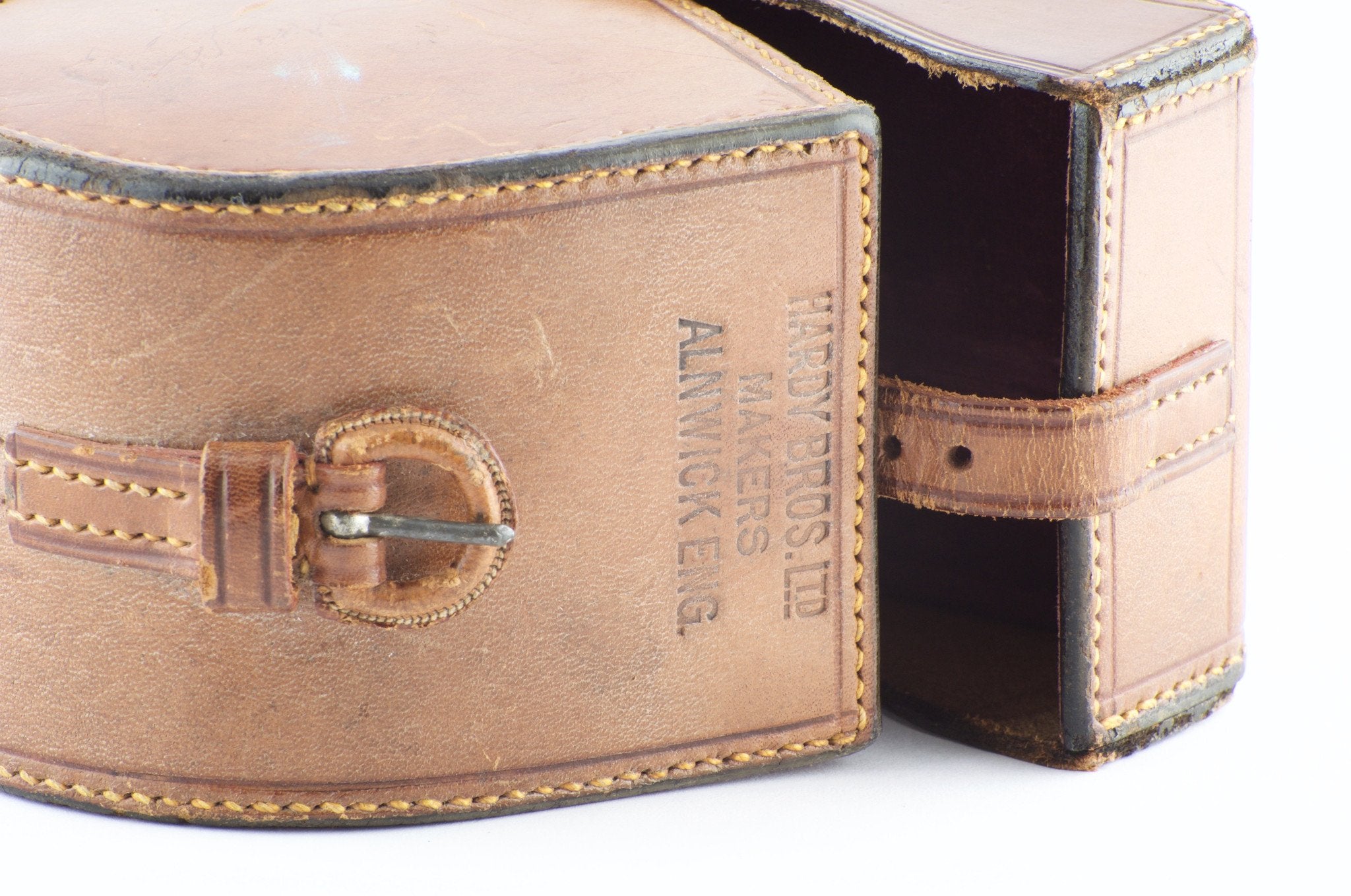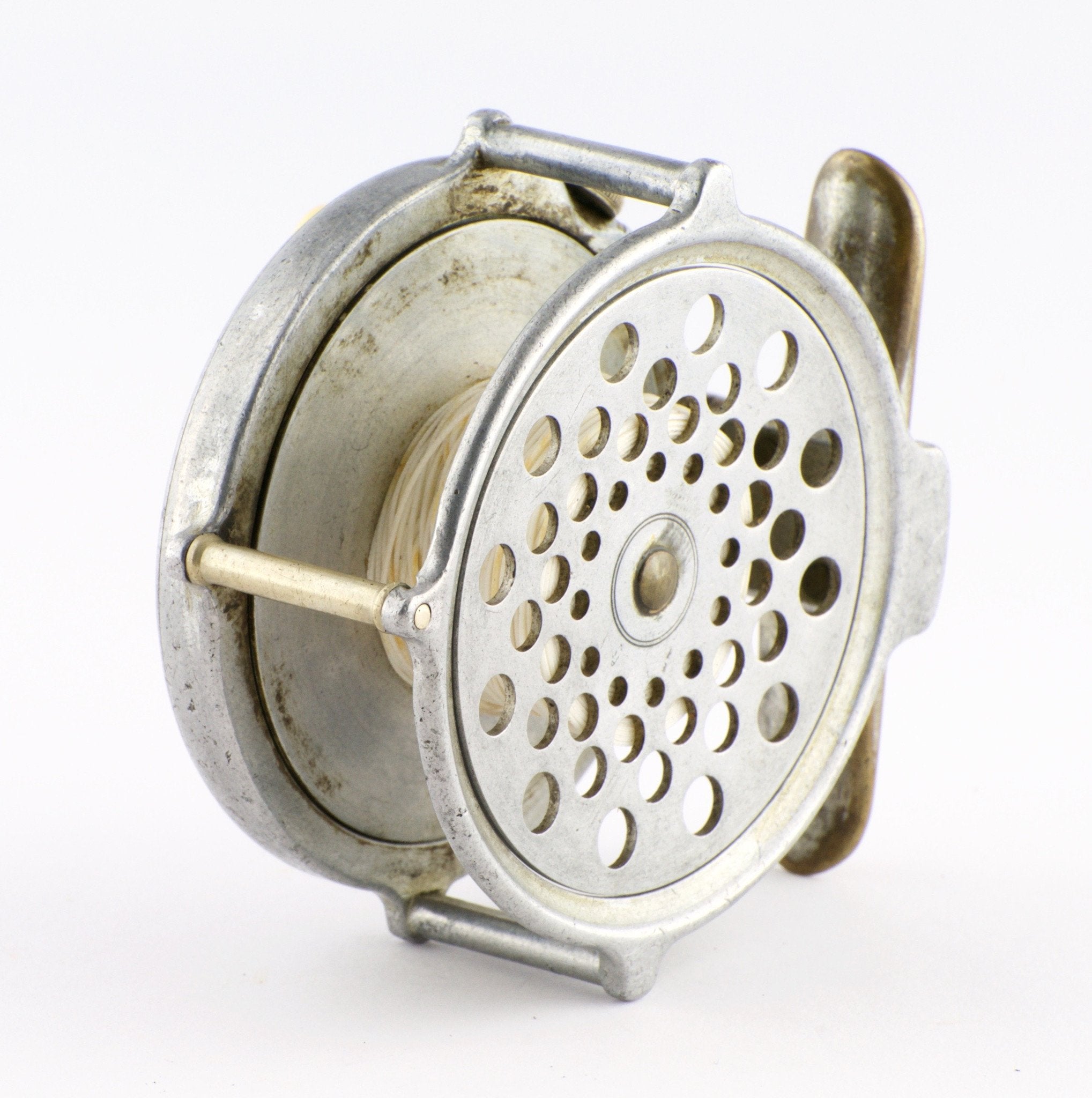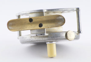 For sale here is an original Hardy Bougle fly reel in good, original condition. 3" diameter. Right hand retrieve. Badged inside for retailer VL&D in New York. Circa mid to late 1920s. Full-length and unaltered reel foot. The ivory handle remains in sound and free-spinning condition. The nickel silver rim tension regulator screw works perfectly. Duplicated MKII check with two engageable pawls (the spare pawl is missing). The springs have been shaped slightly but this doesn't affect the out-going tension strength. Mechanically the reel remains in very fishable condition with a bit of spindle/spool movement. No cracks/chips anywhere on the reel. Included with sale is the Hardy D-block leather reel case shown. This case wasn't specifically made for this reel, but it fits it rather well and is worth $200-$250 on its own. Where else can you find a fishable original Bougle for this price? Snag it while you can!