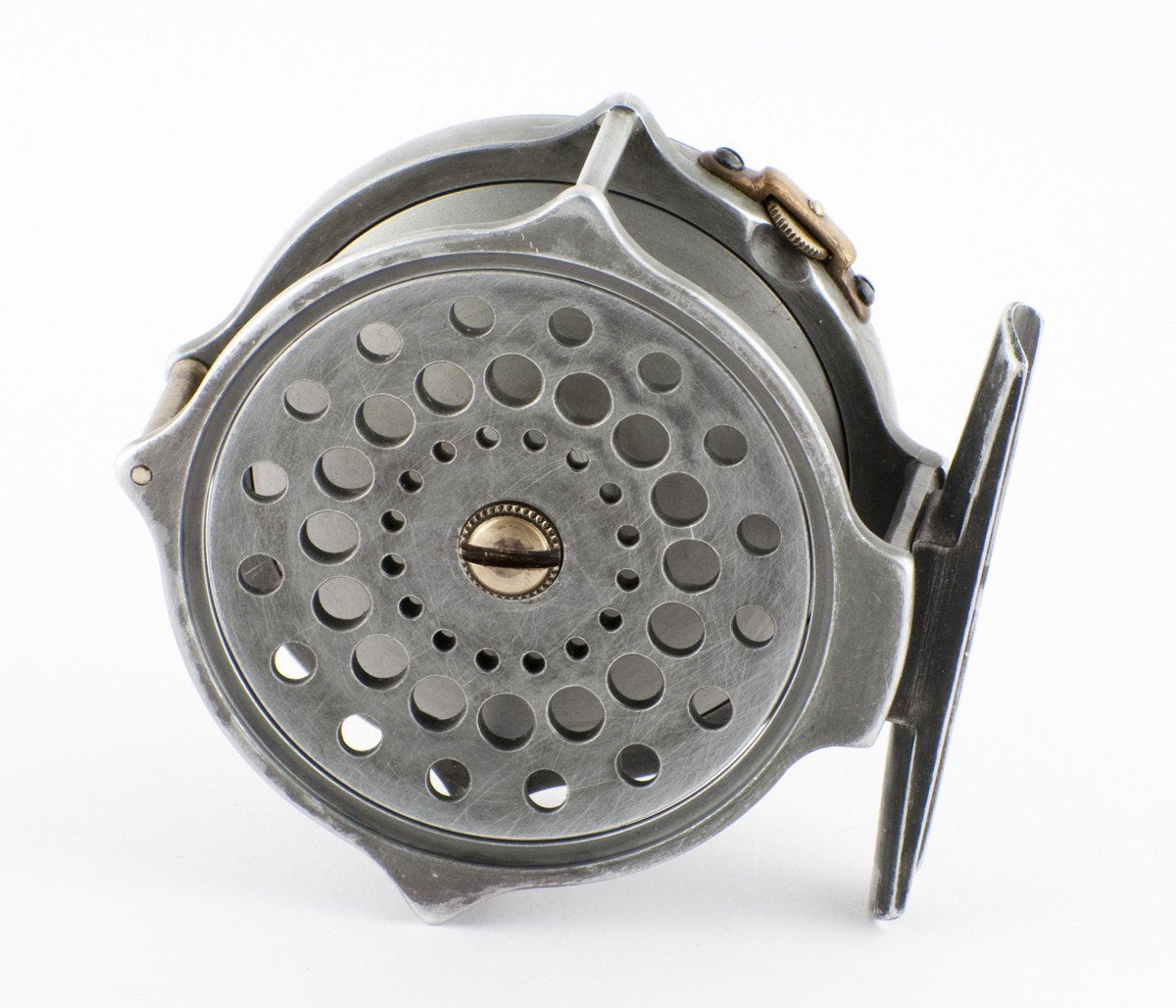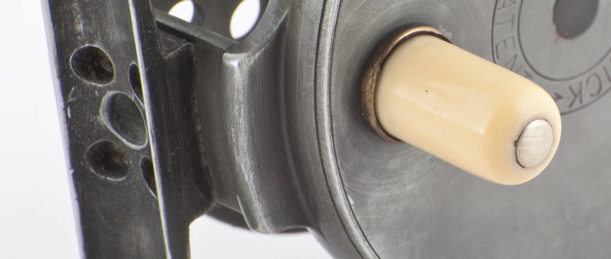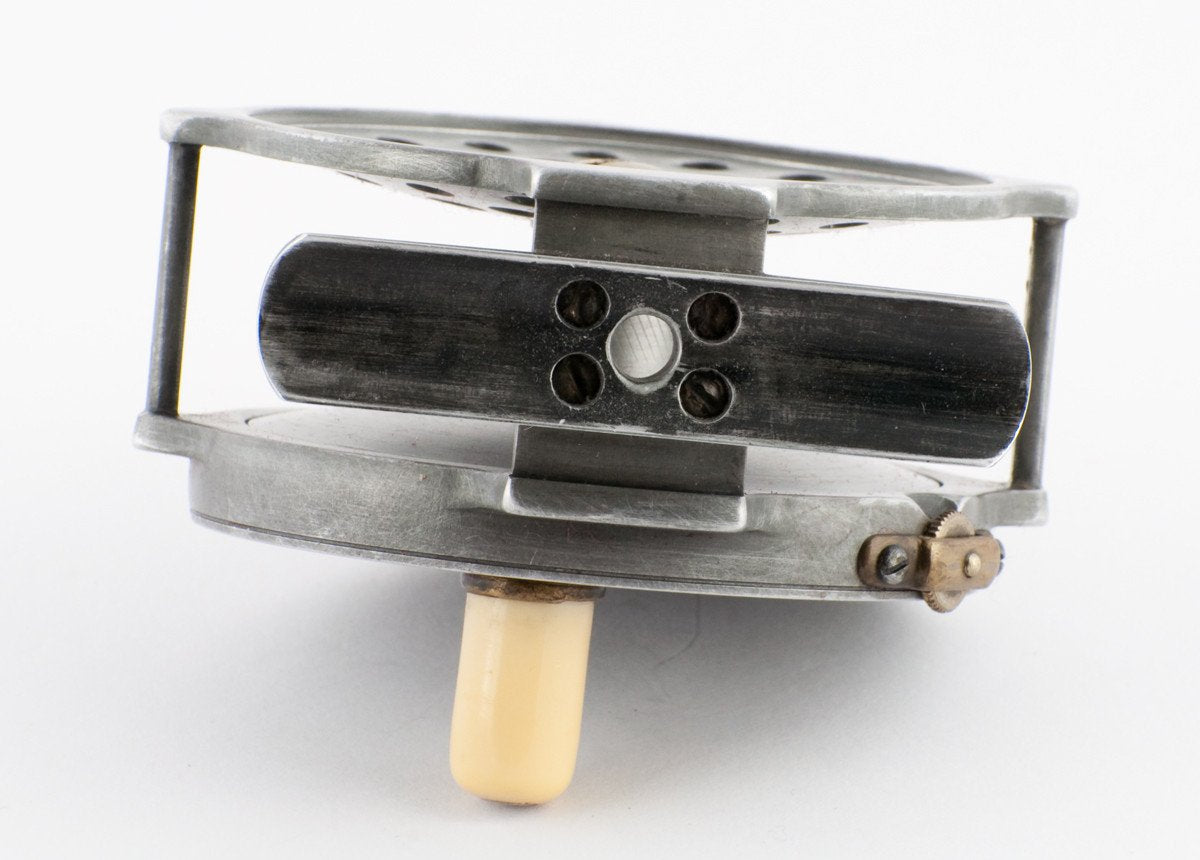 For sale here is an extremely scarce, original Hardy Bougle fly reel in excellent+ condition. 3" diameter. The full-length smooth foot is made from the same alloy as the reel and is attached with 4 screws. It has an ivorine handle, nickel silver rim tension regulator screw with brass bridge. The check dates the reel between 1903 and 1905. The drum locks by means of a left-hand threaded screw. Stamped inside on the frame, spool and winding plate is “1". The bottom pillar is a roller pillar. The length of the reel foot is 2 7/16".