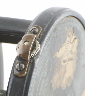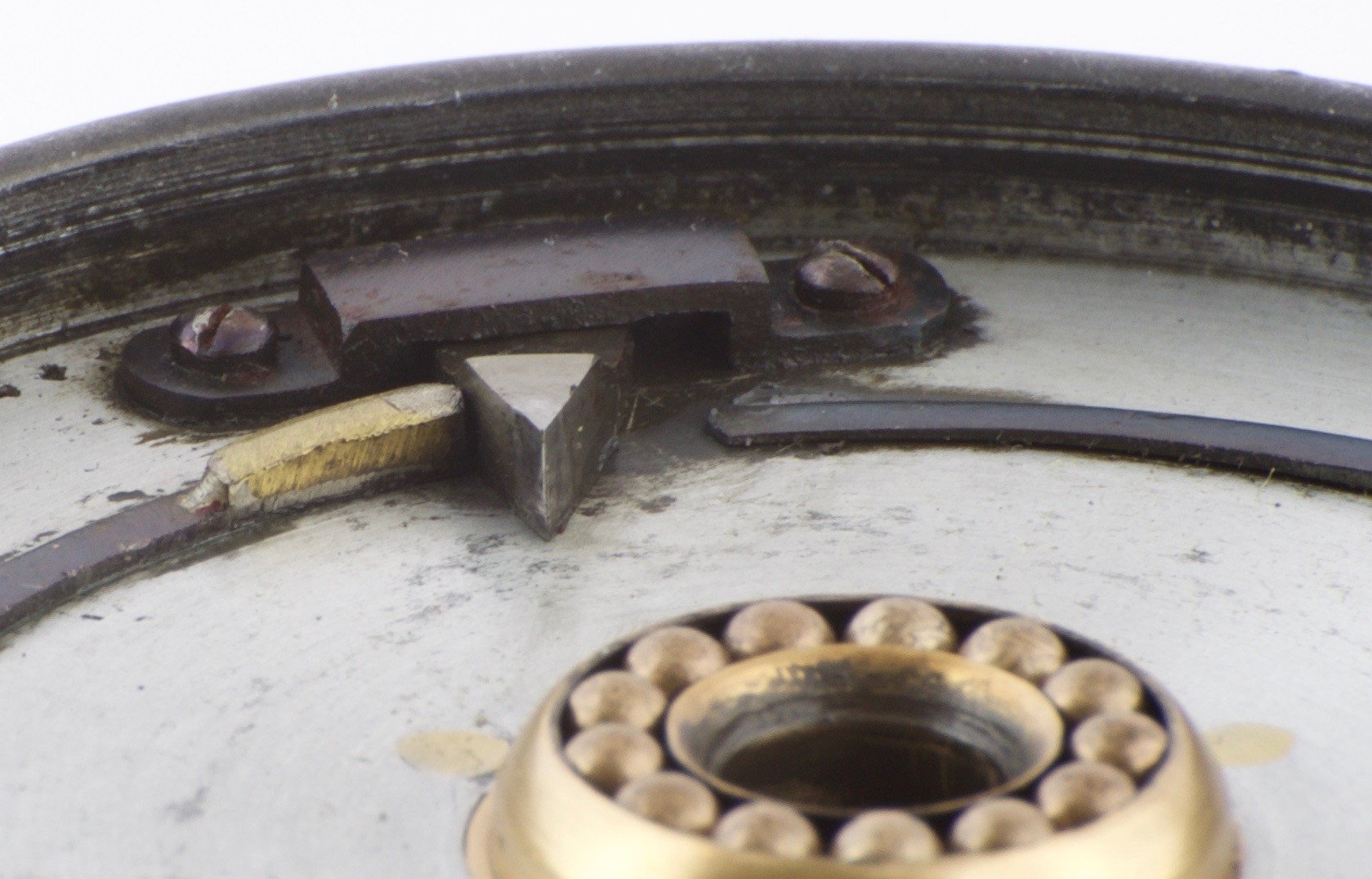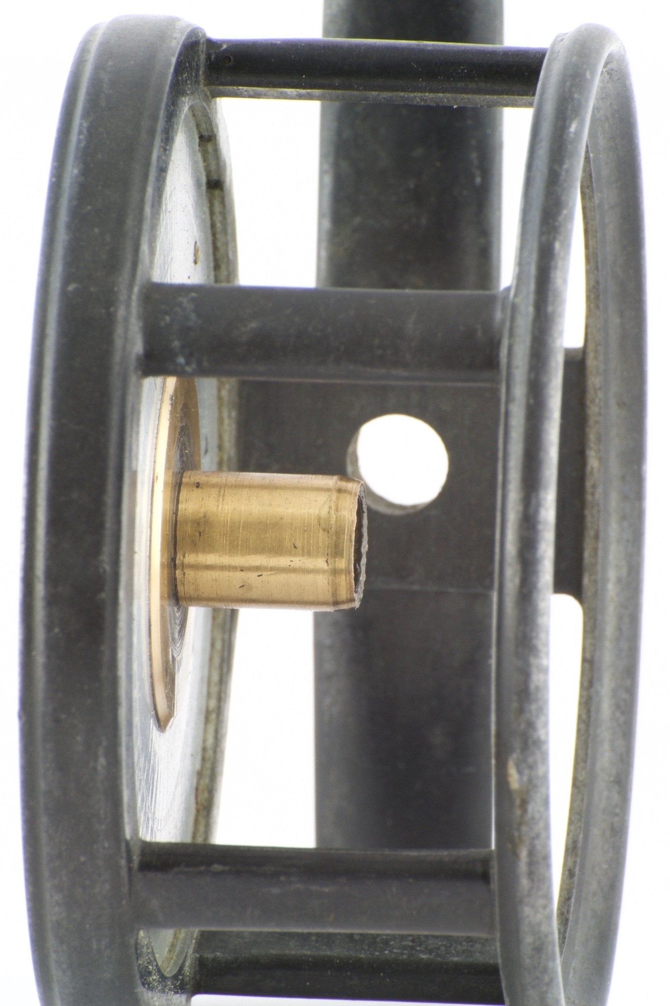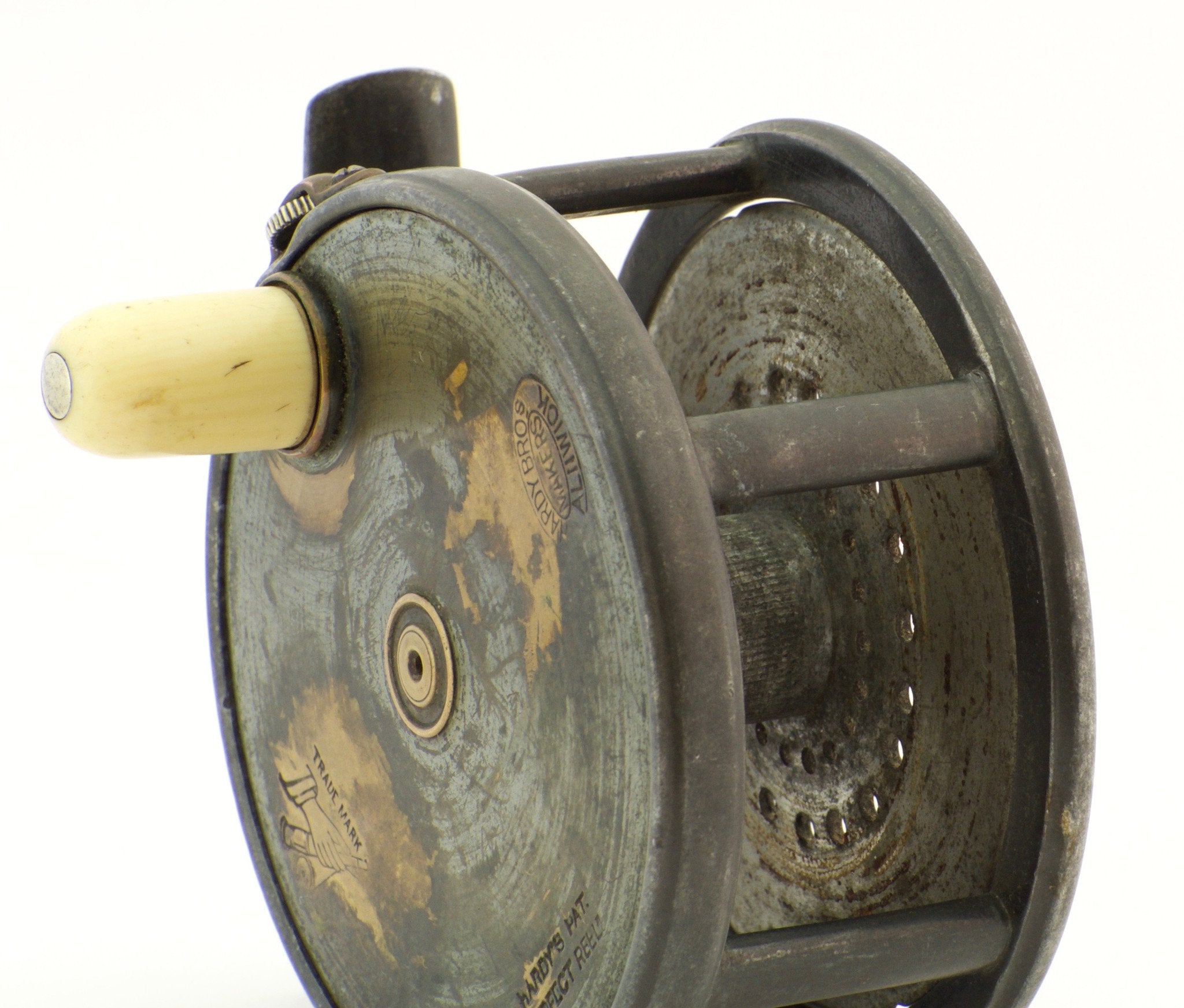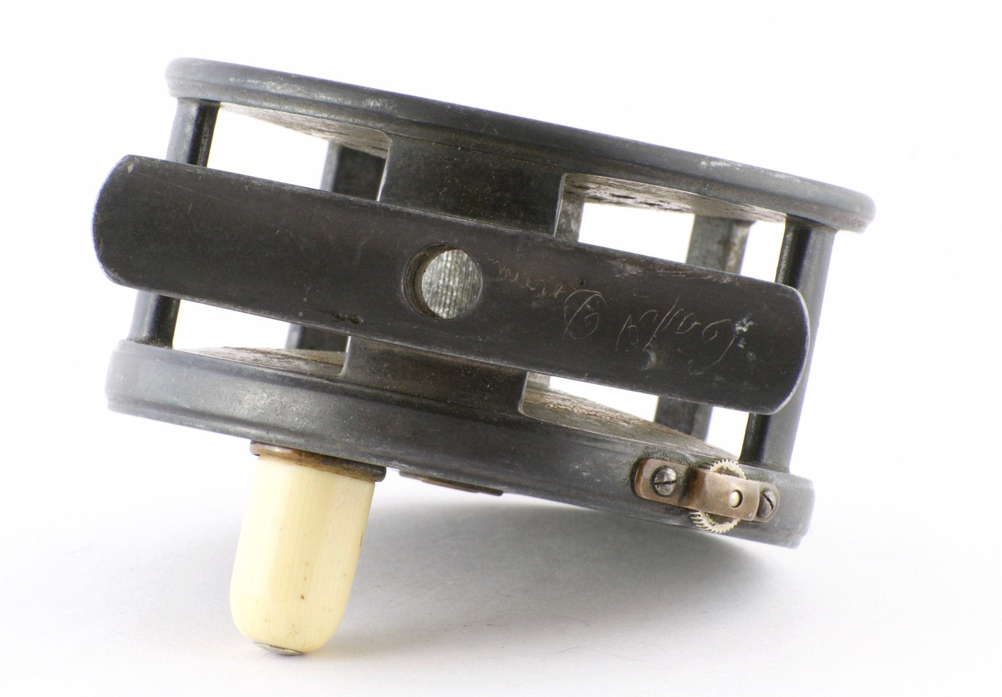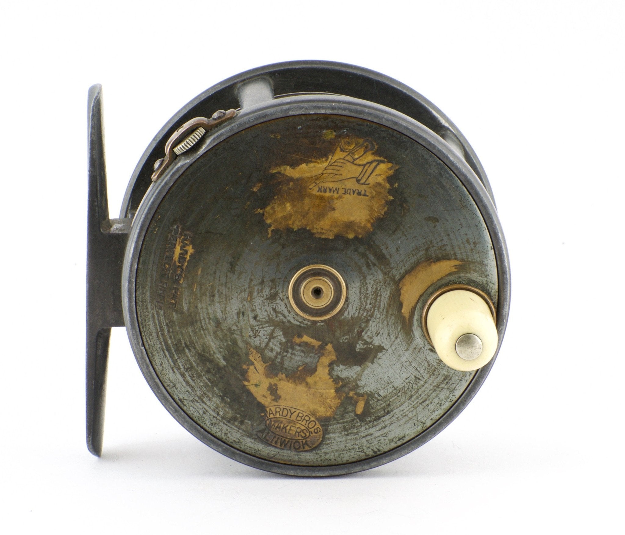 For sale here is a scarce brass face Hardy Perfect wide drum fly reel - 3 1/2" diameter with Hardy's 1896 check. Excellent plus original condition. Brilliant external finish remaining. Full length cast foot is unmolested, other than some faint etchings. Ivory handle spins freely. All parts stamped "4". Nice tight reel mechanically. No issues to speak of. No line burns on the pillars. This is a very nice example and very clean.