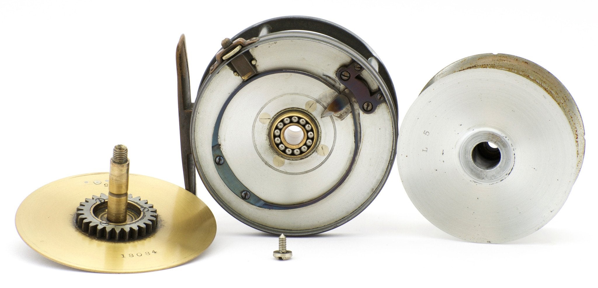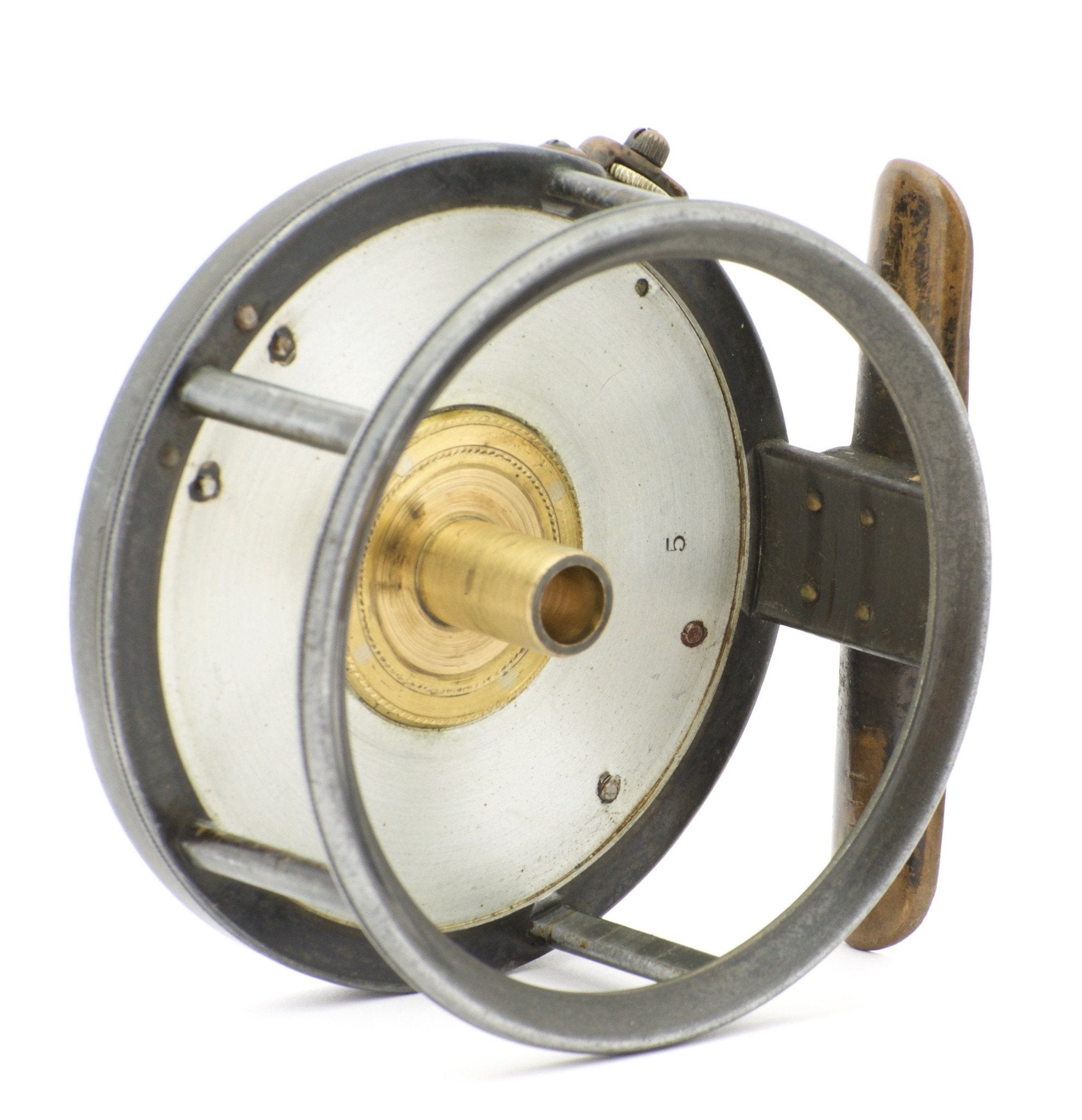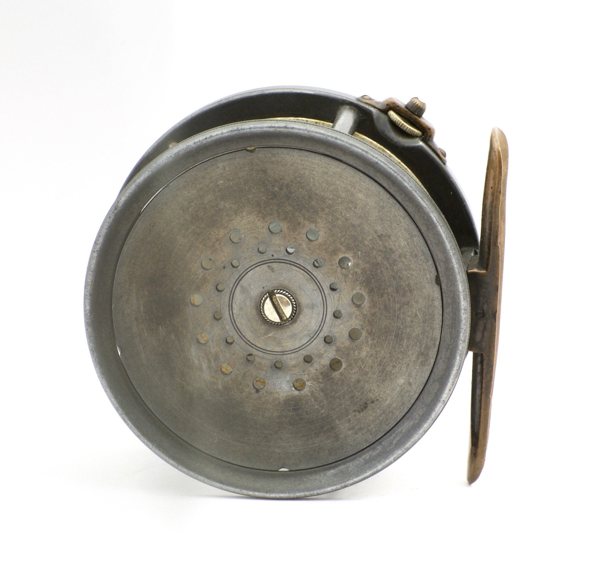 For sale here is a scarce brass face Hardy Perfect wide drum fly reel - 4" diameter with 1905 check. Excellent plus original condition. Full length foot is unmolested. Ivory handle spins freely. Stamped "5" throughout. Nice condition mechanically with no overly objectionable wobble. No cosmetic issues to speak of other than some extremely faint initials on the winding plate. There is some silk line residue on the spool flanges, but no corrosion. No cracks exist. The reel weighs 15.85 oz. The reel foot measures 3 3/4". Get this bad boy back on the river!