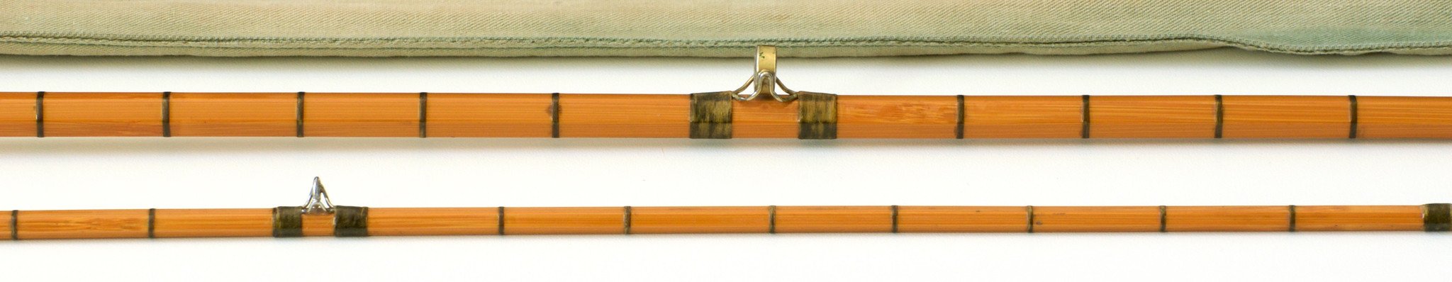 For sale here is a Hardy CC DeFrance bamboo fly rod made in 1955. Weighs 5 oz. 9 feet in length, two sections with one tip, as was typical with the CC DeFrance rods. Serial H608. Medium blonde cane, agate stripper, oxidized brass ferrules, cigar grip, bright aluminum cap and ring over cork, dark olive silks with full intermediates, ferrule plug. The rod is in very good original condition. Medium action for a 6-7 weight line. The ferrules are size 17/64. All sections are full-length and reasonably straight. Comes with its original labeled bag and an aftermarket leather tube.