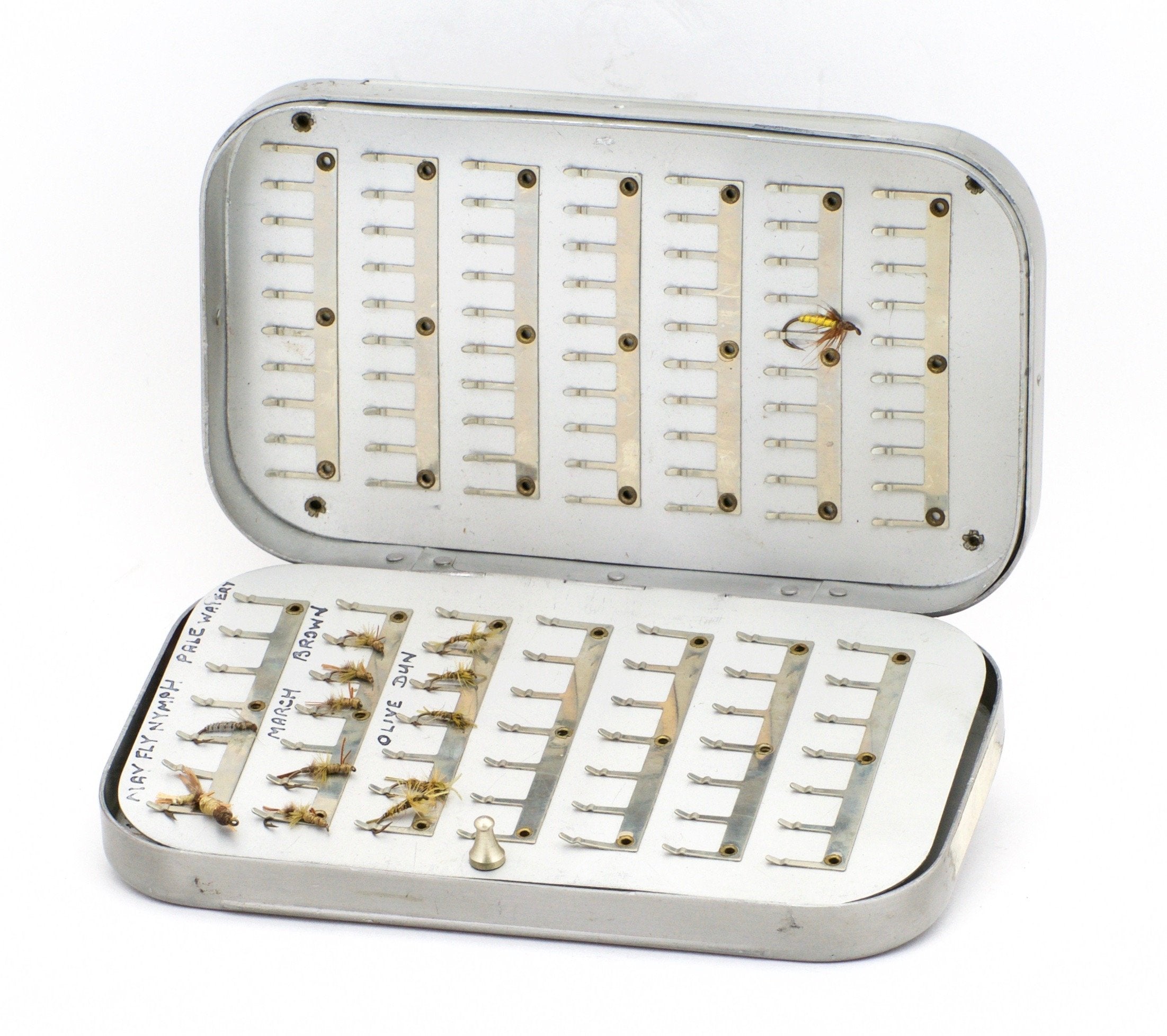 For sale here is a Hardy fly box w/clips. One side stuffed with flies -- 100+ total and all appear unused. A prior owner engraved the back of the box and well as labeled some of the clip rows internally. These flies are extremely nicely tied!