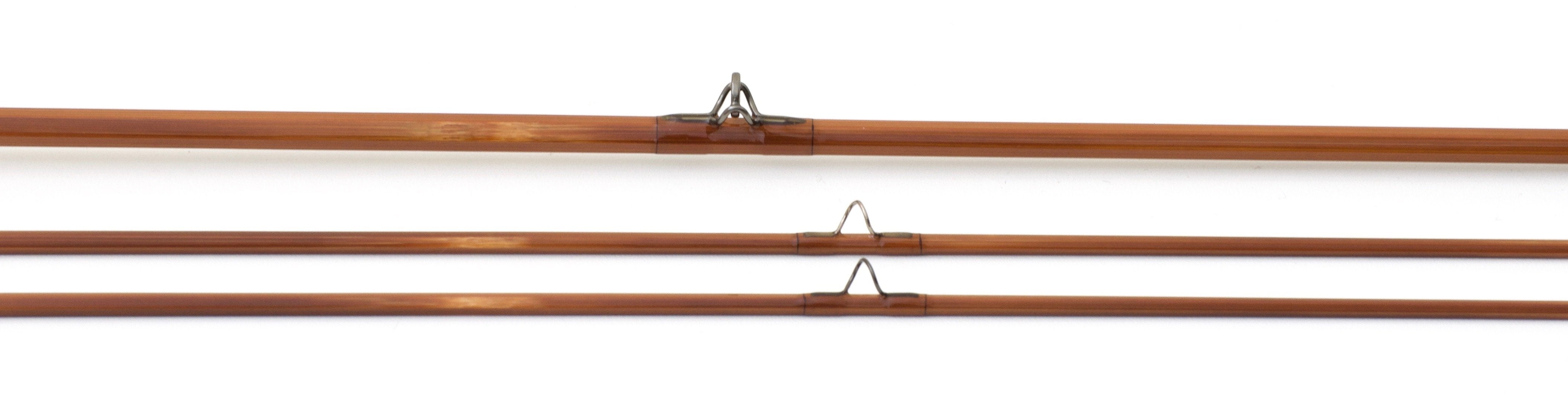 The rod features mirrored tips. Moderately tempered cane with transparent wraps and fine oxblood tipping. Blued hardware throughout. Garrison-style hook keeper. Nickel silver checks. Hallmark swelled butt. The cigar grip measures 5 1/2" in length. Elegant nickel silver cap and ring reel seat over a beautifully figured mortised burl walnut spacer. Hardy Bros. maker stamp on the butt cap. The truncated Swiss-style ferrules have a perfect fit. Includes a fine ferrule plug. The rod weighs 2.75 oz. Medium fast action. Comes with the original bag with label and stiffening dowel and original labeled tube with fine brass fittings.