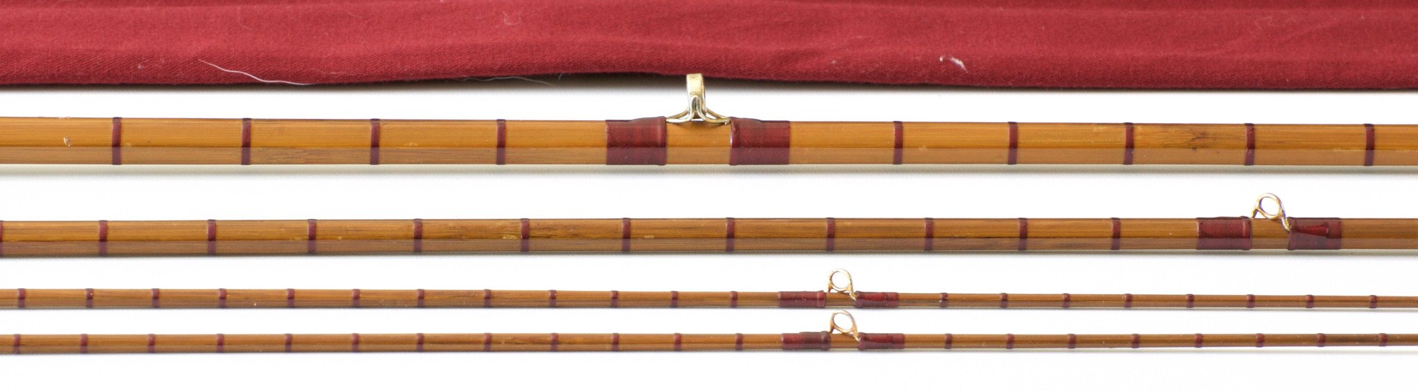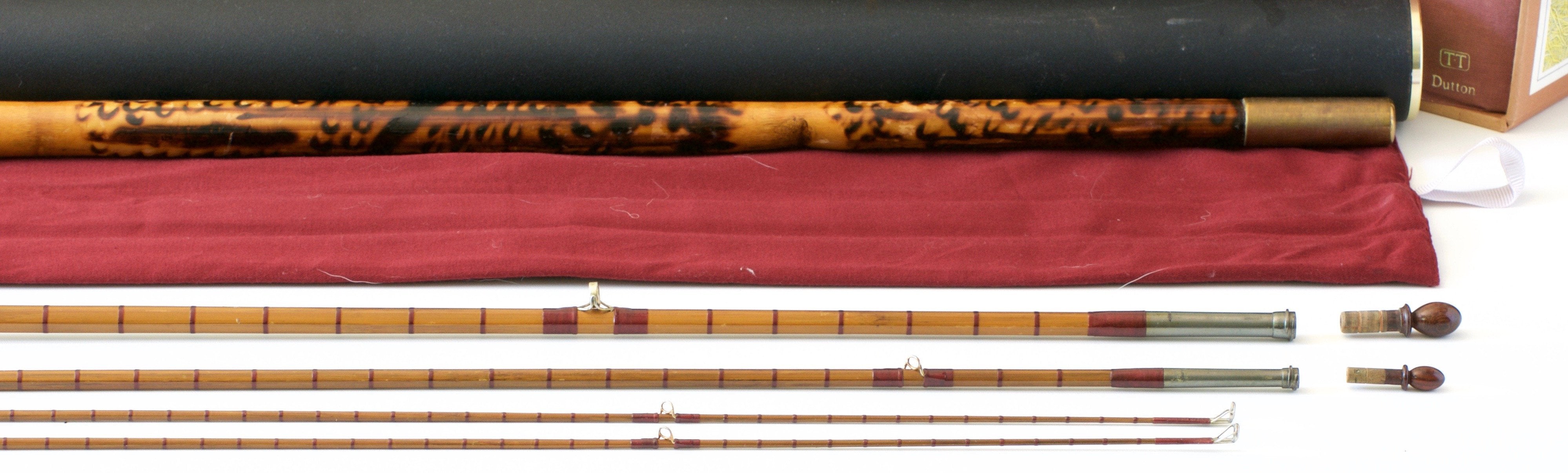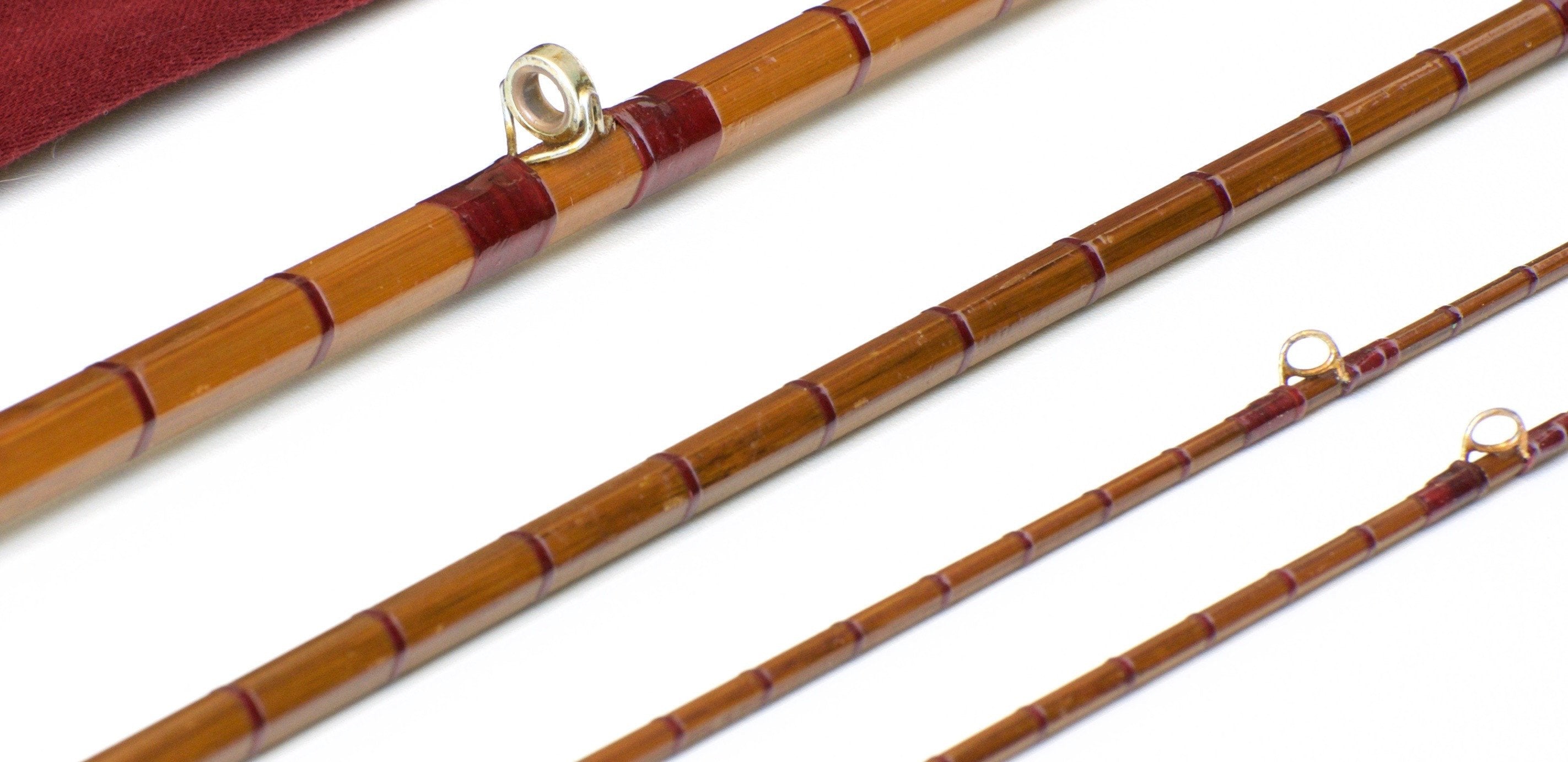 The brass ferrules are spiked and feature an interesting screw-lock mechanism. Ferrule size 10/64 and 14/64. Original ferrule plugs. Agate stripper and tip-tops. The rod weighs 8 1/4 oz. The tips are housed in a brass capped bamboo tube that's been flamed. The bag is a modern Hardy bag but appears to have been custom made to fit the bamboo tube. Replacement black powder coated tube.