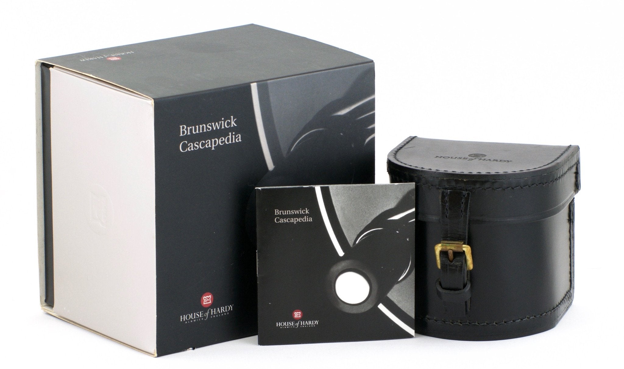 For sale here is a Hardy Brunswick Cascapedia 1/0 Ltd. Edition Fly Reel. Unused condition. Made in 1991, Hardy reissued 500 of these replicas worldwide. This one is serial #423. From the papers that come with the reel,"This trout fly reel has been hand-built by one of four Hardy master-craftsmen, who together lay claim to 116 years of reel-making experience. The maker's name is commemorated alongside the limited edition number on a stainless steel medallion on the winding plate. Another medallion displays the famous 1896 Hardy Rod-in-Hand trademark. The drum is made from highly polished bar-stock 6262 aluminium with a naval brass, integrally-machined spindle. The side-plates are polished ebonite, the rims are stainless steel, the reel seat is brass nickel, and the pillars, drag selector and check button are finished in polished nickel silver.The reel weighs 9.2 oz and measures 2 7/8" diameter, 1 1/8" width. Left hand retrieve. Rated for a 5wt line and 50 yards of backing. Reel was made by D. Brown. Comes with black Hardy block leather case, reel manual, white gloves, and original box, all in new condition. The box has a scuff or two on it.