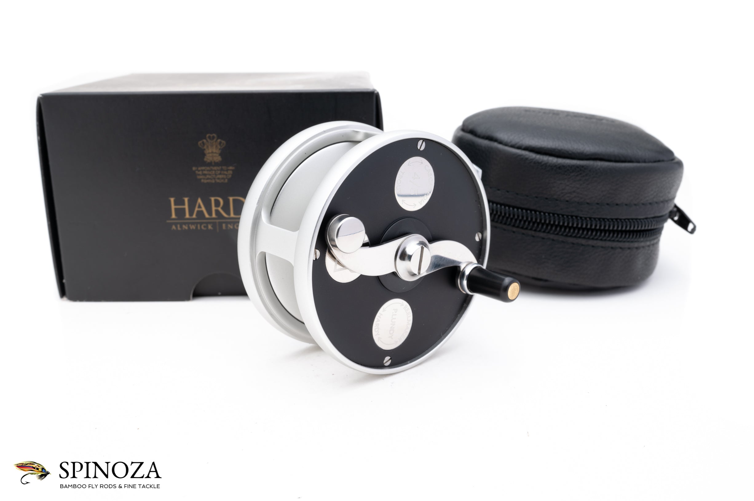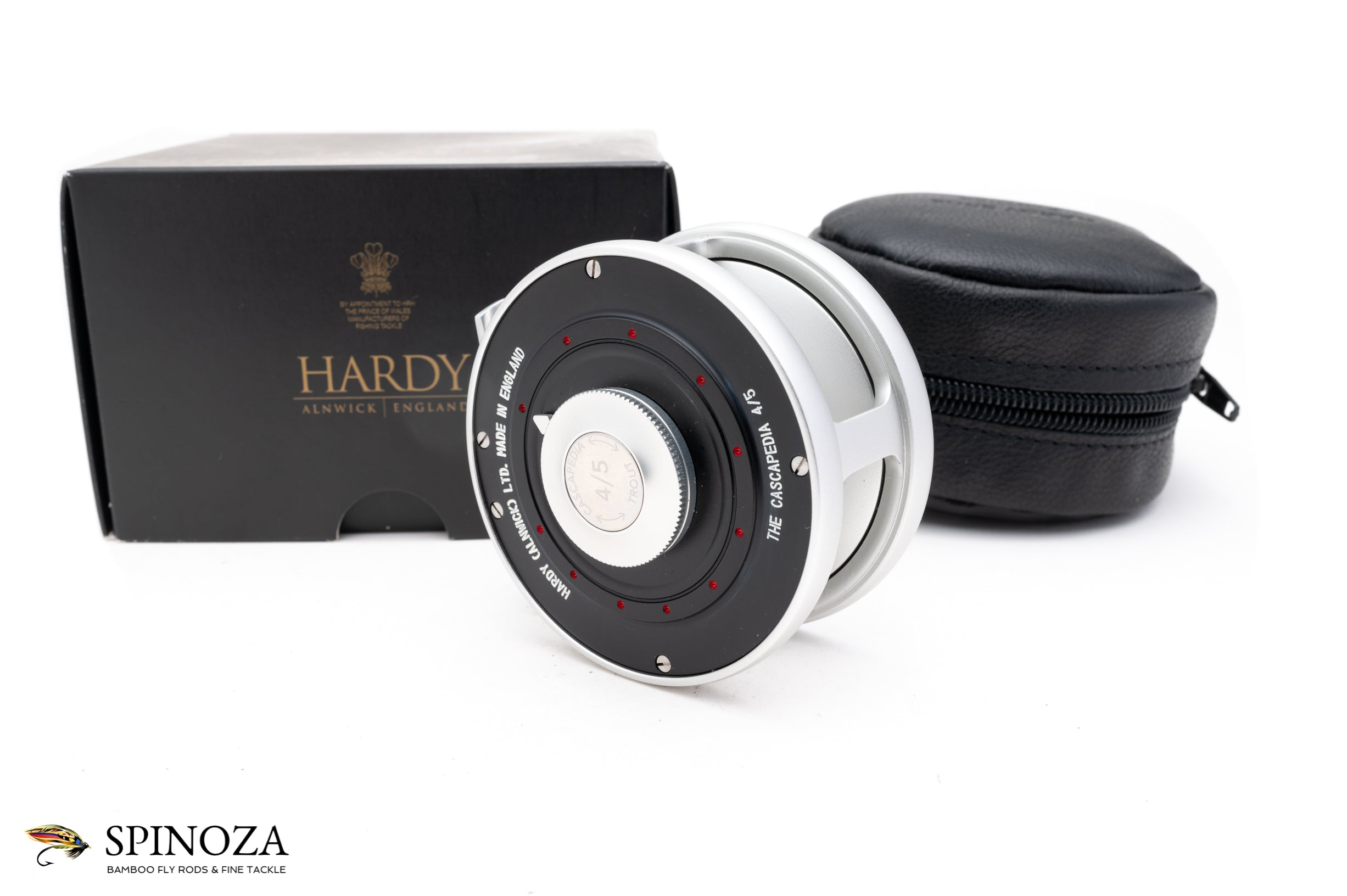 A Hardy Cascapedia trout fly reel in the 4/5 size. This is Hardy's contemporary version of this reel and made in England. 3" in diameter with a 7/8" spool width. Set up for LHW. Matte silver frame with black sideplates, and the crankplate has three medallions while the faceplate has the drag adjuster dial with eleven drag settings. The reel appears to be mint, unused. It packs into the original leather zipper pouch and box with the original paperwork.