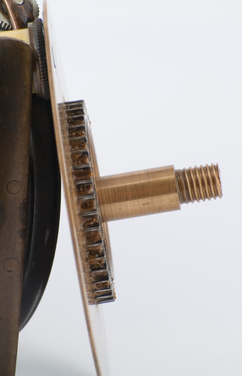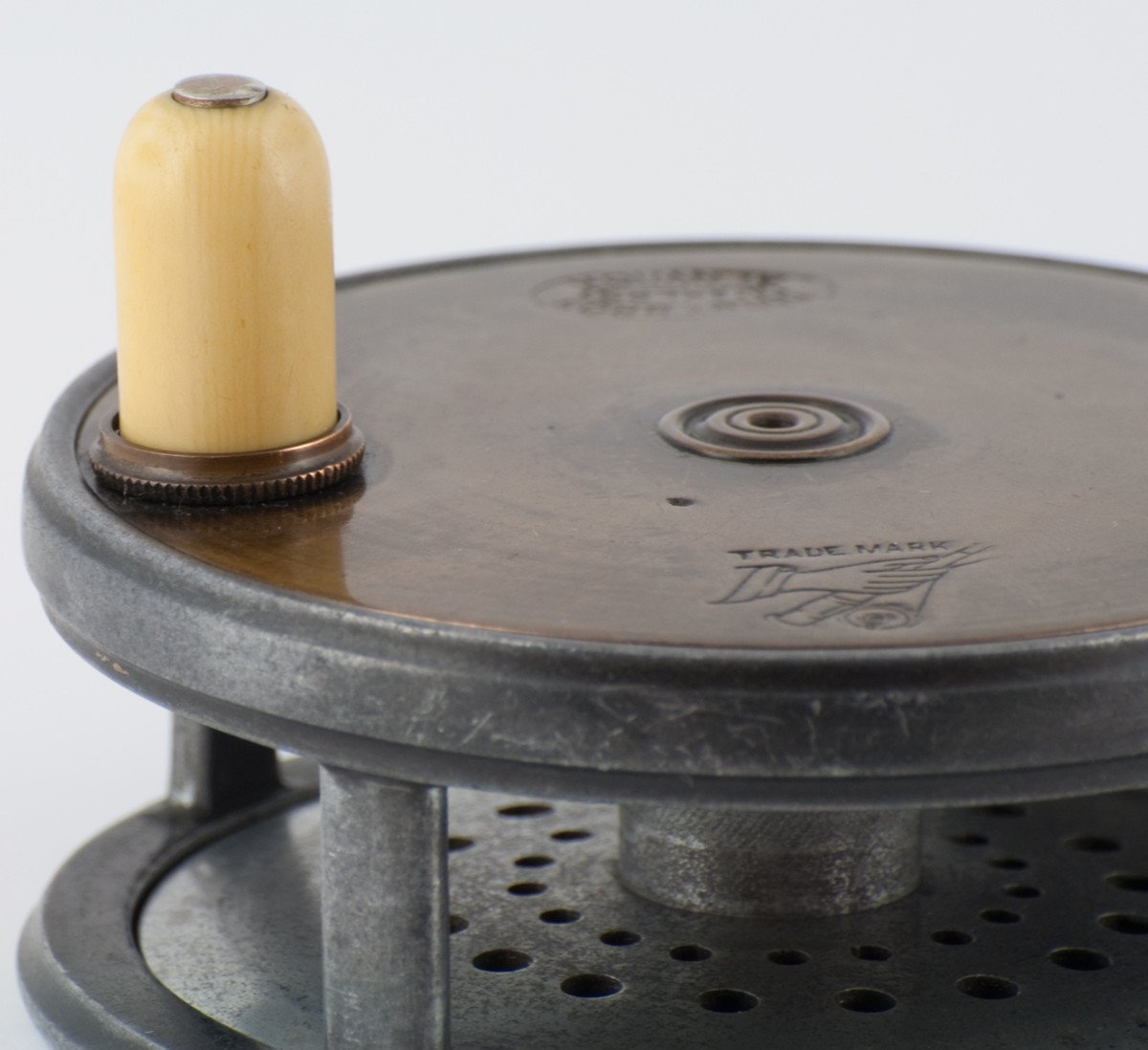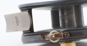 For sale here is an extremely scarce contracted model Hardy Brass Face Perfect fly reel - 3 1/8" diameter with 1896 check and all three logos on the winding plate. The patina of this brass face as well as the logo clarity are simply stunning! The leading on the spool and frame is excellent. Cosmetically and functionally the reel is in original and excellent+++ condition. Nice and tight spool/spindle fit. Full length original foot. Ivory handle spins freely. The tensioner works perfectly. Four cusps on the spool. Matching stamps throughout. One ball bearing missing? You can decide from the photos. Don't miss out on acquiring this reel -- I will venture to say that any collector would be very lucky to find another one in this condition.