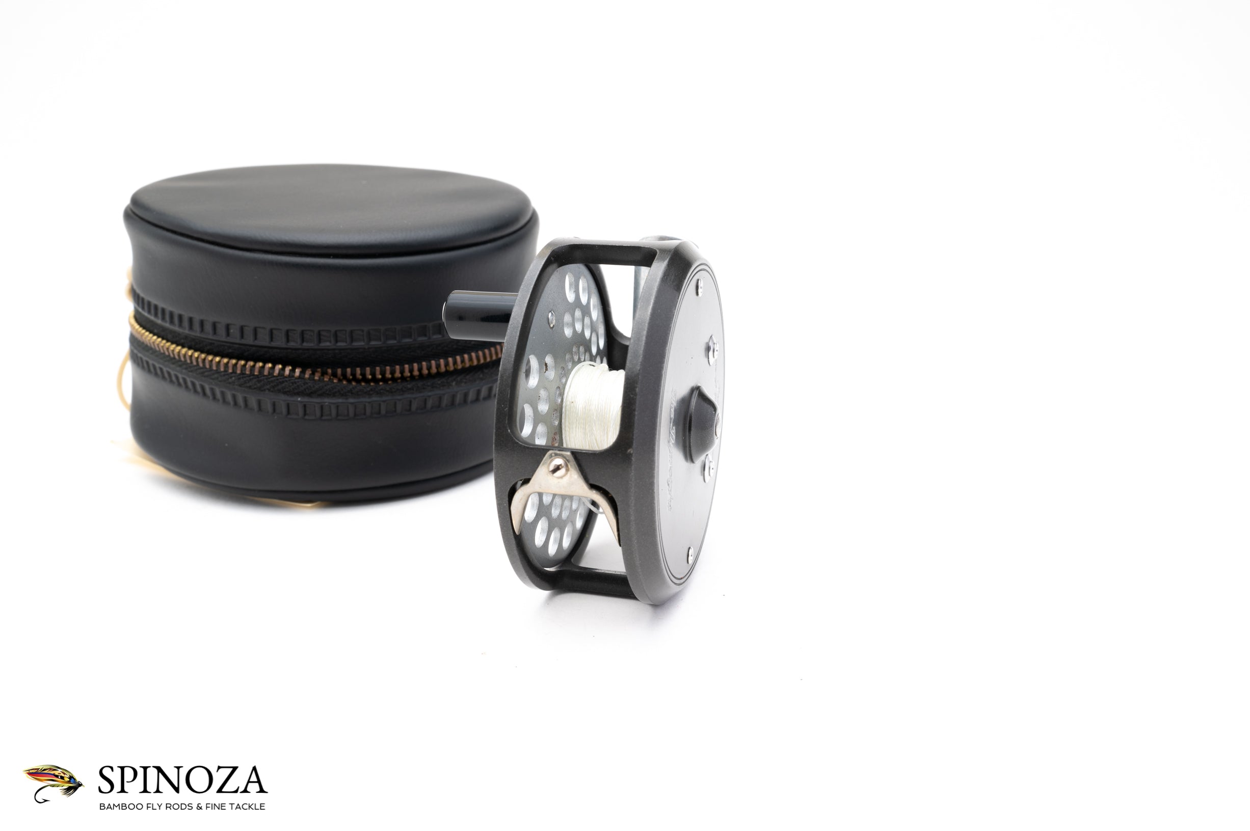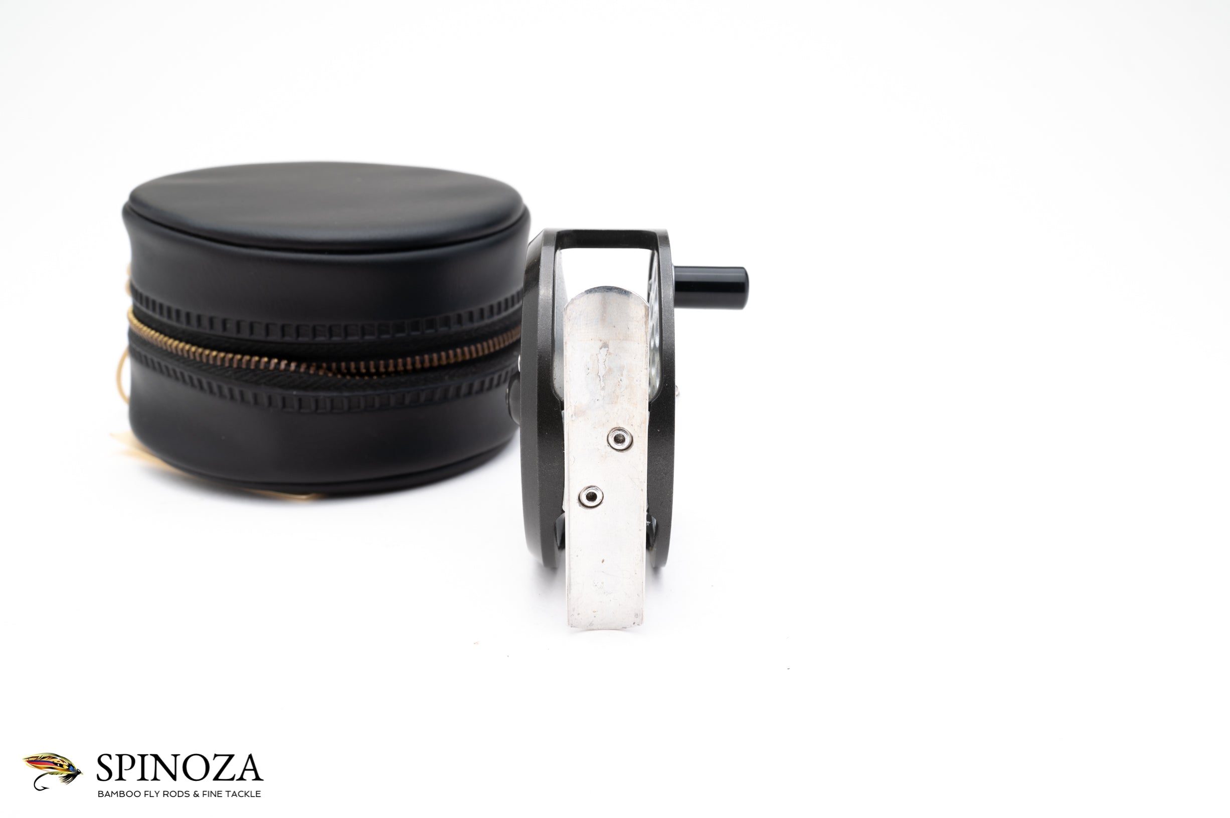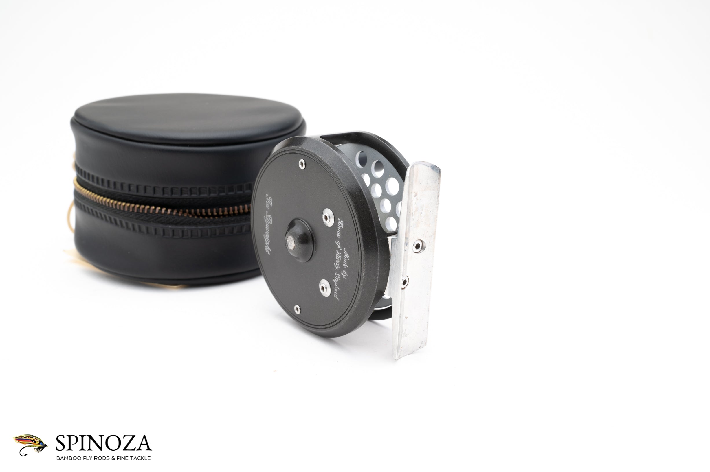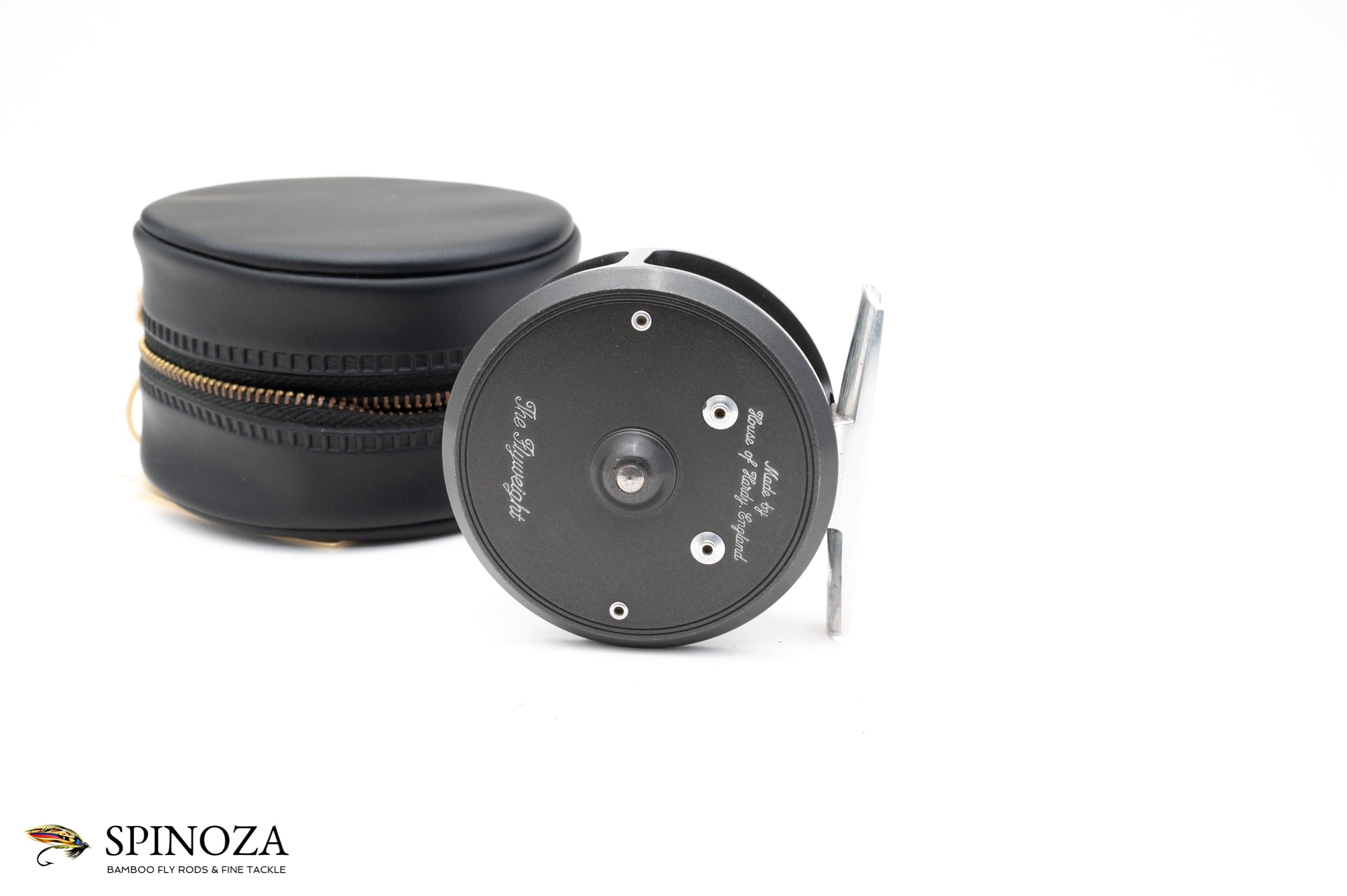 A nice little Hardy Flyweight fly reel, currently set up for LWH (though easily reversible). 2 1/2" diameter. Reversible nickel silver line guard. Smooth alloy foot. Two-screw latch plate. Excellent used condition with some mounting marks on the foot but very clean overall. Capacity is up to a DT4 with no backing or a WF3+50yds. Comes with a black vinyl Hardy leather case with the original paperwork tucked inside.