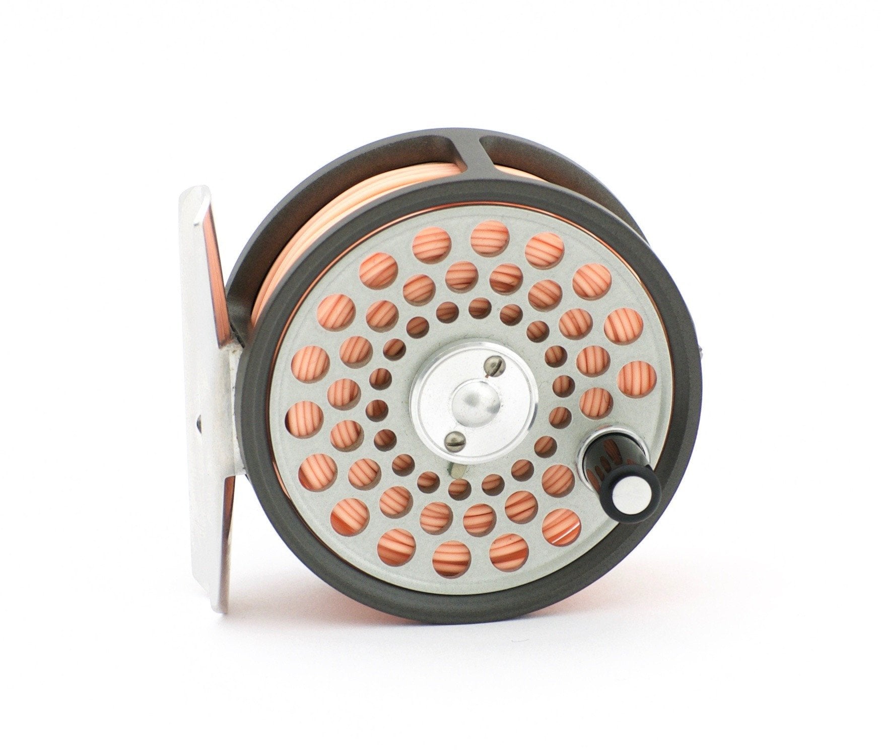 For sale here is a Hardy Flyweight fly reel in near mint condition. Made in England. 2 1/2" diameter. Smooth alloy foot. Two-screw latch plate with single-screw reversible nickel silver line guard. RHW or LHW. Capacity is up to a DT4 with no backing or a WF3+50yds. Comes with its original blue Hardy zippered case. Loaded with a like new Cortland Peach line ready to fish!