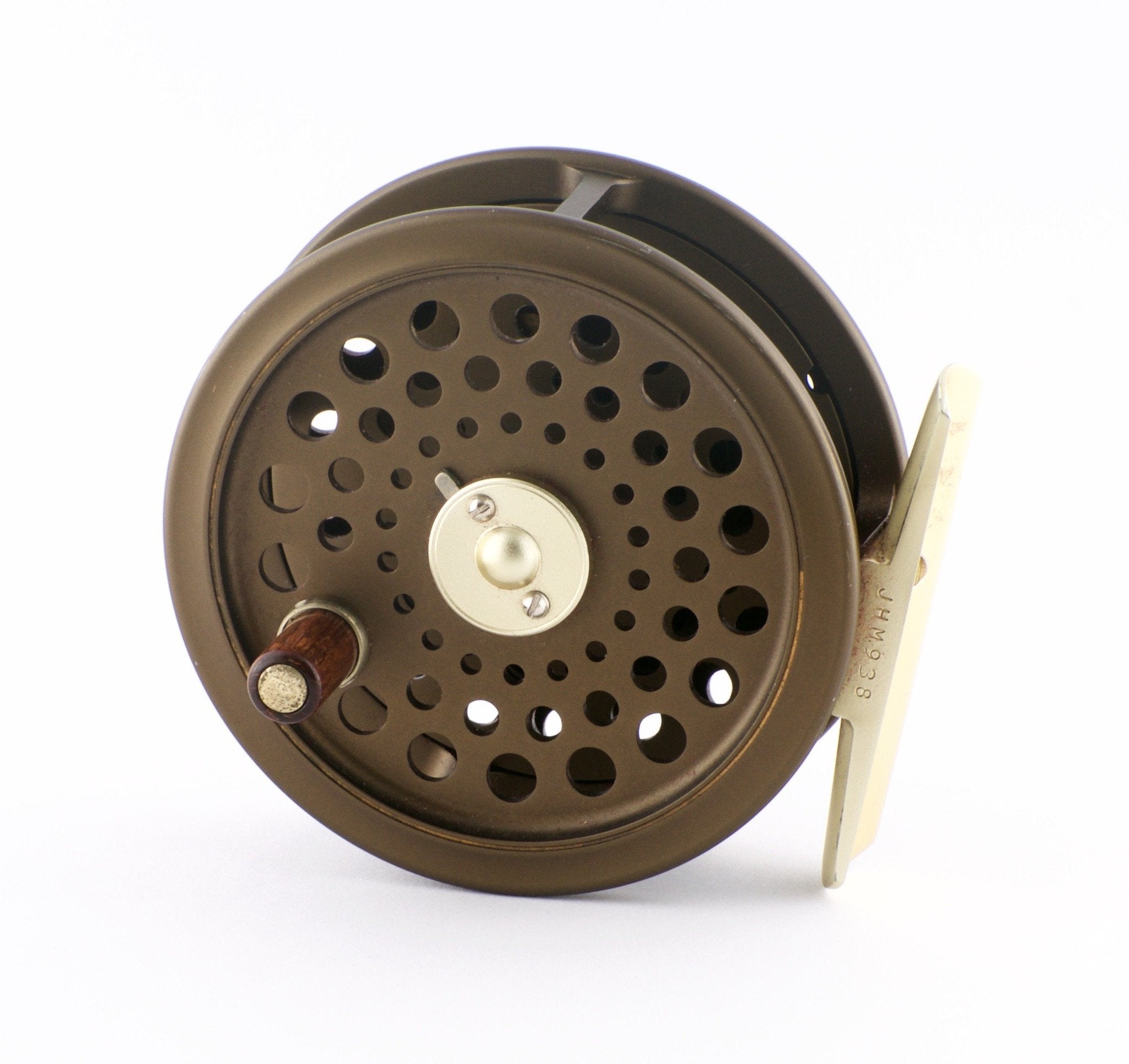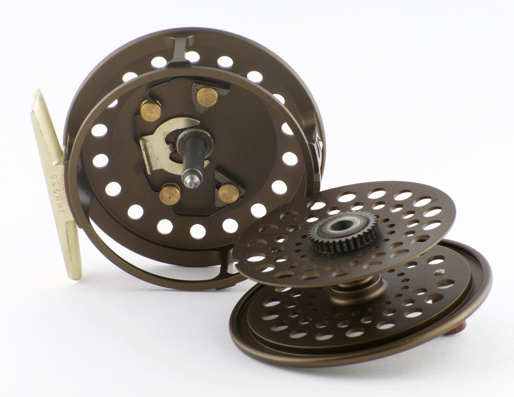 For sale here is a Hardy Golden JLH Ultralite #5 fly reel. Excellent+ condition. The 'JLH' refers to James Laughton Hardy. It features a very wide ranging adjustable spring and pawl drag system, reversible for either left or right hand retrieve by simply engaging the correct pawl and flipping over the nickel silver line guard. The Golden JLH is an updated version of the original stove-enameled JLH reel with a deeper and smoother bronze anodized finish. Line capacity WF5+80 or DT5 backing+50. 3 inch diameter.