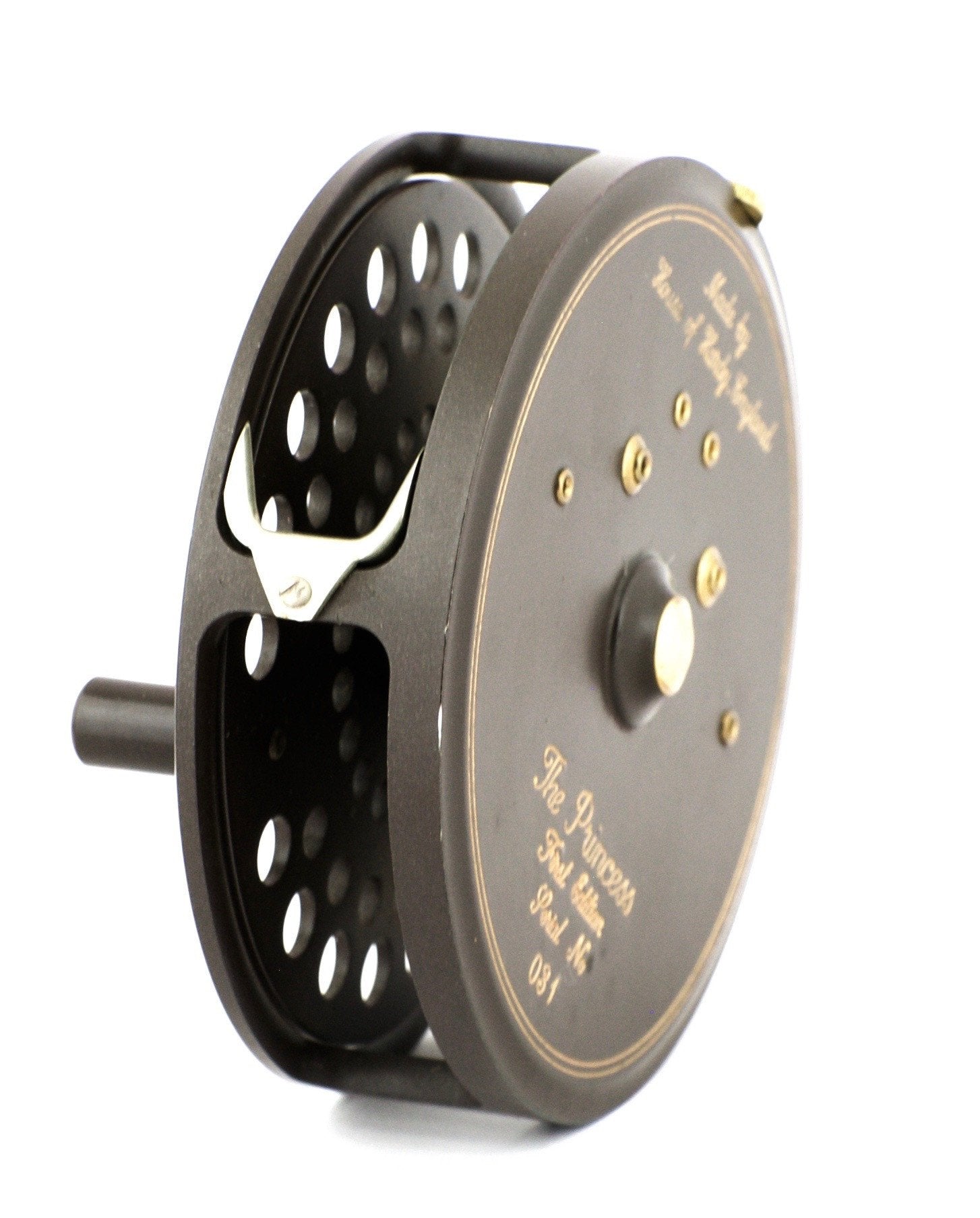 For sale here is a Hardy Golden Princess fly reel in excellent+ condition. One-screw reversible lineguard - easily flipped as are the pawls for RHW or LHW use. Solid and tight as they come. Very minor cosmetic marks only. Tensioner works great. Comes with original Hardy box and slightly oversized Hardy zippered case that doesn't fit in the box. Diameter 3 1/2". The Princess reels hold up to a DT7+50, or DT6+70.