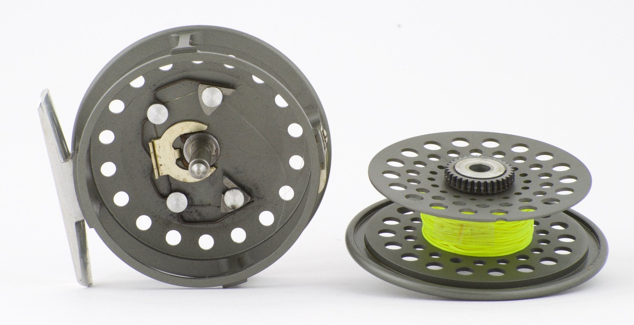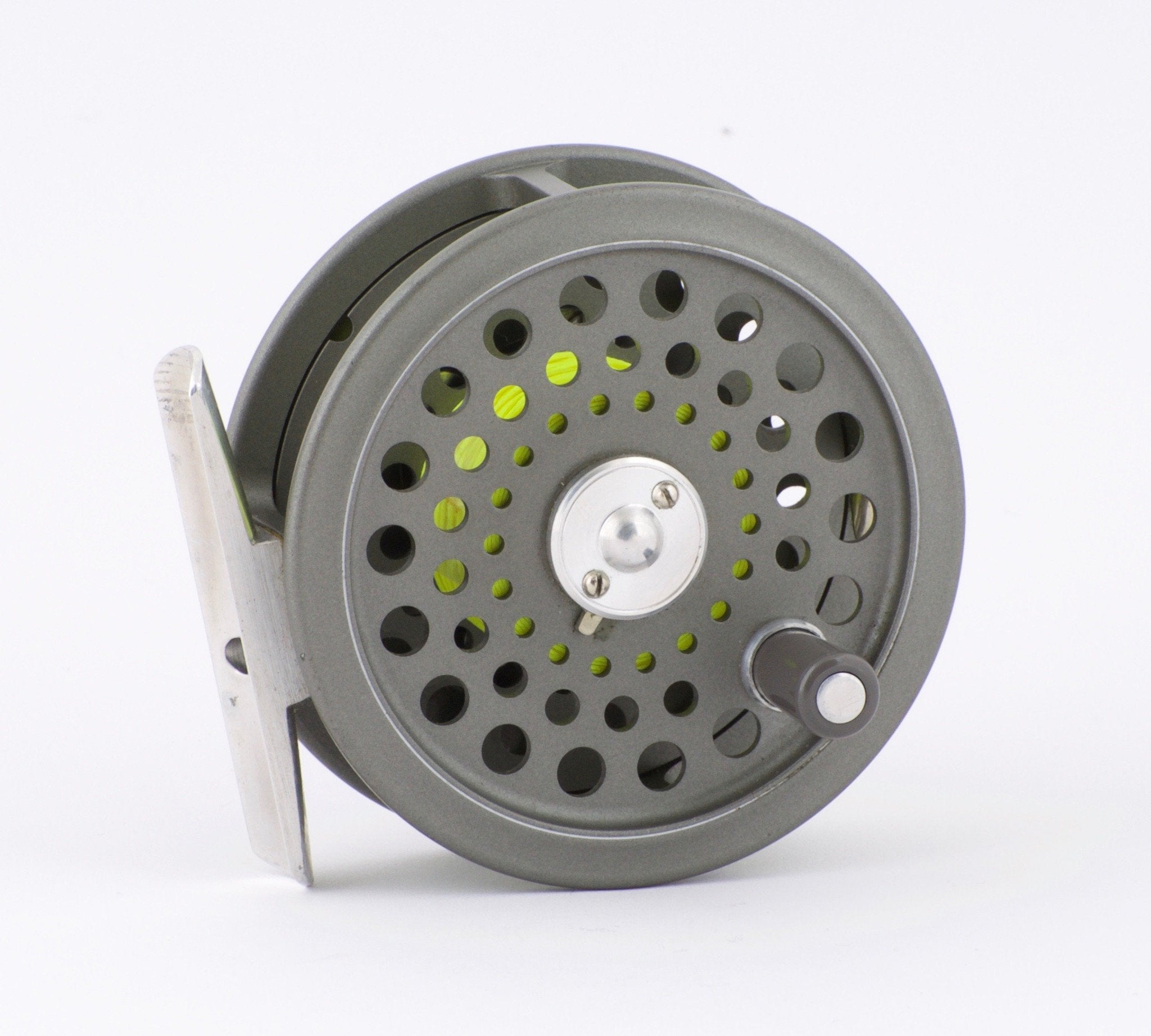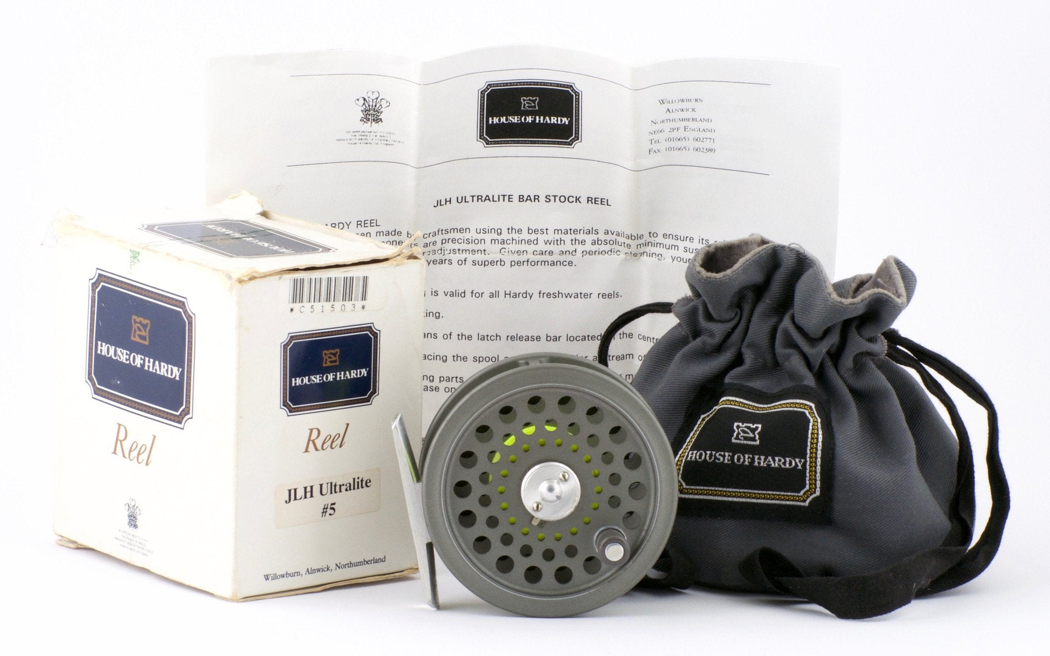 For sale here is a Hardy JLH Ultralite #5 fly reel. Excellent+ condition. The 'JLH' refers to James Laughton Hardy. It features a very wide ranging adjustable spring and pawl drag system, reversible for either left or right hand retrieve by simply engaging the correct pawl and flipping over the nickel silver line guard. Line capacity WF5+80 or DT5 backing+50. 3 inch diameter. Comes with original reel pouch, box, and paperwork.